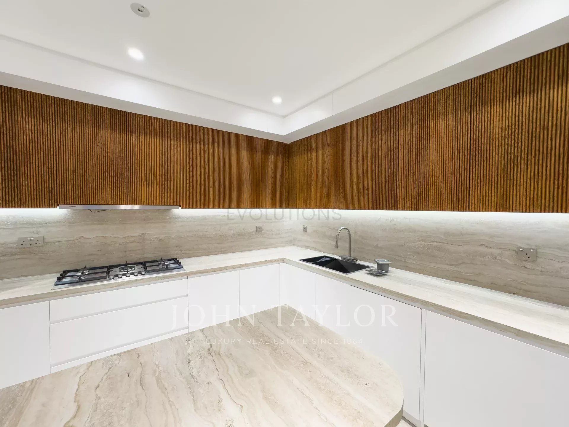 Cocina moderna: Cocina de alta gama totalmente equipada con electrodomésticos integrados, que ofrece un amplio espacio de encimera y almacenamiento para el chef casero.