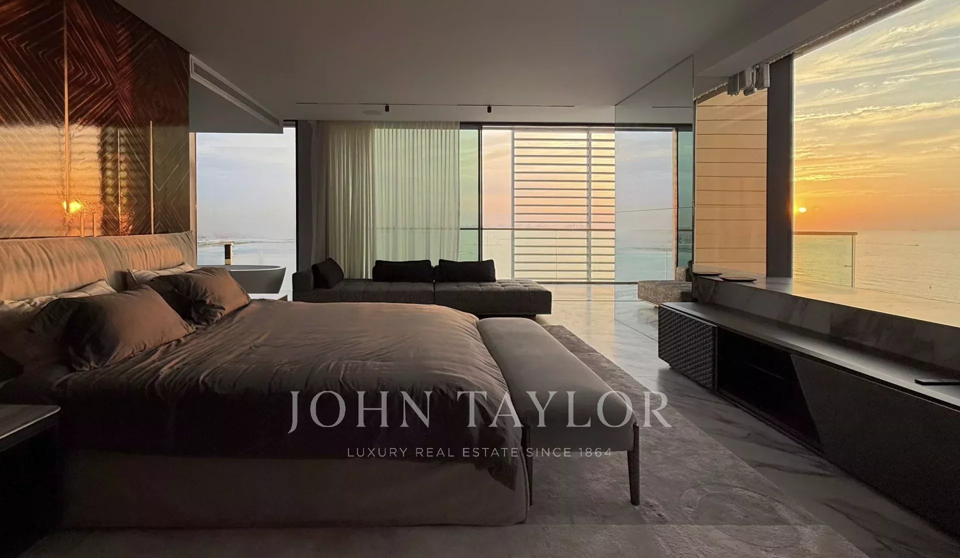 Segundo dormitorio principal en el nivel inferior con vistas a la puesta de sol y terraza privada