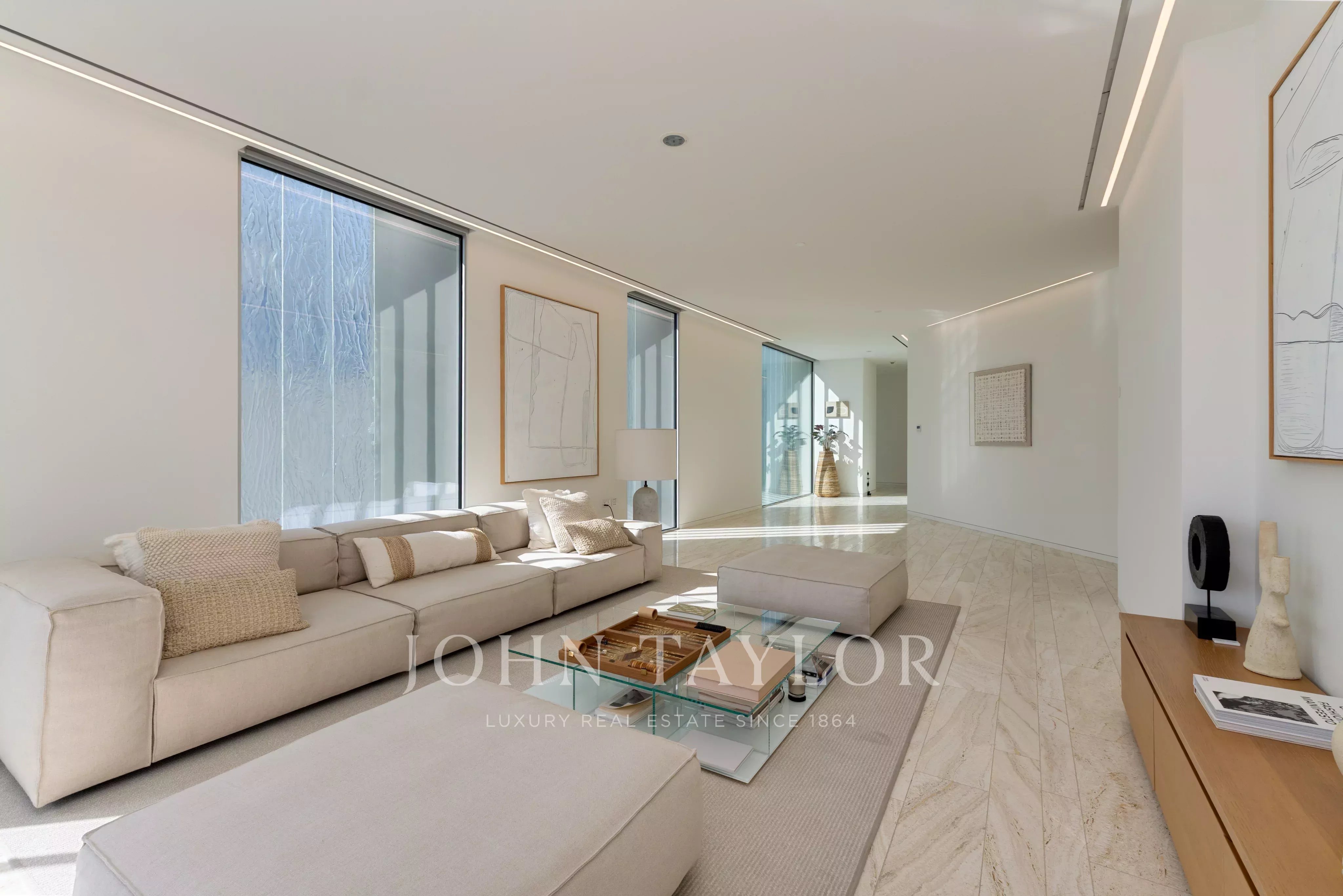 Los cuatro dormitorios privados están cuidadosamente distribuidos para seguir rindiendo homenaje a la arquitectura, que aúna apertura e intimidad. La suite principal ofrece un refugio sereno con un amplio vestidor y un lujoso baño privado con bañera y ducha separada. Los otros tres dormitorios son generosos en proporciones y también tienen sus propios cuartos de baño. Todos los dormitorios están diseñados para disfrutar de luz natural y acceso a terrazas, lo que favorece la distribución diáfana del conjunto. Los espacios de apoyo incluyen un cuarto de servicio con su propia zona de servicio. Esta residencia ofrece tres plazas de aparcamiento y la opción de ser amueblada bajo un paquete.