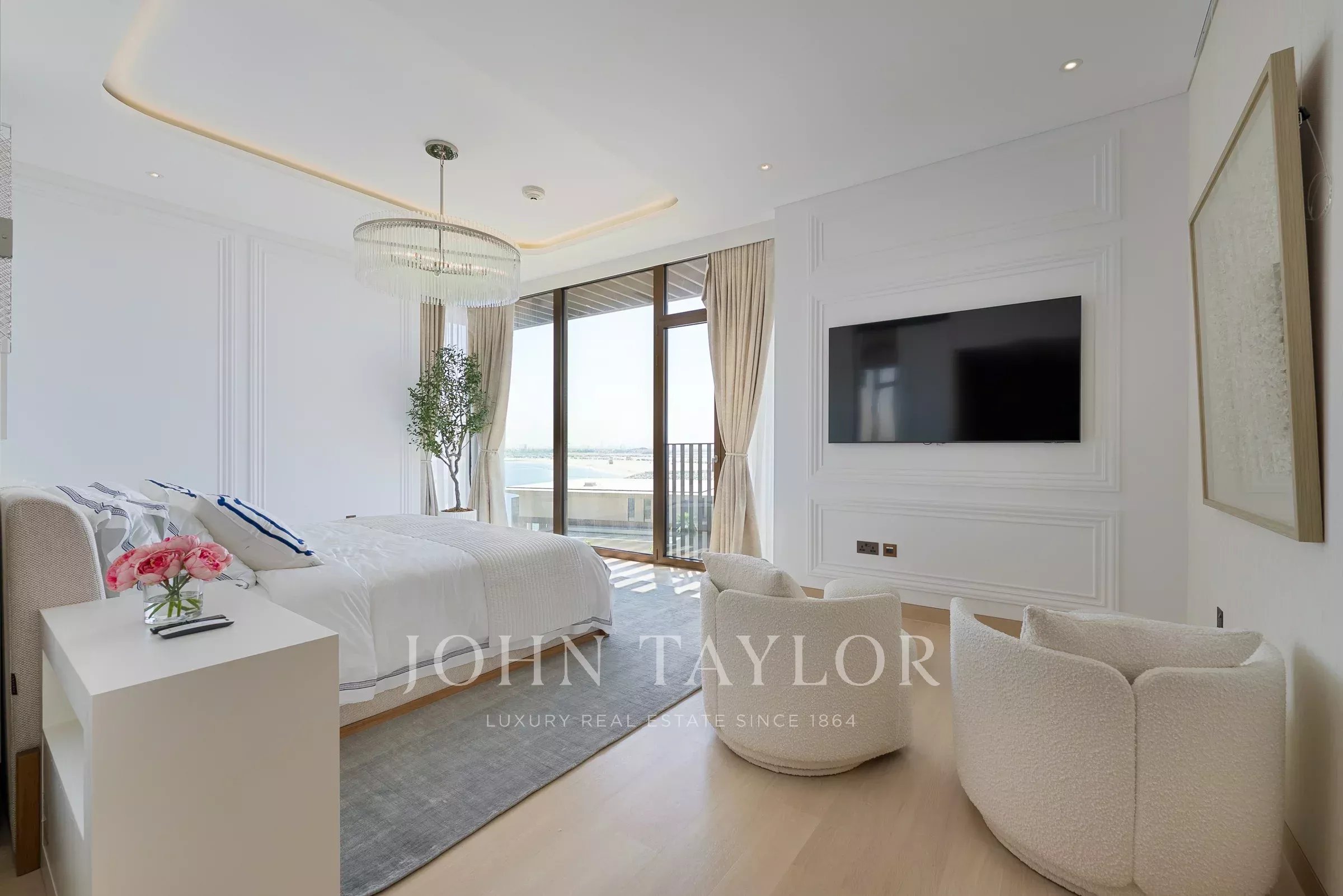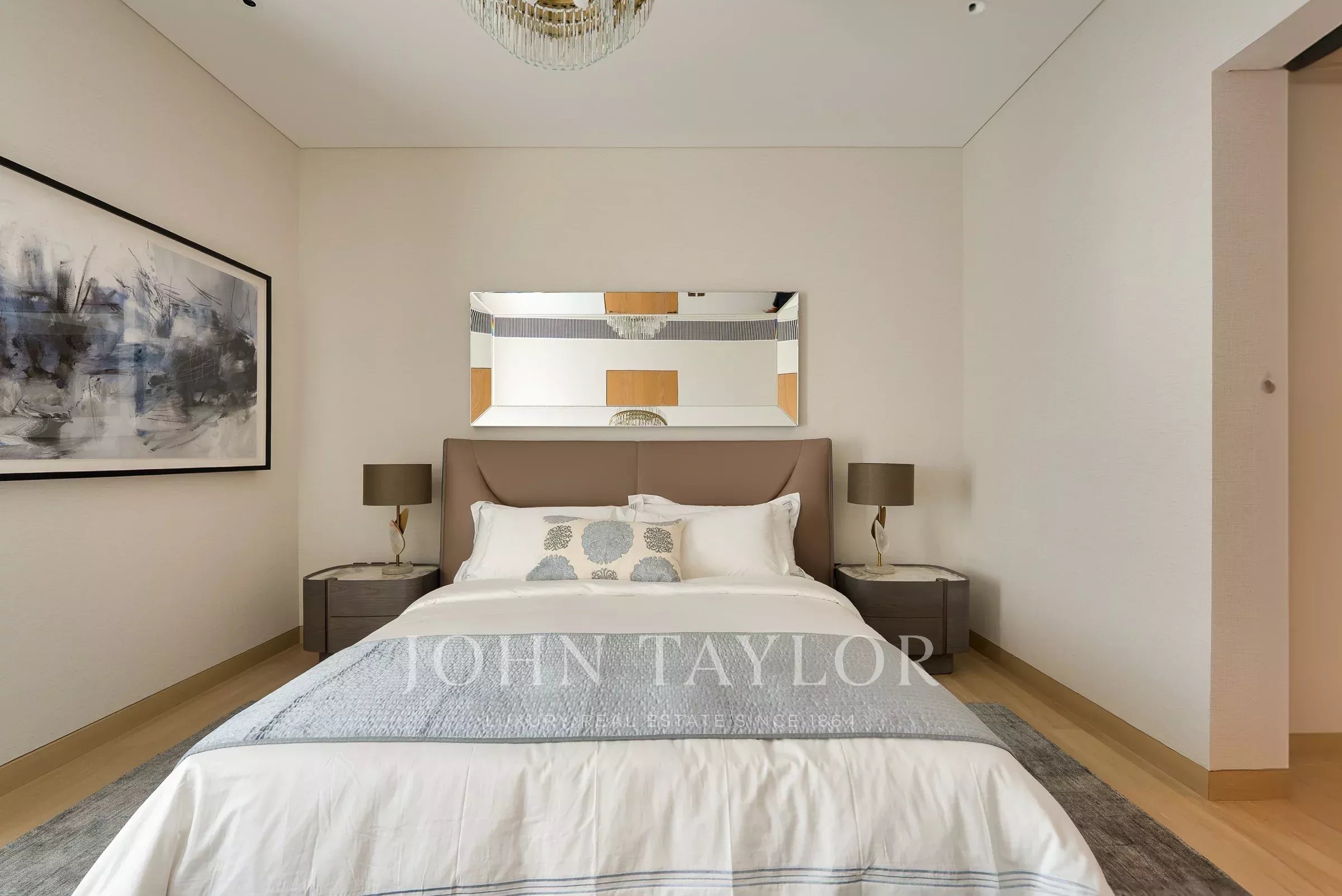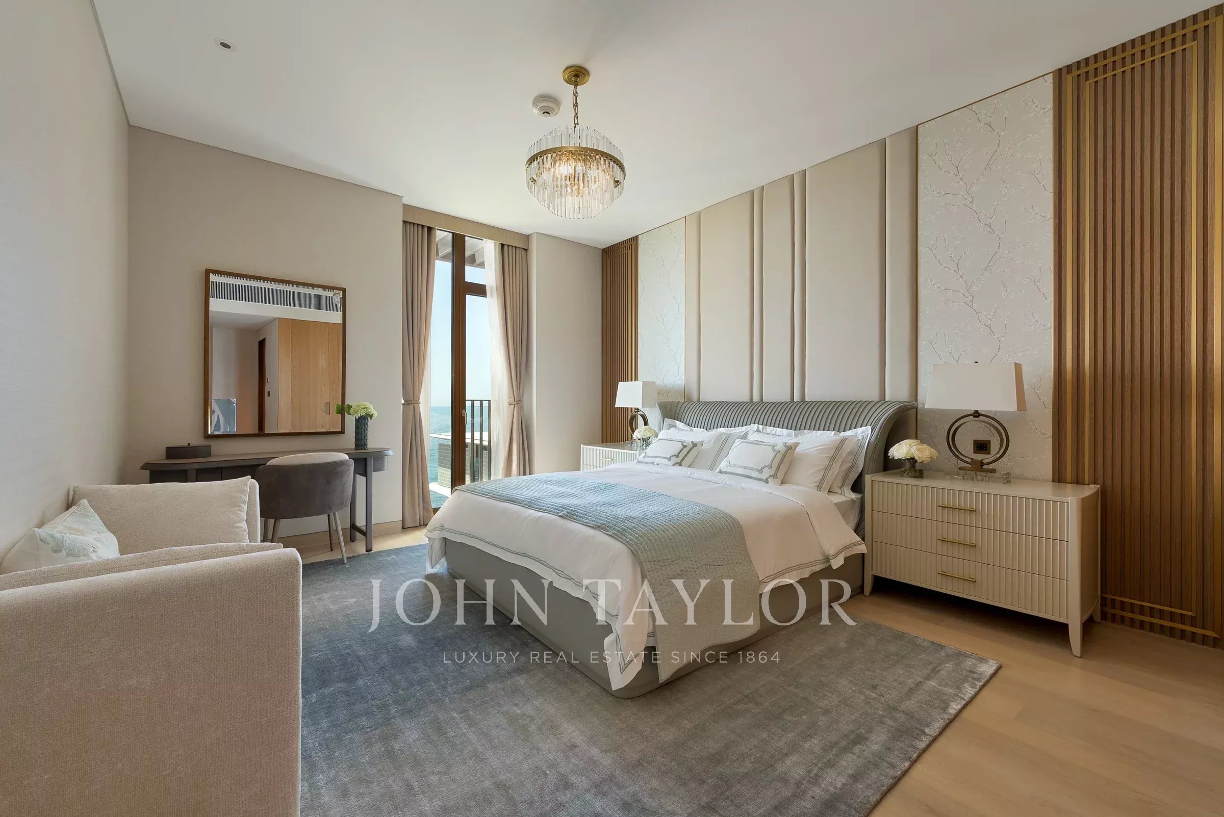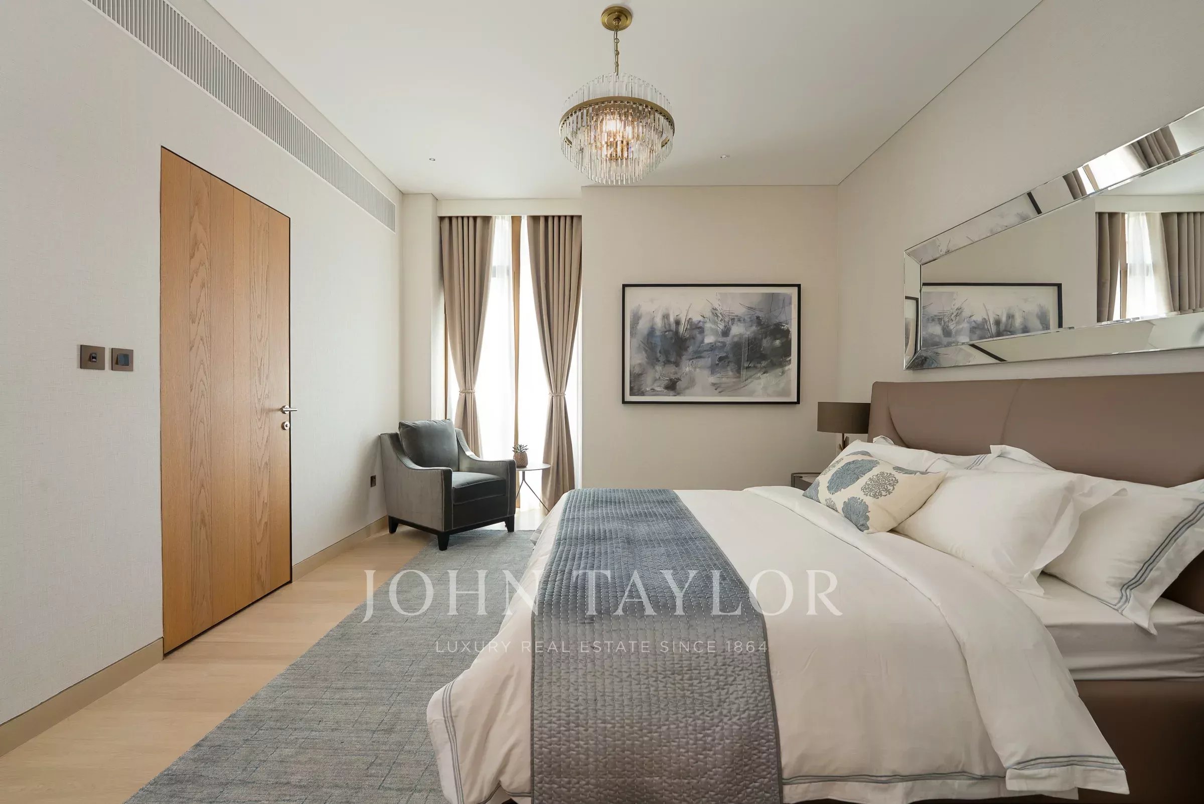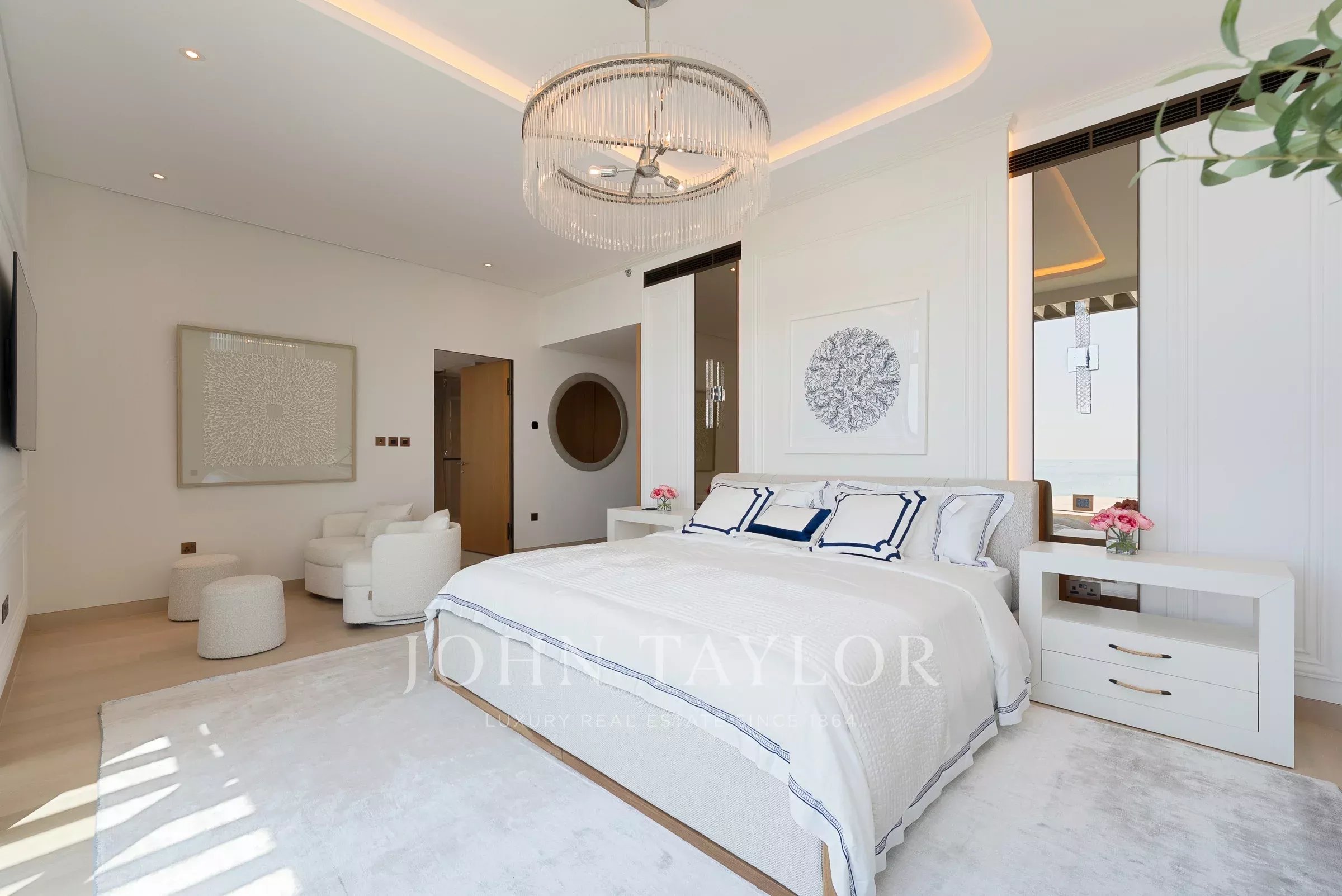 Un pasillo conduce a la espaciosa habitación principal con su vestidor, un baño principal bien equipado con lavabos dobles y bañera. Las habitaciones adicionales son de tamaño generoso, cada una con su propio baño en suite.