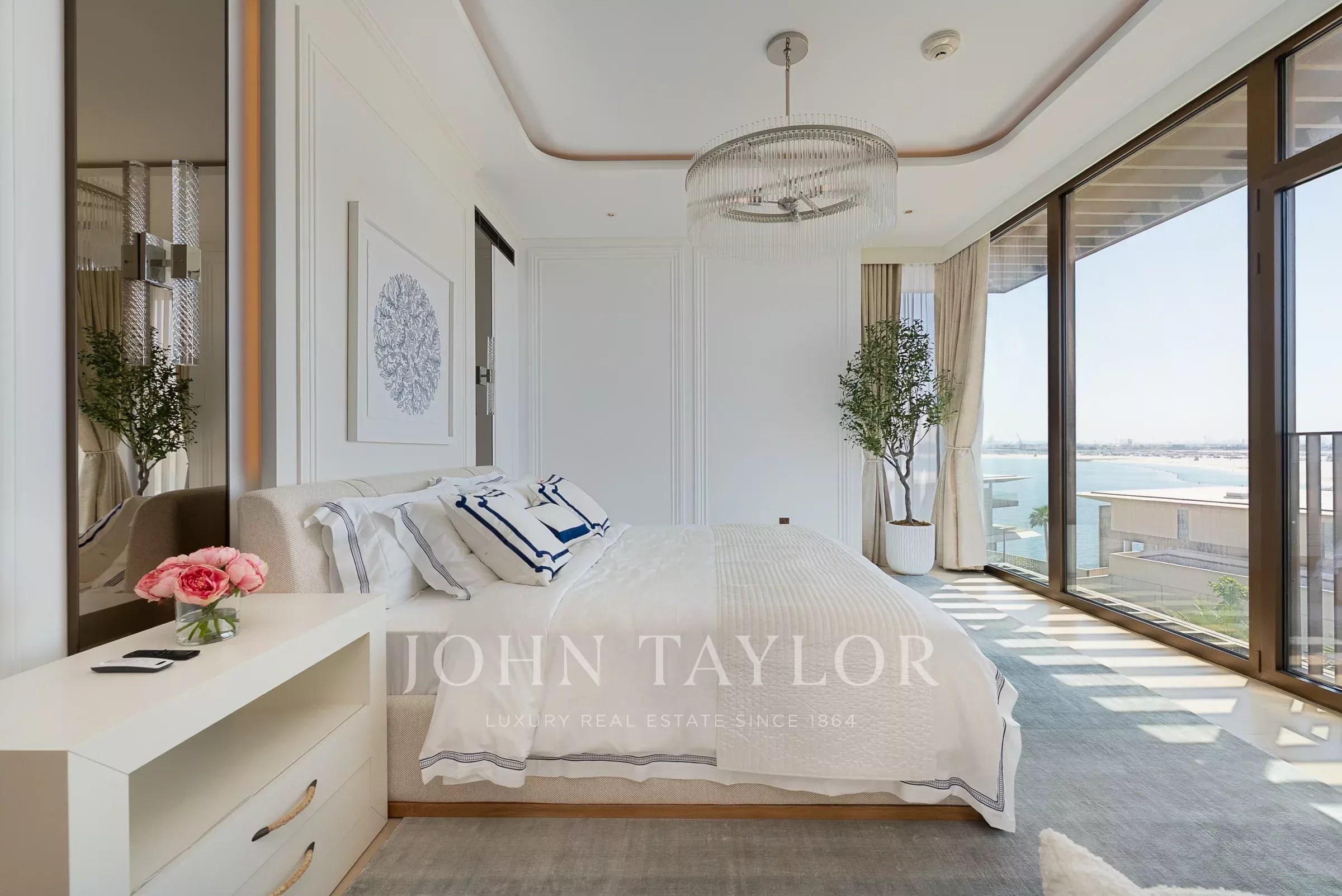 Con una superficie de 3,168 pies cuadrados, este apartamento en Bulgari Residences llega completamente amueblado. Estilizado en tonos neutros de blanco, beige y azul, la vivienda presenta un acogedor retiro junto al mar con vistas a la marina.
