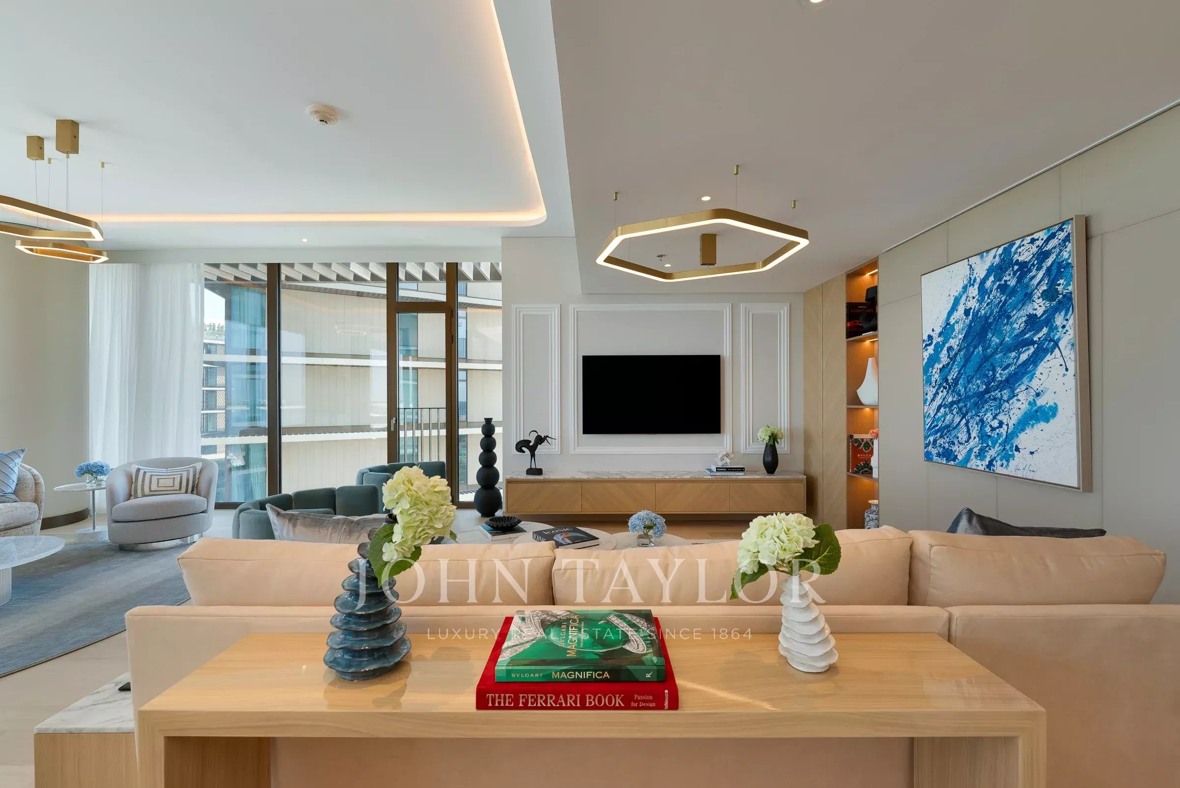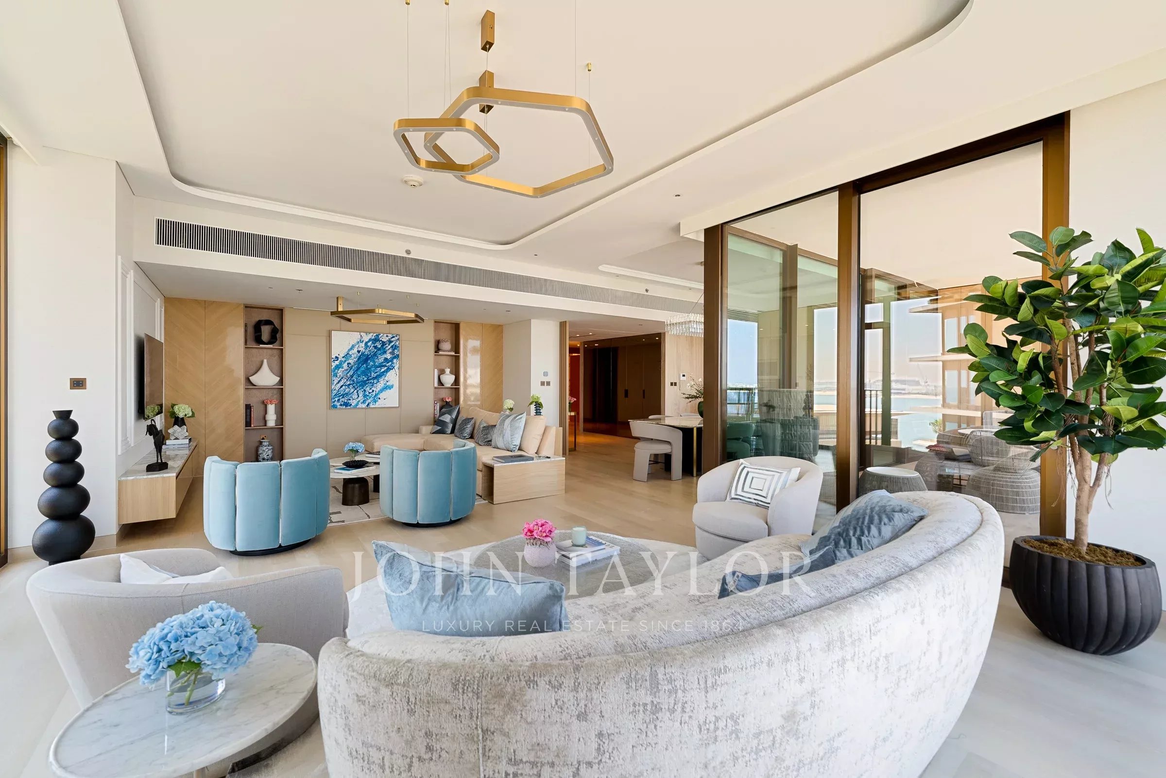 La sala de estar está diseñada para maximizar la comodidad y la conversación, con espacio amplio para grandes arreglos de asientos y acceso directo a una terraza generosa. Al lado de esto, hay un comedor formal perfecto para reuniones sociales.