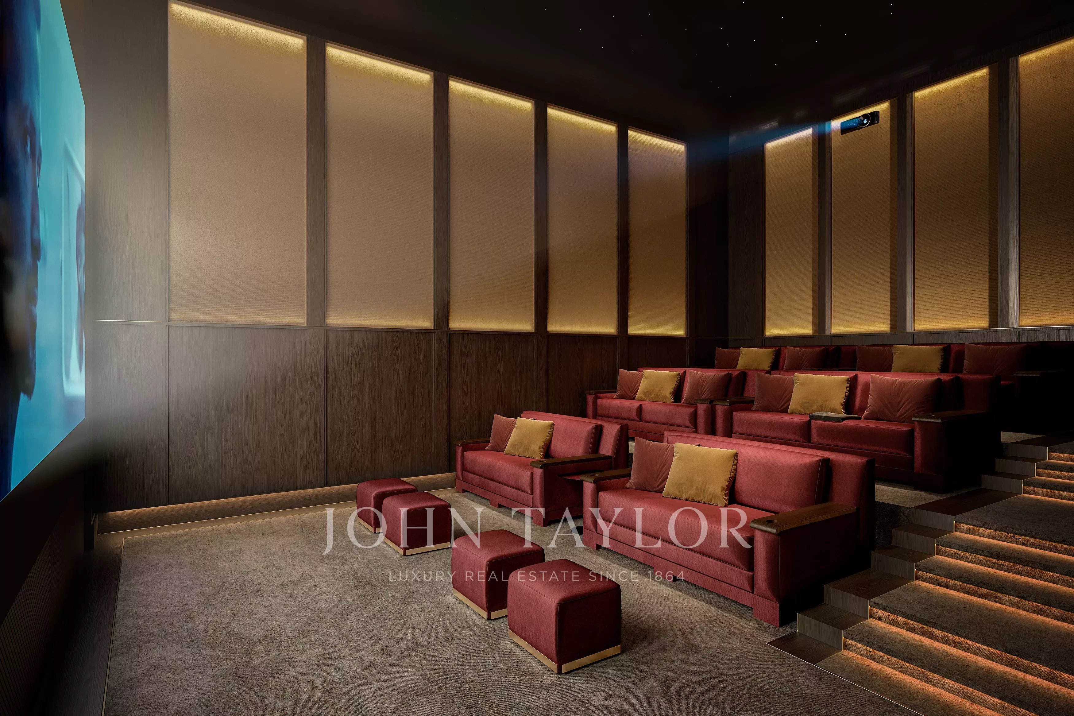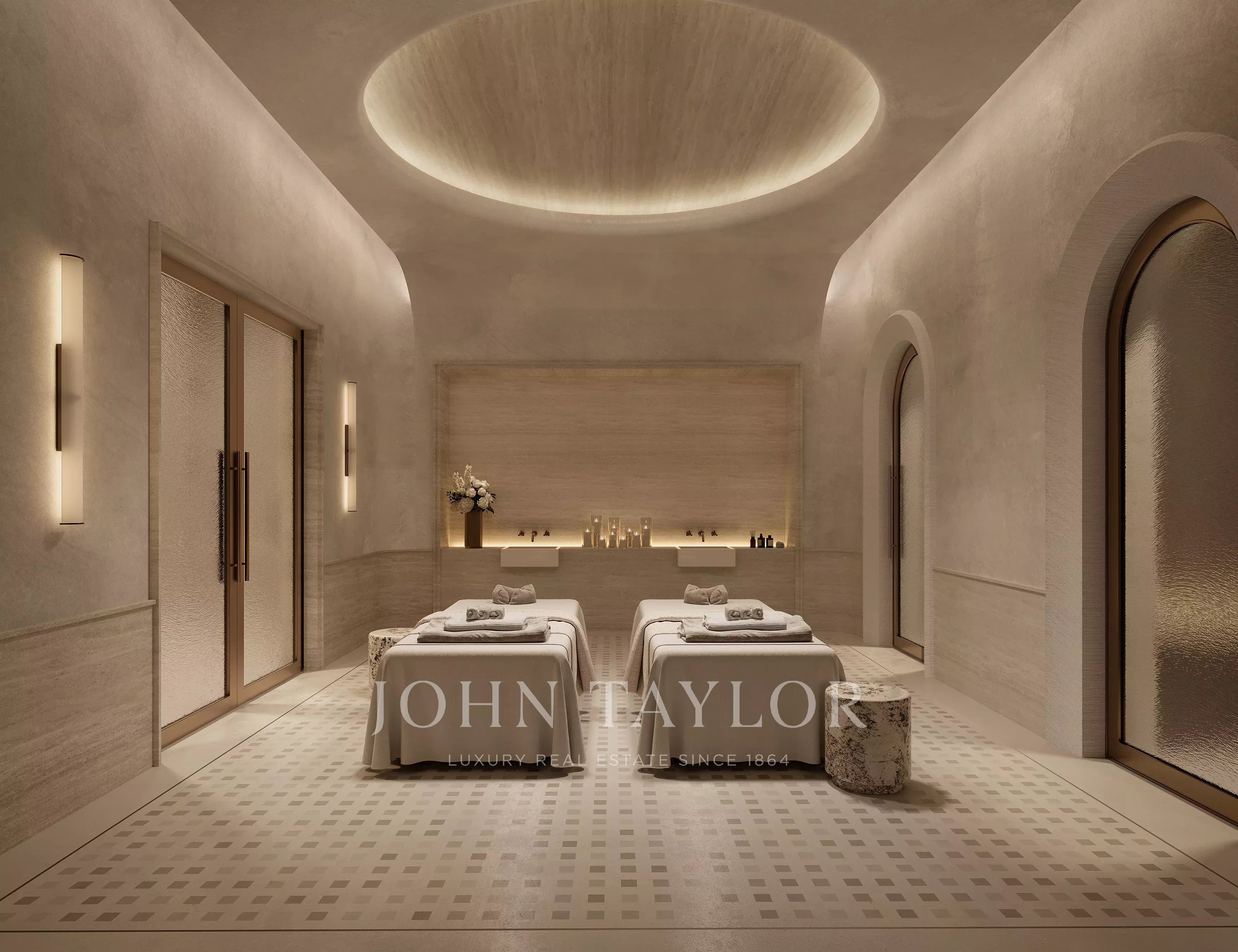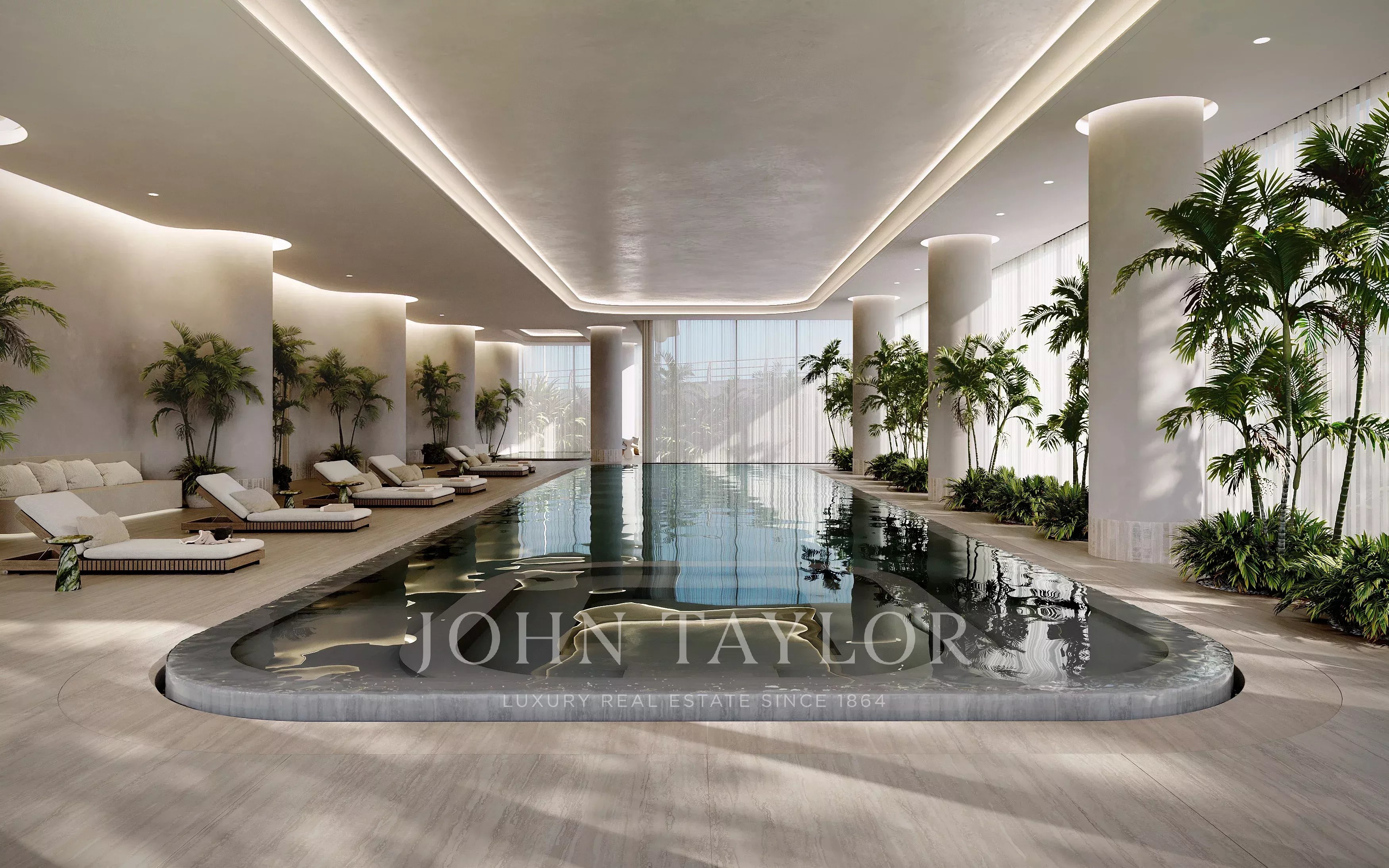 Al entrar por el vestíbulo privado del ascensor y a través del pasillo, llegará a la zona de estar principal, que cuenta con zonas de estar de doble altura con vistas desde el suelo hasta el techo de hasta 6 metros. Los interiores presentan una cuidada mezcla de piezas modernas y coleccionables, creando un rico contraste con los espacios elegantes y minimalistas.
