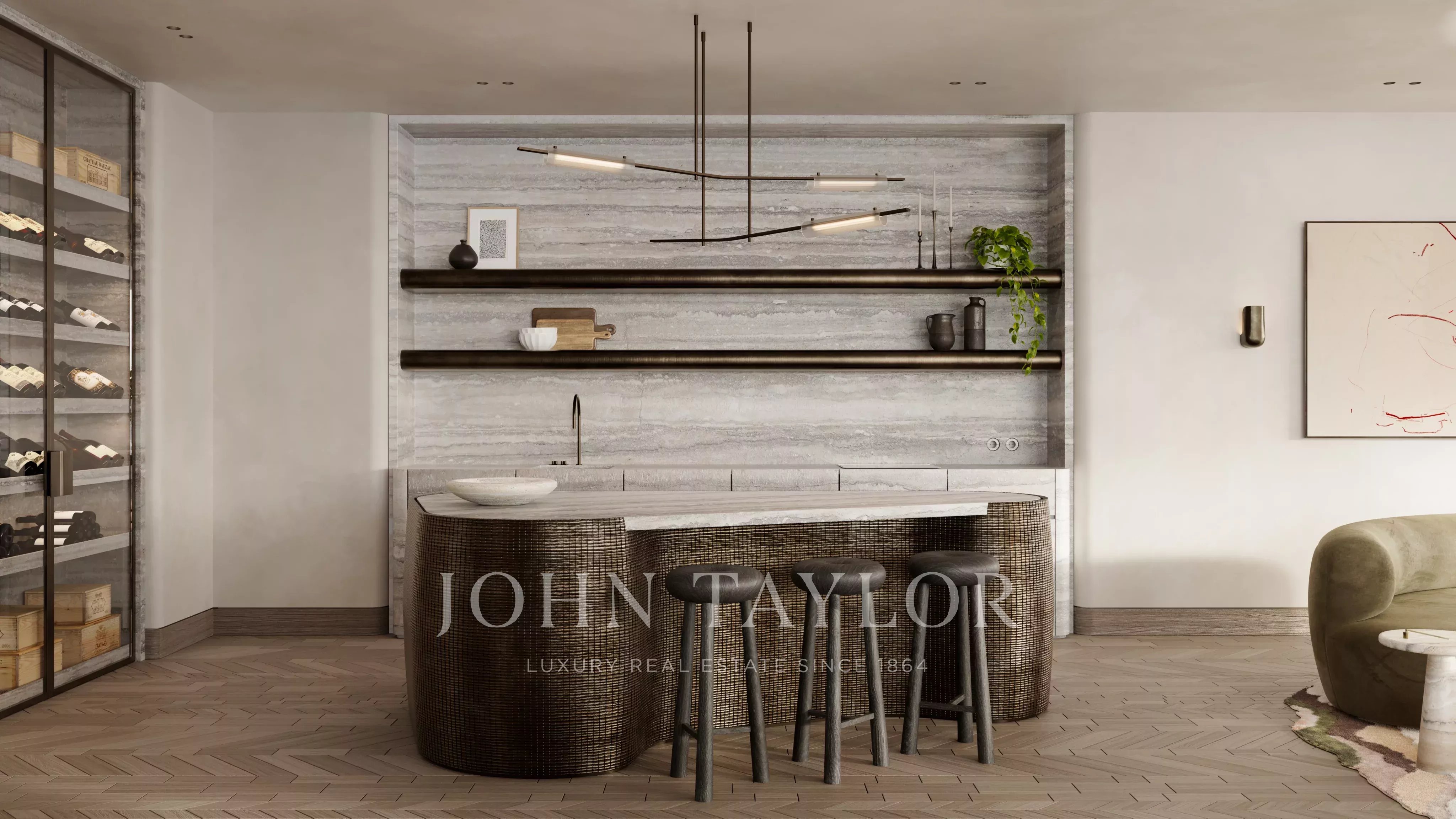 La cocina está presidida por una isla con base de bronce martillado y encimera de travertino plateado. Los armarios, los salpicaderos y las estanterías están revestidos de travertino plateado, creando una presencia monolítica y sin juntas. A la izquierda, la bodega se integra en la pared del fondo con estanterías superpuestas y profundidad. Por encima, un colgante escultural proyecta una luz suave, mientras que el suelo de parqué de roble dota al espacio de calidez y textura. Se apoya en una cocina trasera. La zona de estar también cuenta con un tocador.