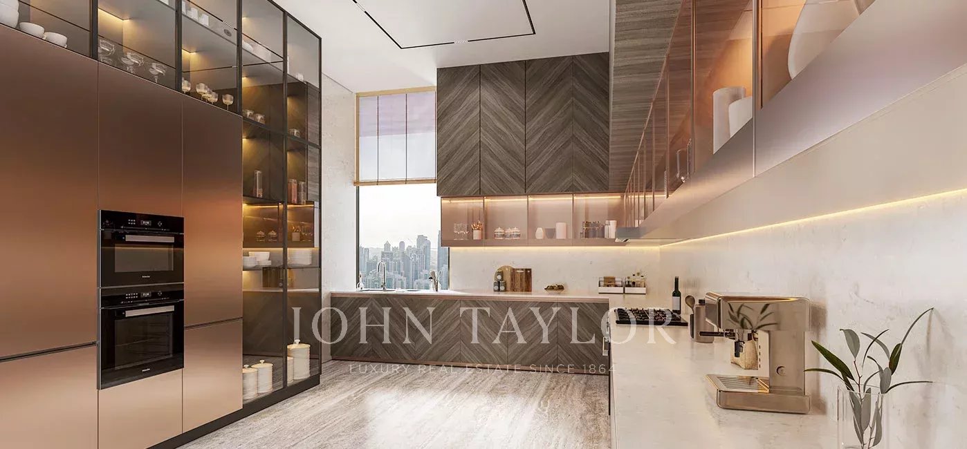 La cocina piloto se entrega con electrodomésticos Miele o equivalentes y se complementa con una cocina húmeda independiente. Esta configuración de doble cocina permite una perfecta recepción, manteniendo la practicidad para la vida cotidiana.