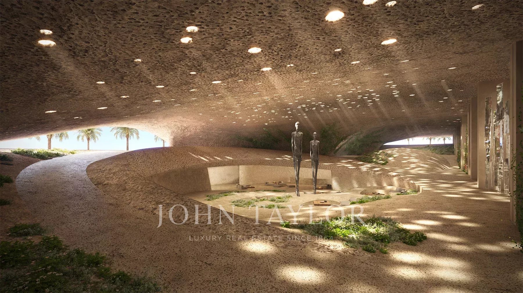● Club de bienestar subterráneo Dune con piscinas experienciales, sauna, sala de vapor, salas de tratamiento, gimnasio y estudio polivalente.