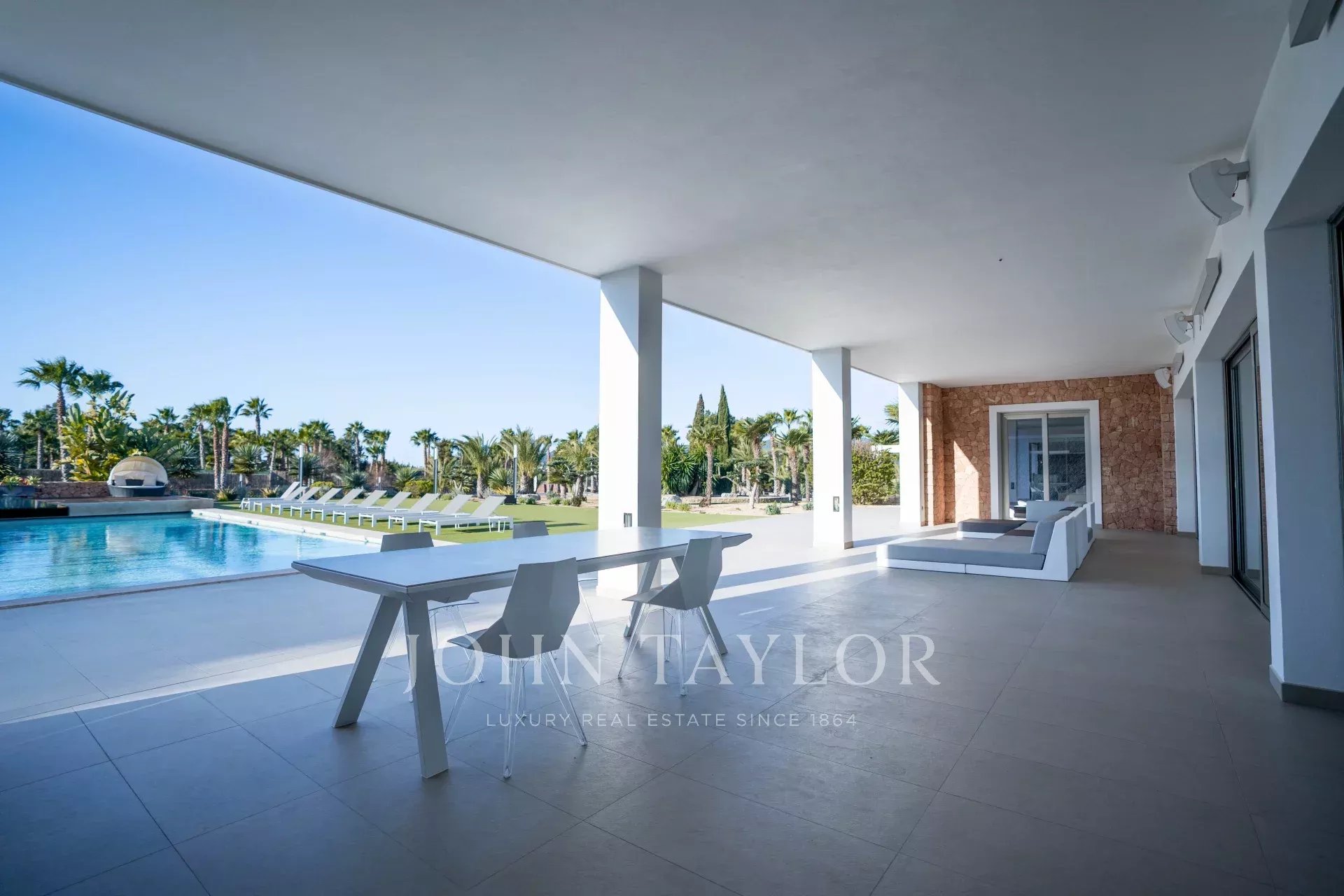 Esta lujosa villa se encuentra inmersa en un amplio jardín que cuenta con una piscina y una terraza, además de una casa de huéspedes, una zona de barbacoa, un gimnasio y un mini club, entre otros servicios.