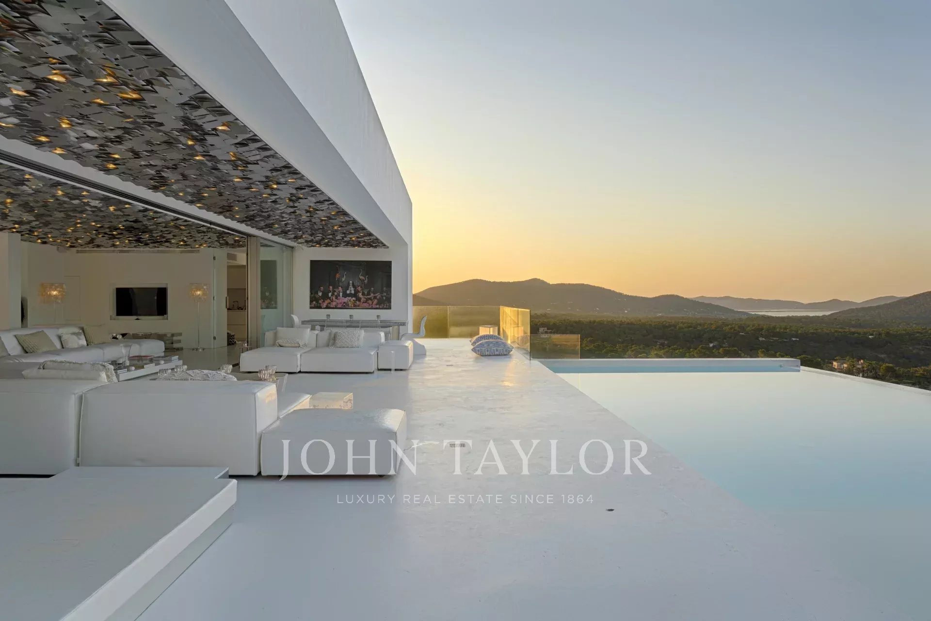 Elegante residencia ubicada en el distinguido condominio de Vista Alegre, una de las comunidades cerradas más prestigiosas de Ibiza, caracterizada por su seguridad y vigilancia las 24 horas del día. Estratégicamente posicionada en lo alto de una montaña, esta propiedad ofrece vistas panorámicas sin igual del resplandeciente mar Mediterráneo, así como de los encantadores paisajes de Formentera y las pintorescas localidades de Es Cubells, Salinas y Porroig.