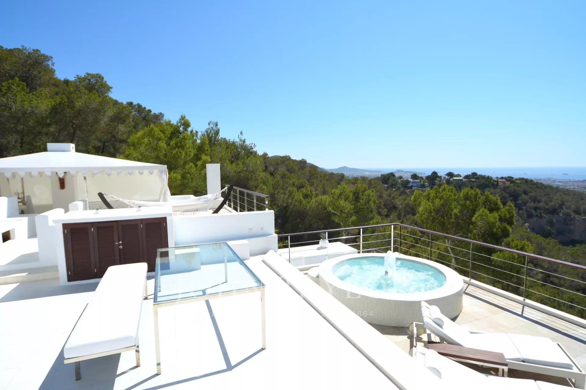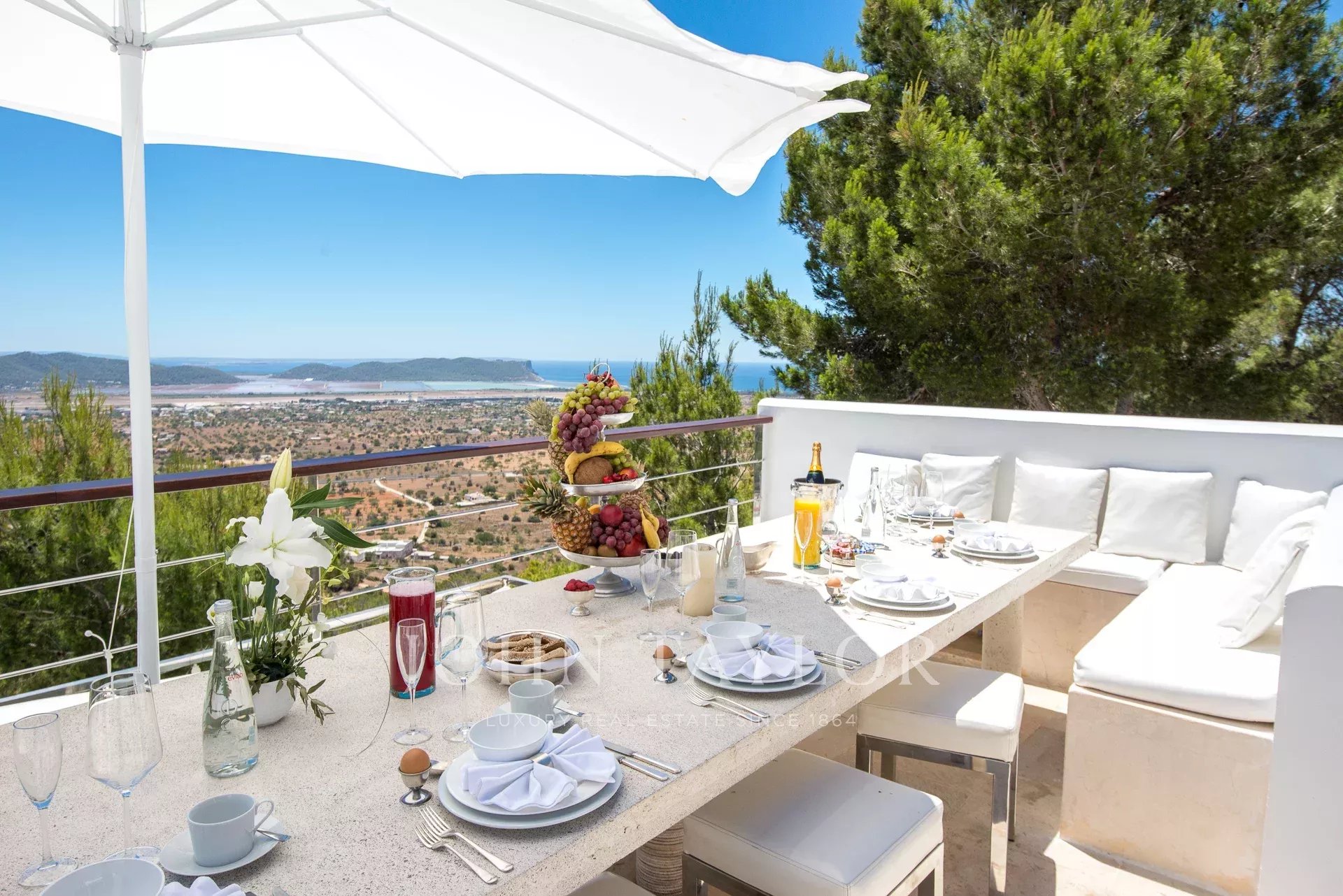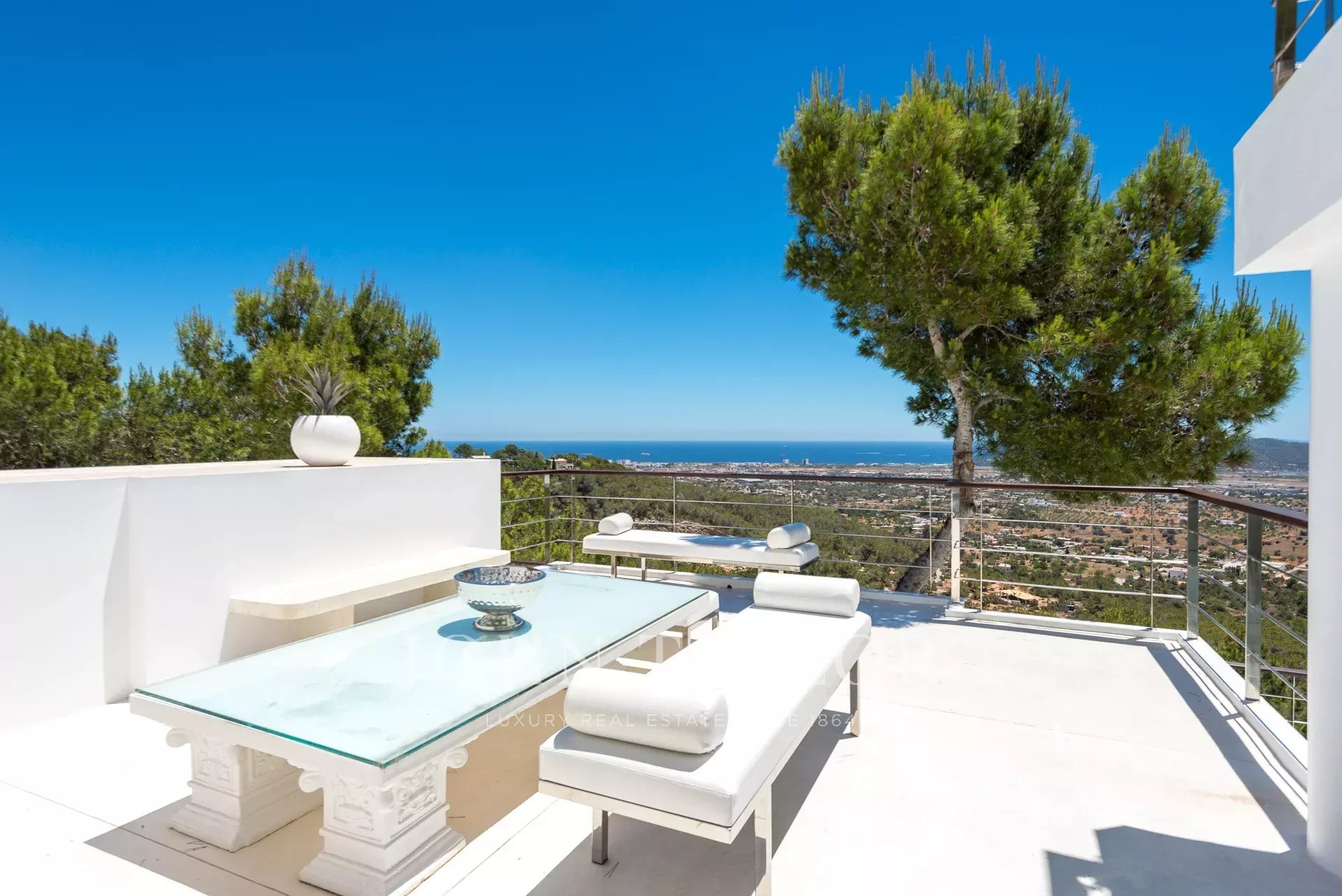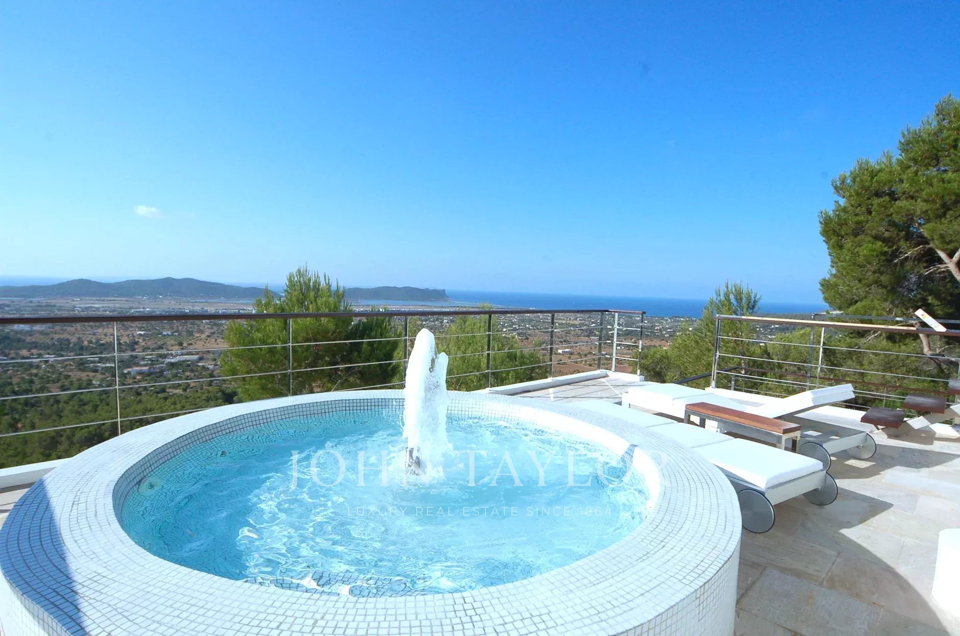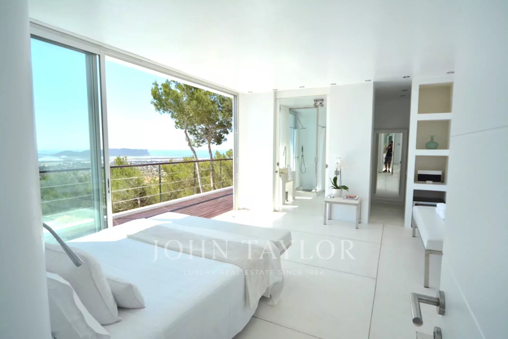 Esta fantástica villa de estilo ultramoderno se encuentra ubicada a tan solo 6km de la ciudad de Ibiza y tiene unas espectaculares vistas panorámicas de 180º (desde el casco antiguo de Ibiza hasta las playas de Salinas, Es Codolar y la isla de Formentera).