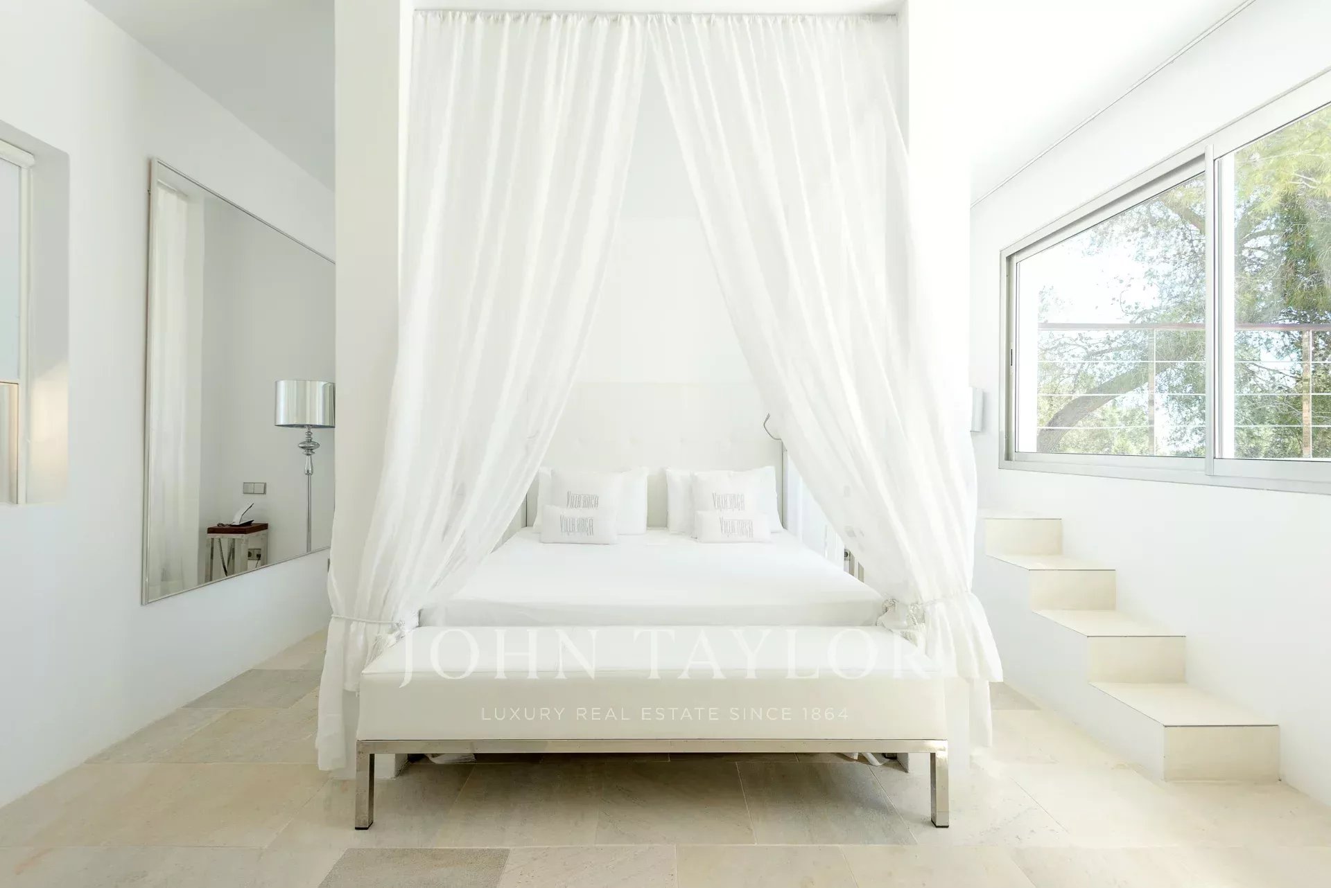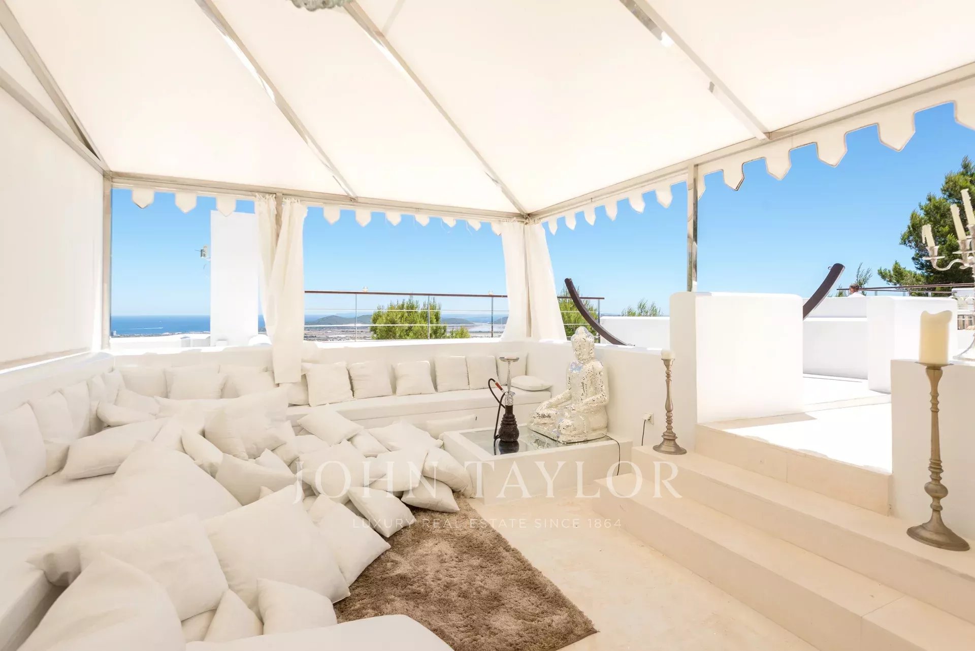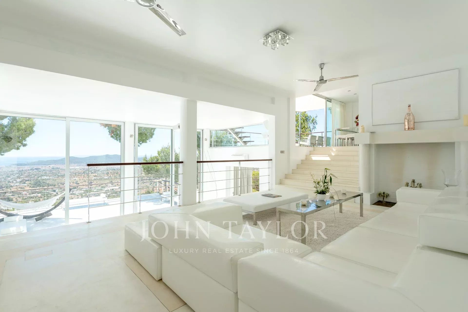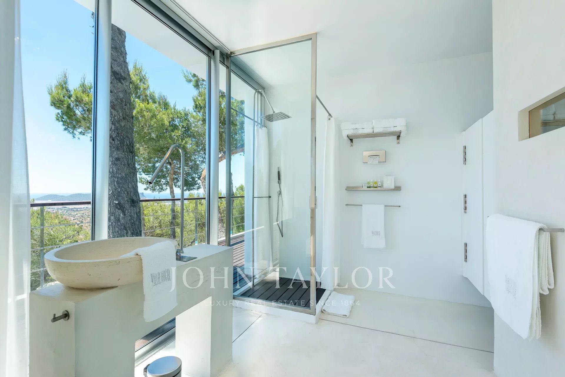 Esta fantástica villa de estilo ultramoderno se encuentra ubicada a tan solo 6km de la ciudad de Ibiza y tiene unas espectaculares vistas panorámicas de 180º (desde el casco antiguo de Ibiza hasta las playas de Salinas, Es Codolar y la isla de Formentera).