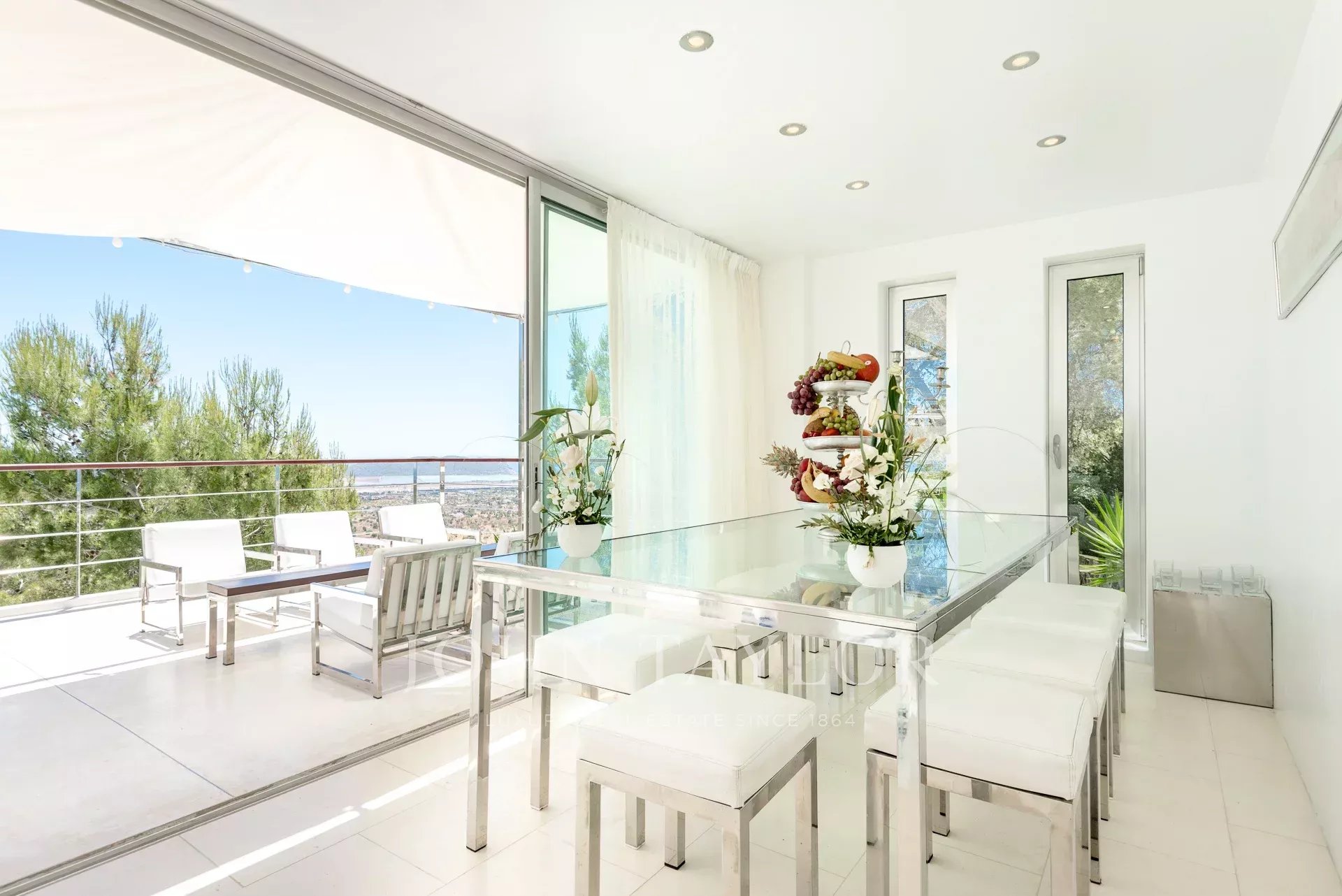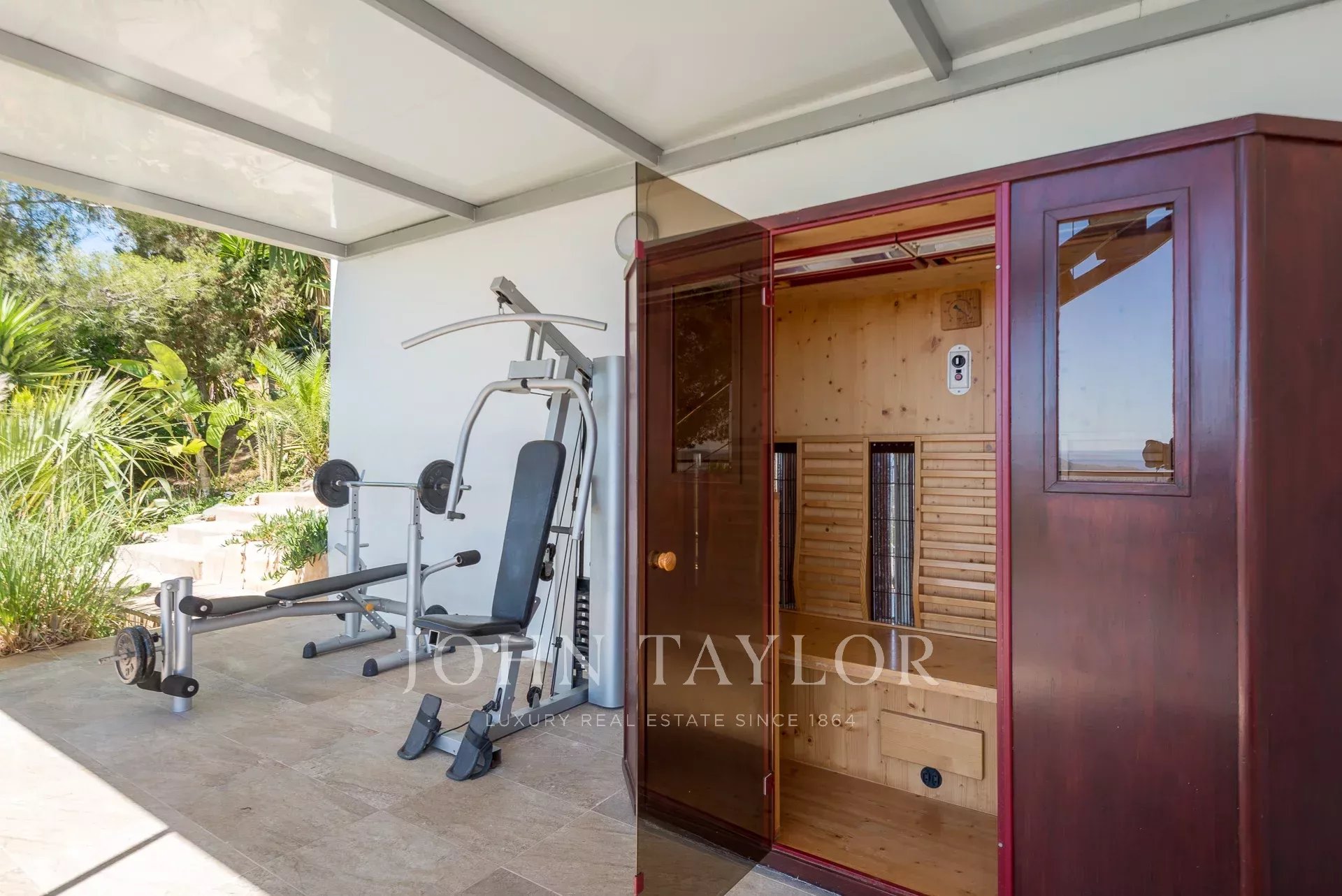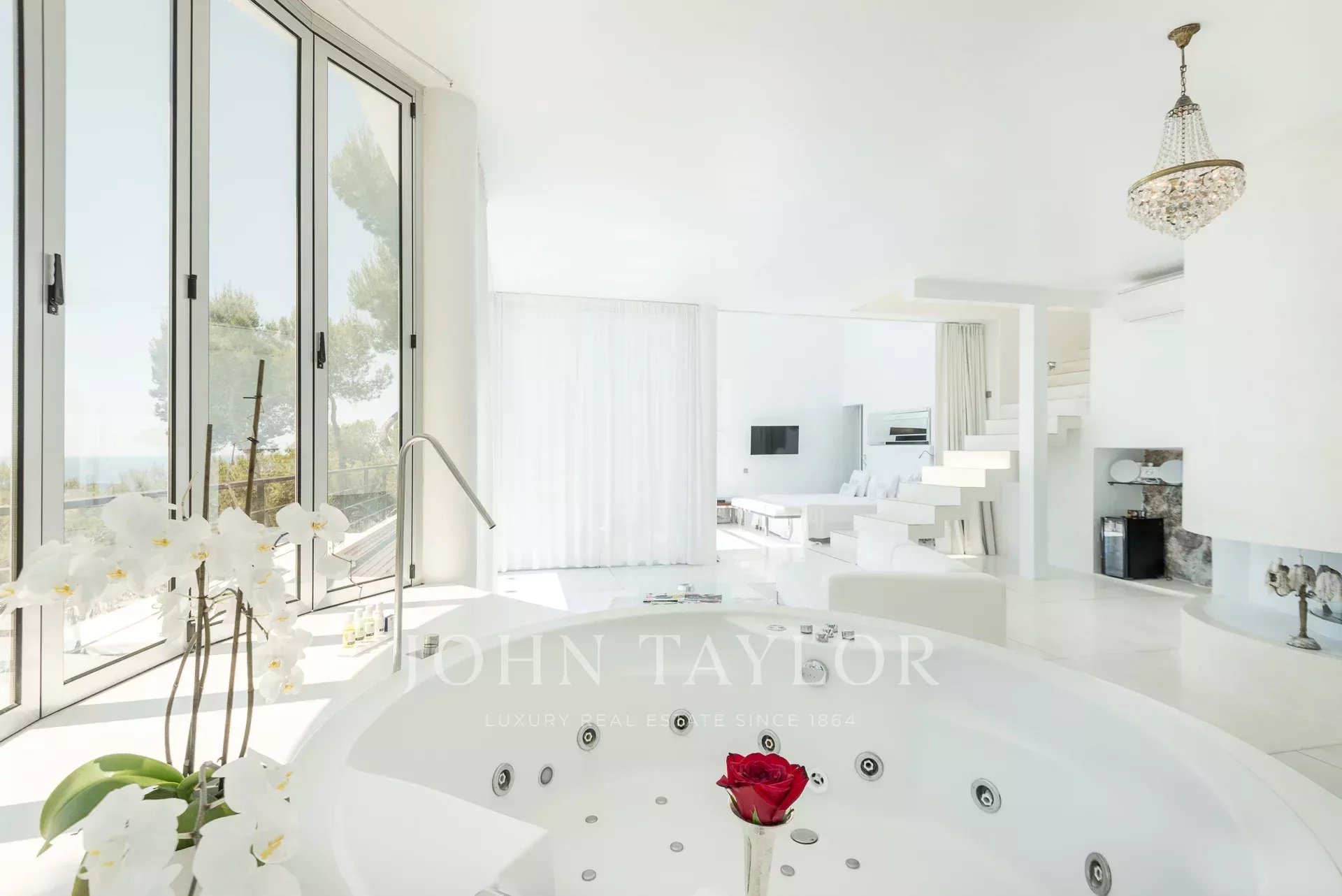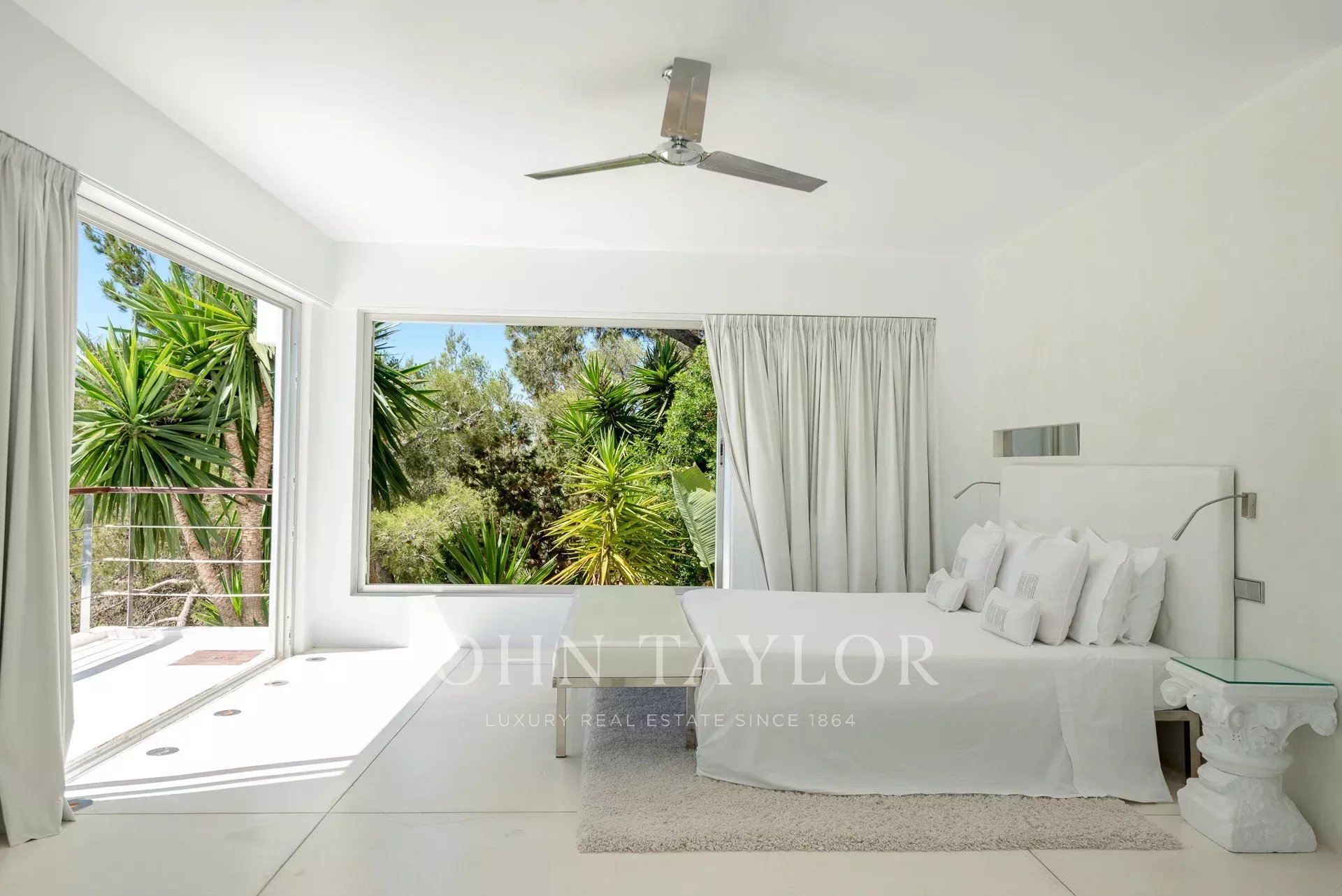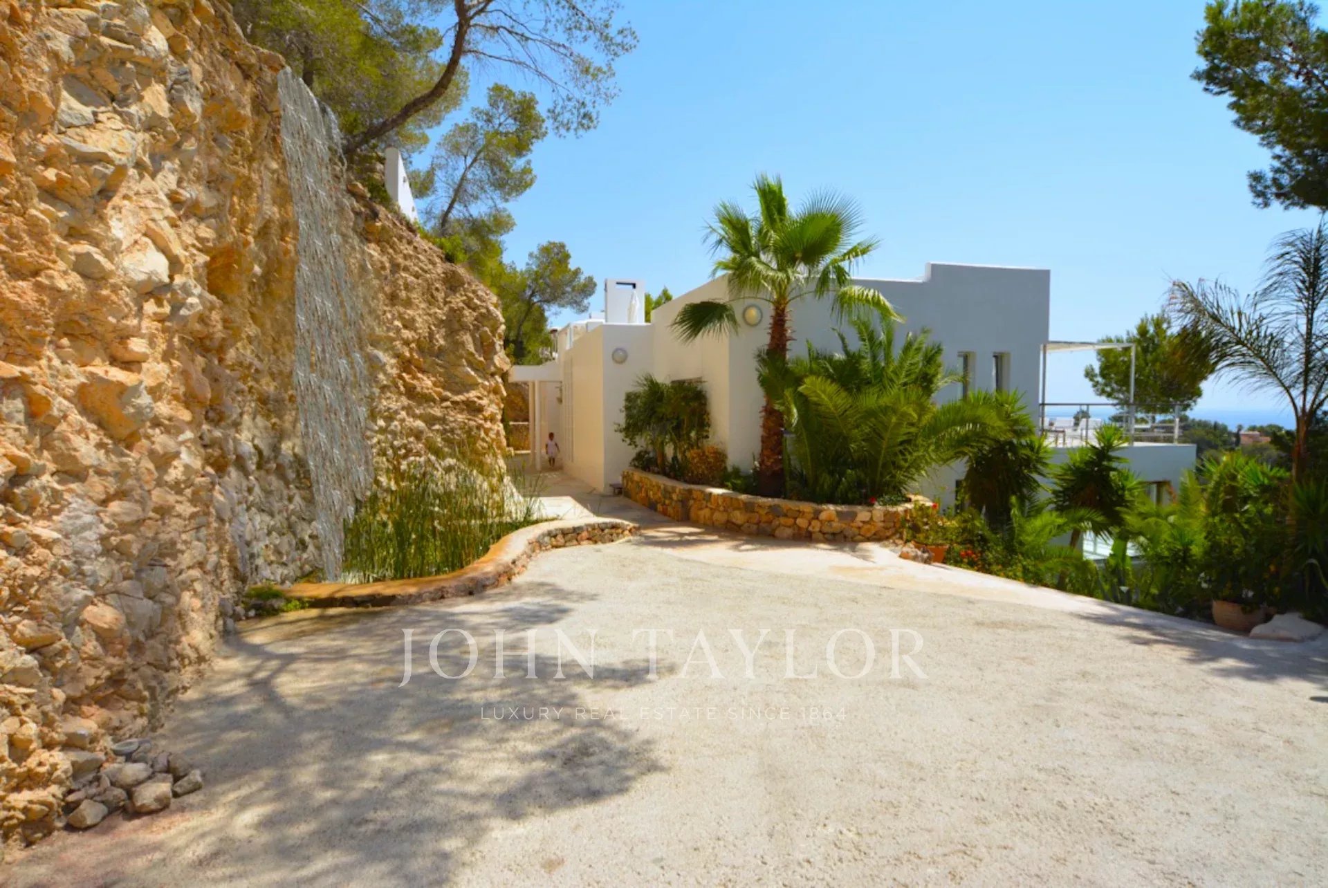 Esta fantástica villa de estilo ultramoderno se encuentra ubicada a tan solo 6km de la ciudad de Ibiza y tiene unas espectaculares vistas panorámicas de 180º (desde el casco antiguo de Ibiza hasta las playas de Salinas, Es Codolar y la isla de Formentera).