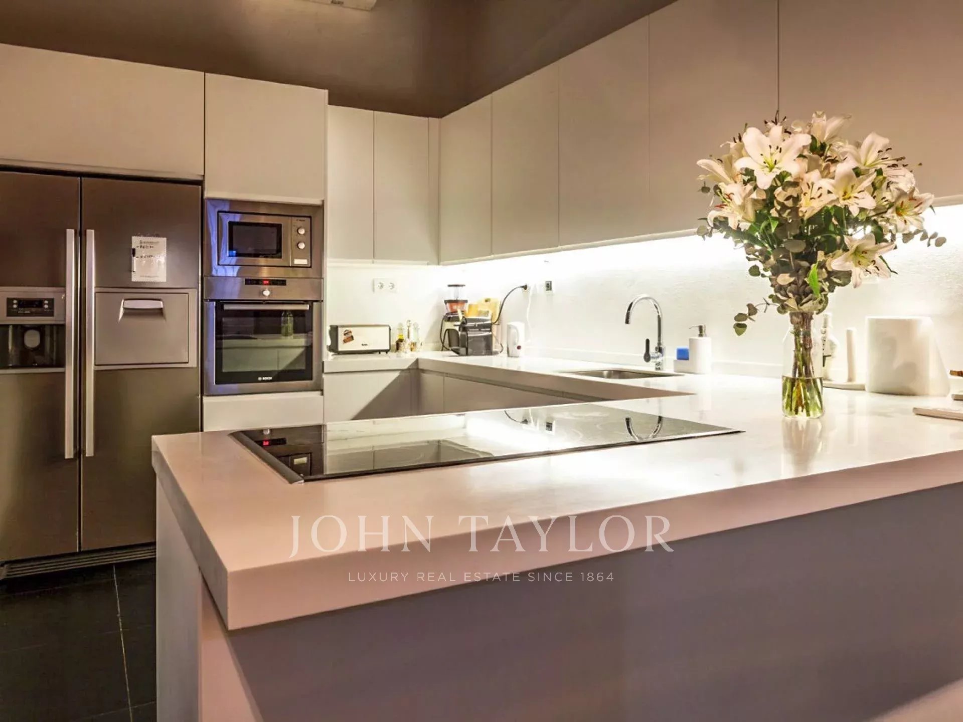 La cocina completamente equipada y en el exterior muchas zonas exteriores con una mesa parar 14 personas.