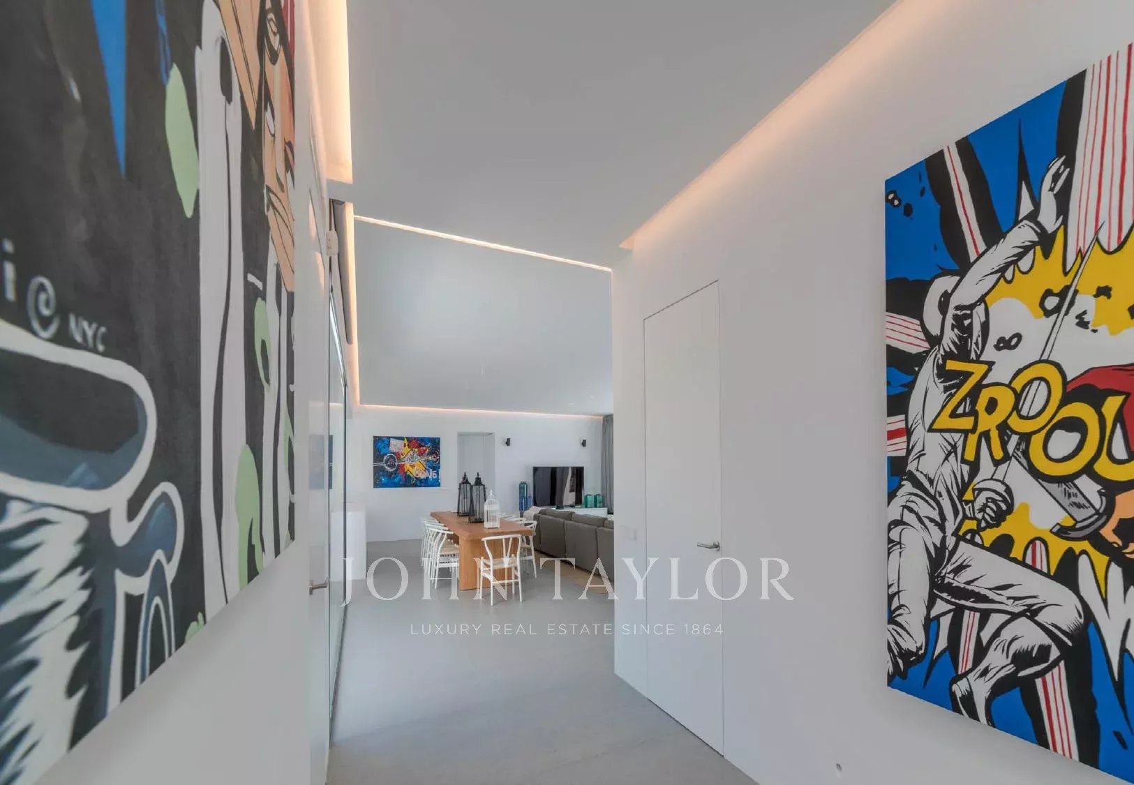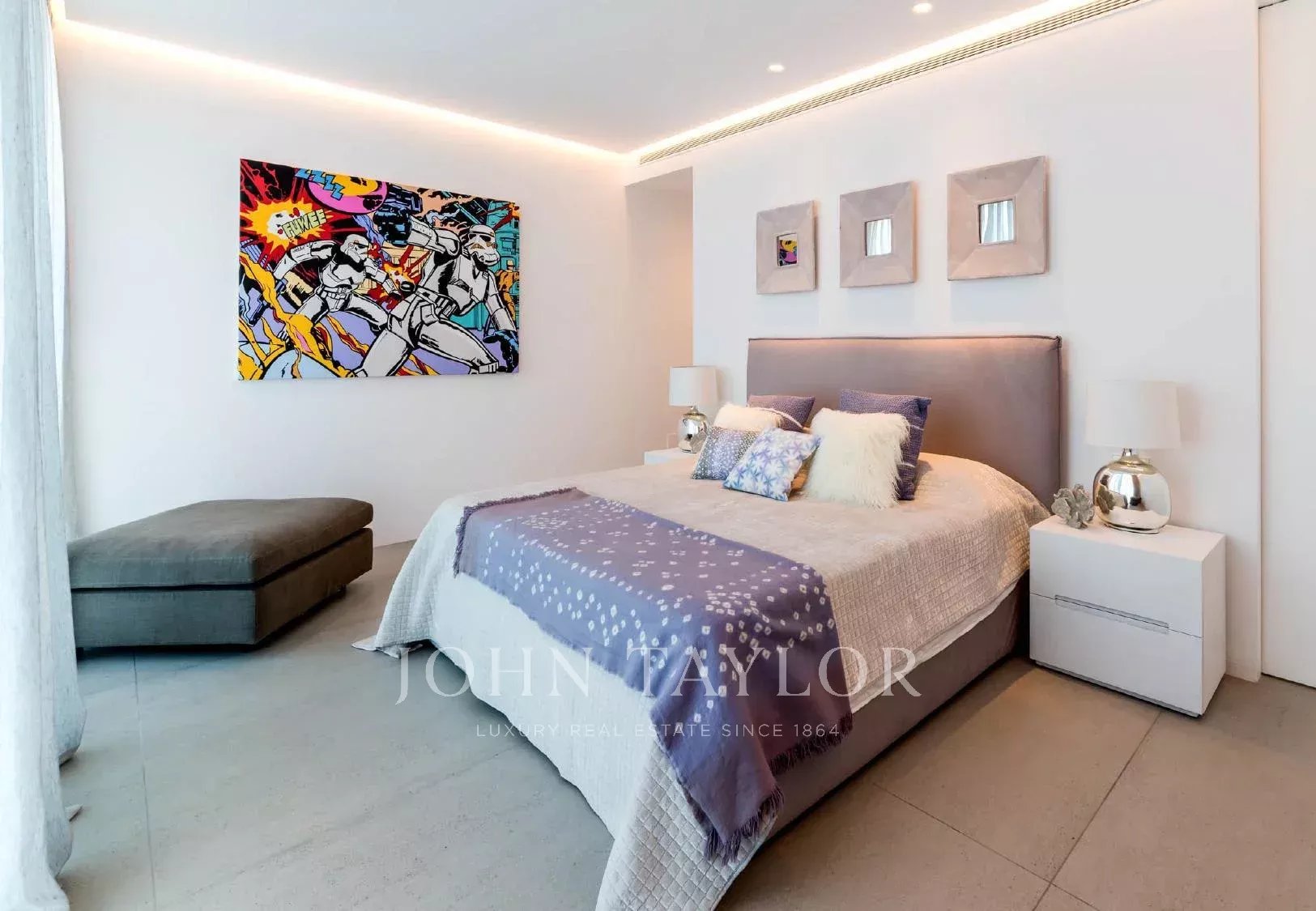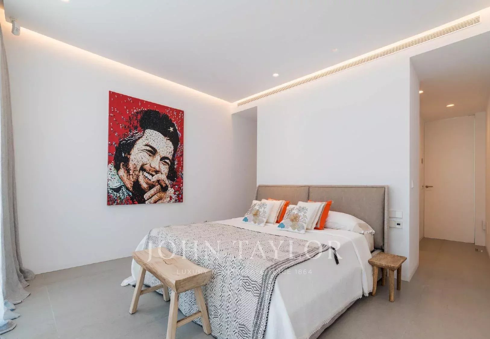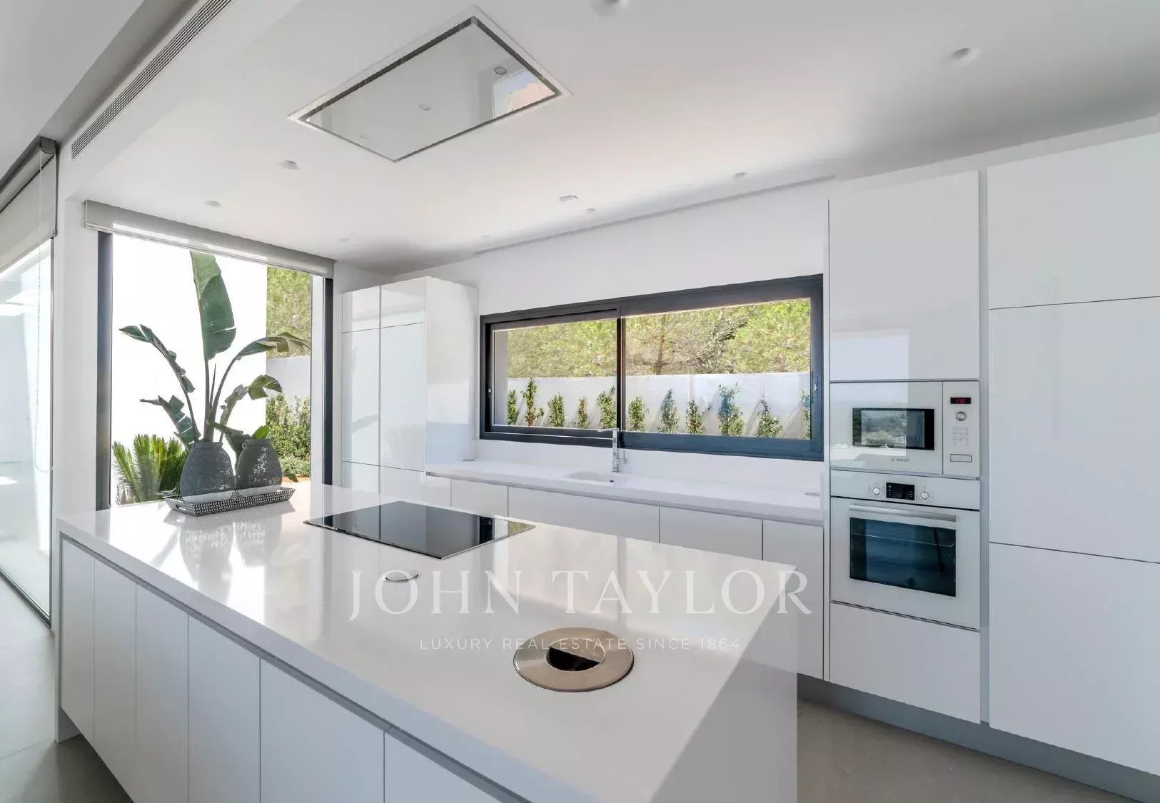 La distribución de la casa, planteada en una sola planta, facilita la comodidad del día a día. Cuenta con cinco dormitorios dobles, todos con baño en suite, un elegante salón de concepto abierto y una cocina moderna equipada con electrodomésticos de alta gama. Las zonas comunes se abren directamente a las terrazas, el jardín y la piscina infinity de 20 metros, climatizable en los meses de abril, mayo, octubre y noviembre sin coste adicional.