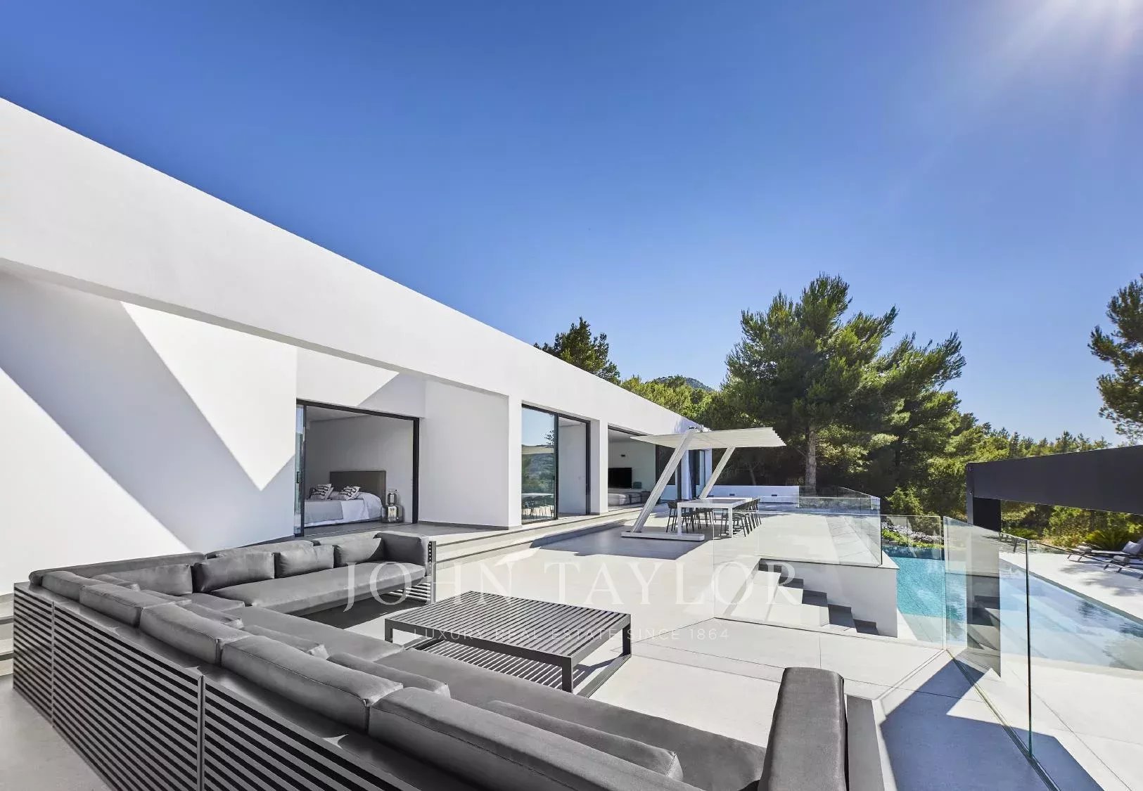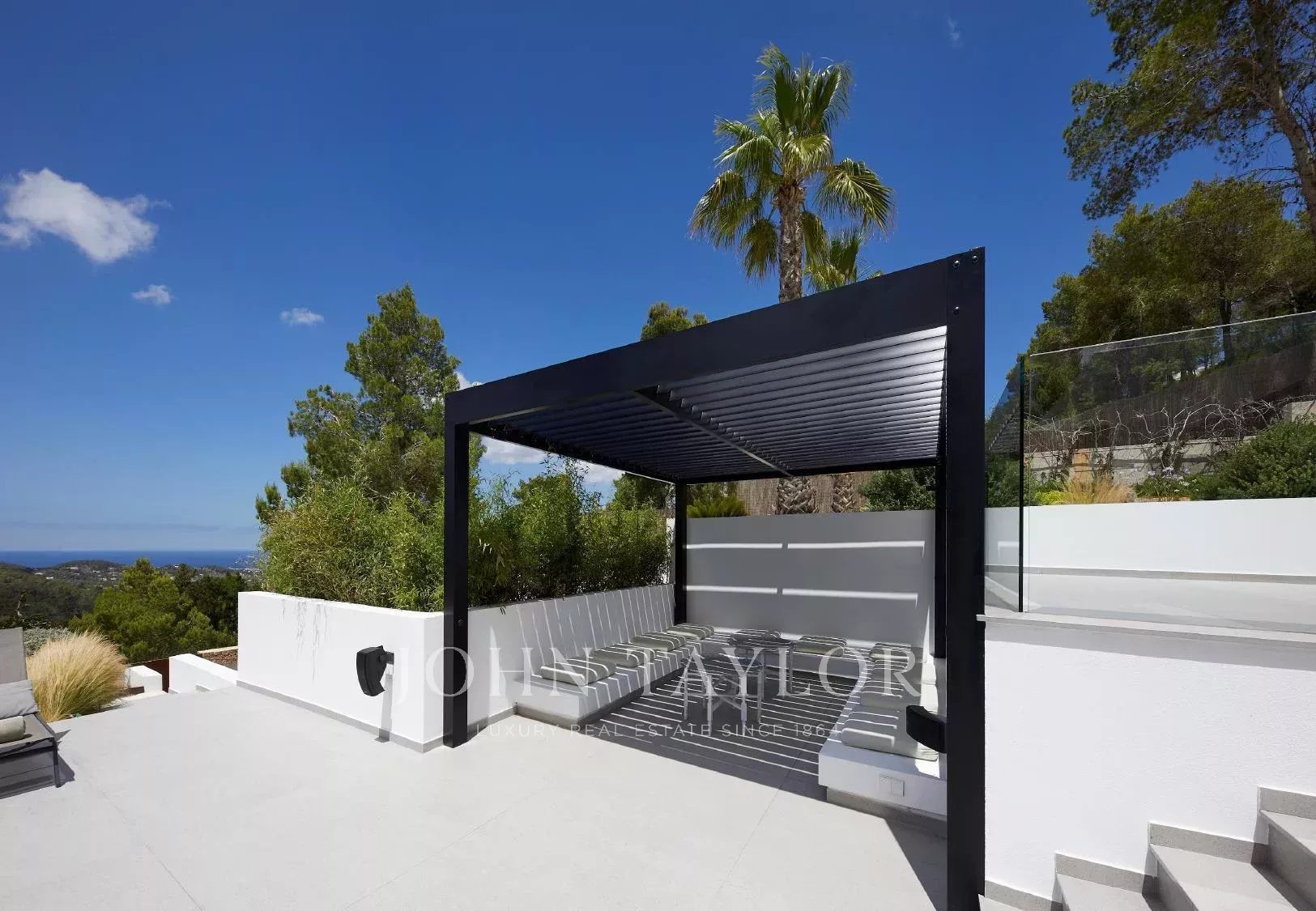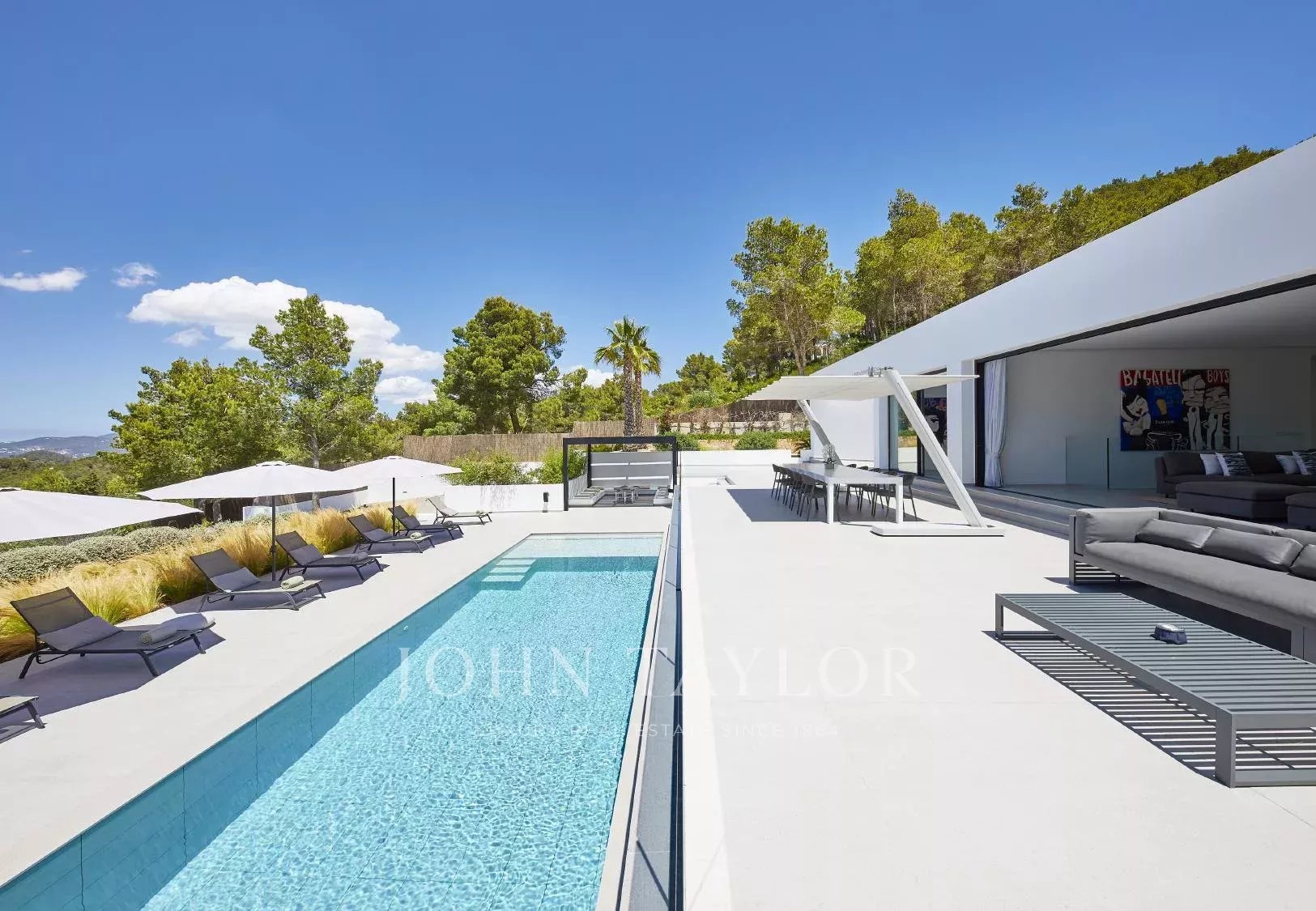 Espectacular villa de cinco dormitorios situada en una exclusiva zona montañosa a lo largo de la carretera de Sant Josep, en un entorno que combina privacidad total con una excelente conexión a la isla: a tan solo diez minutos en coche del aeropuerto y muy cerca de algunas de las mejores playas, restaurantes y clubes de Ibiza.