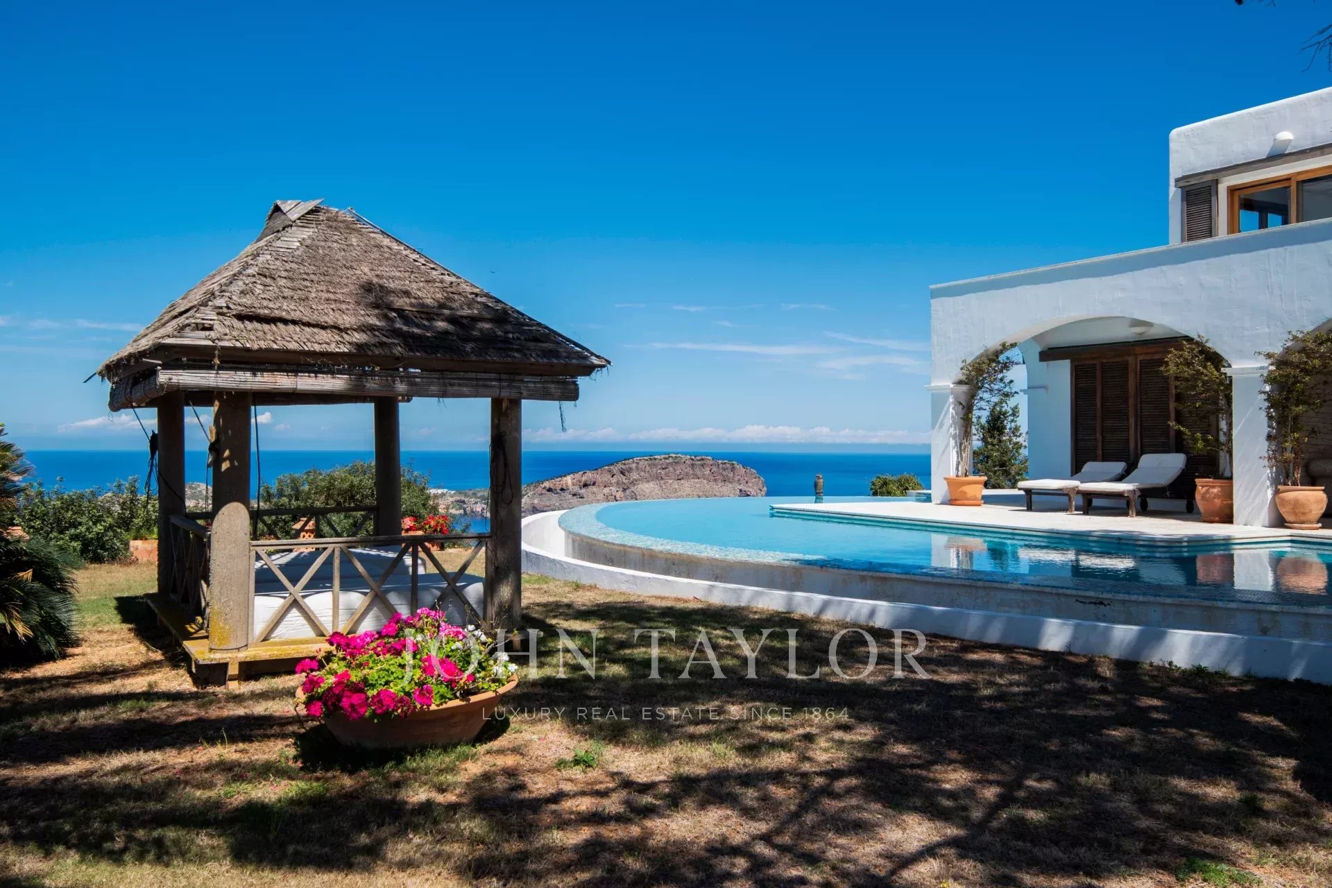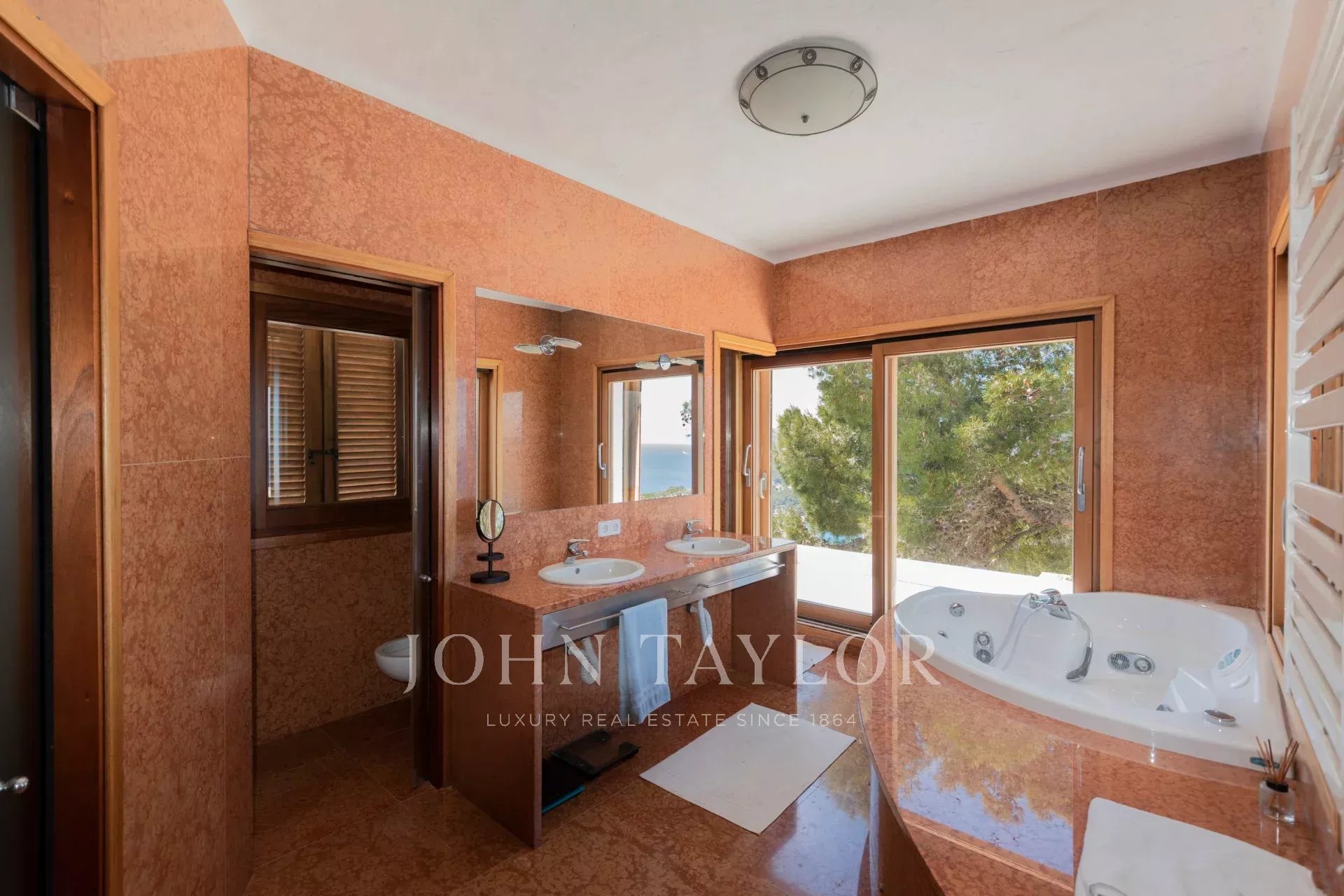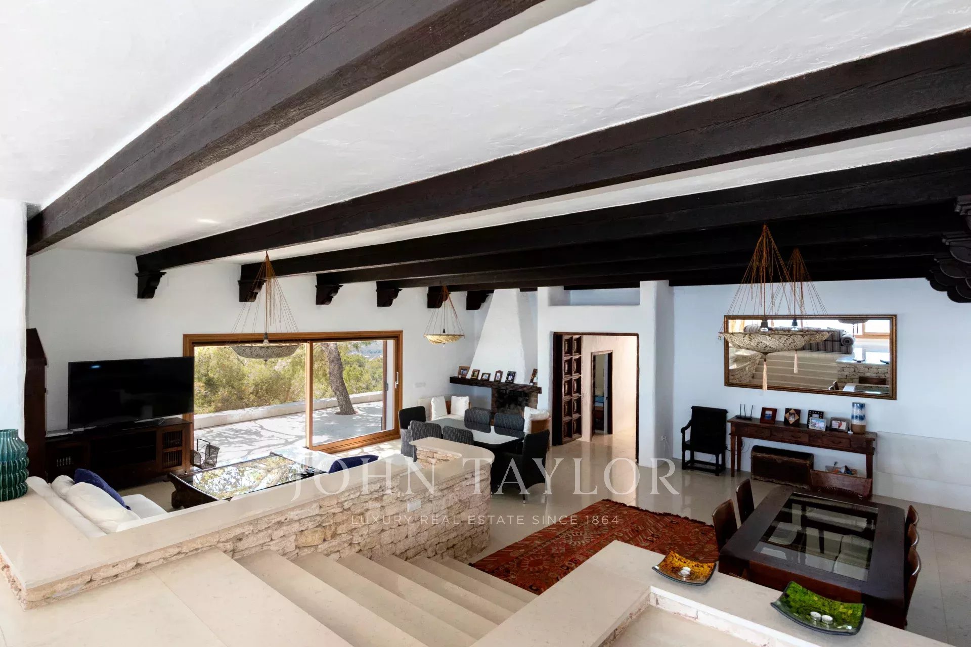 No hay otra propiedad en Ibiza que ofrezca vistas comparables. Desde las 10 terrazas, el hermoso jardín y todas las habitaciones, se puede disfrutar de una vista de 360 grados del Mar Mediterráneo, con todos los barcos que pasan. Incluso se divisa Mallorca, así como toda la isla de Ibiza. La propiedad cuenta con una fantástica piscina infinita, un espacio para practicar yoga y una cancha deportiva.