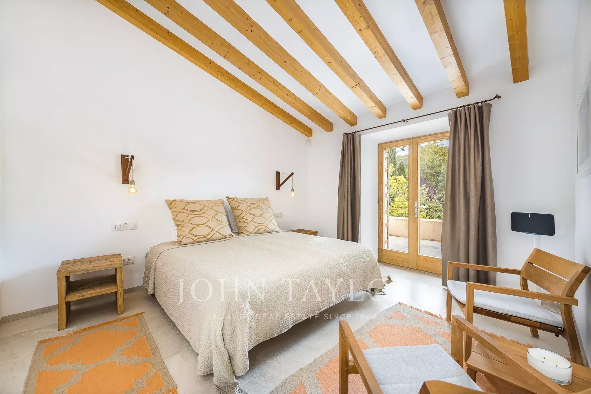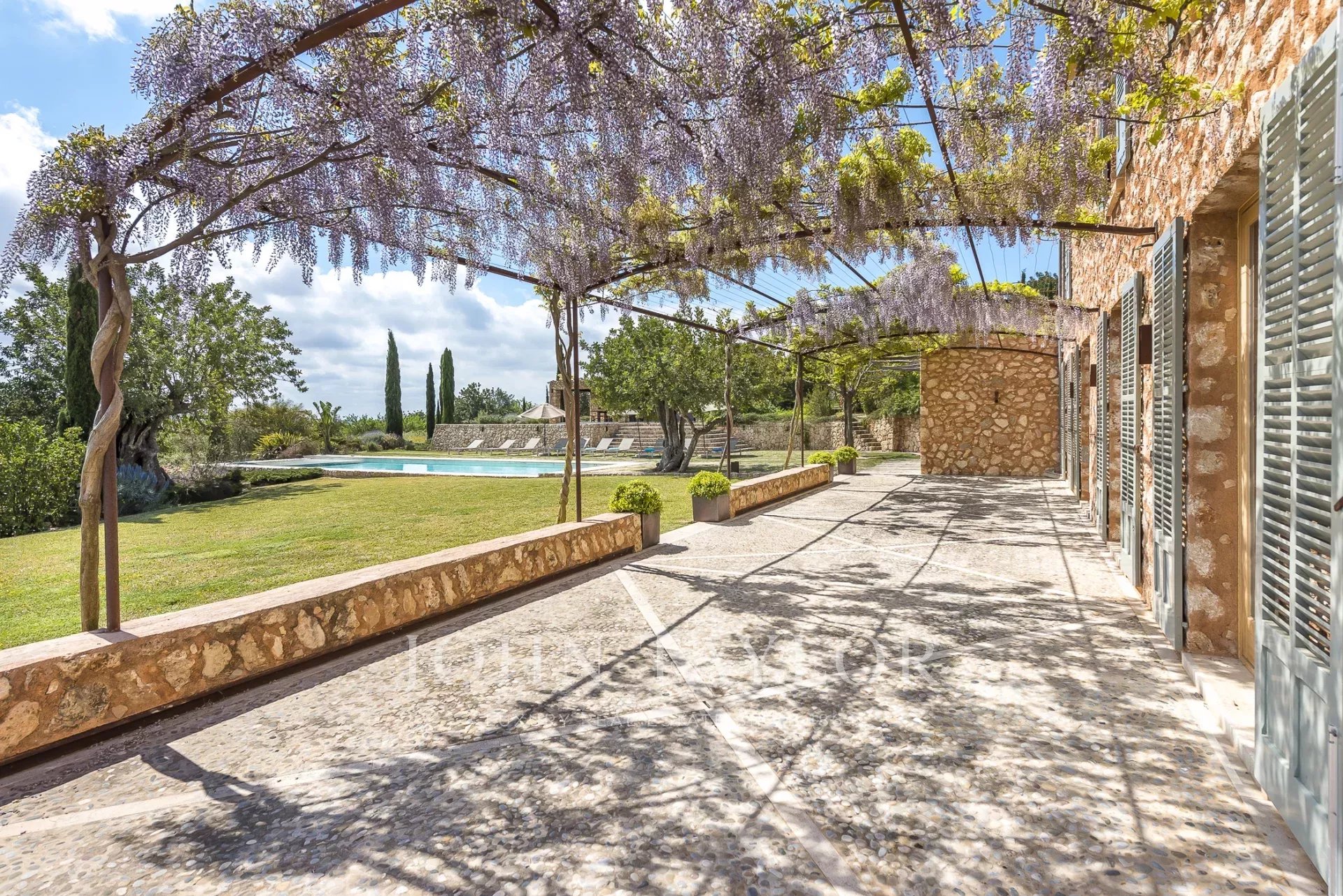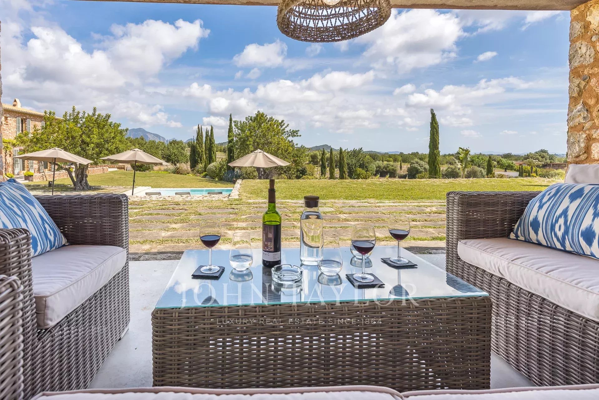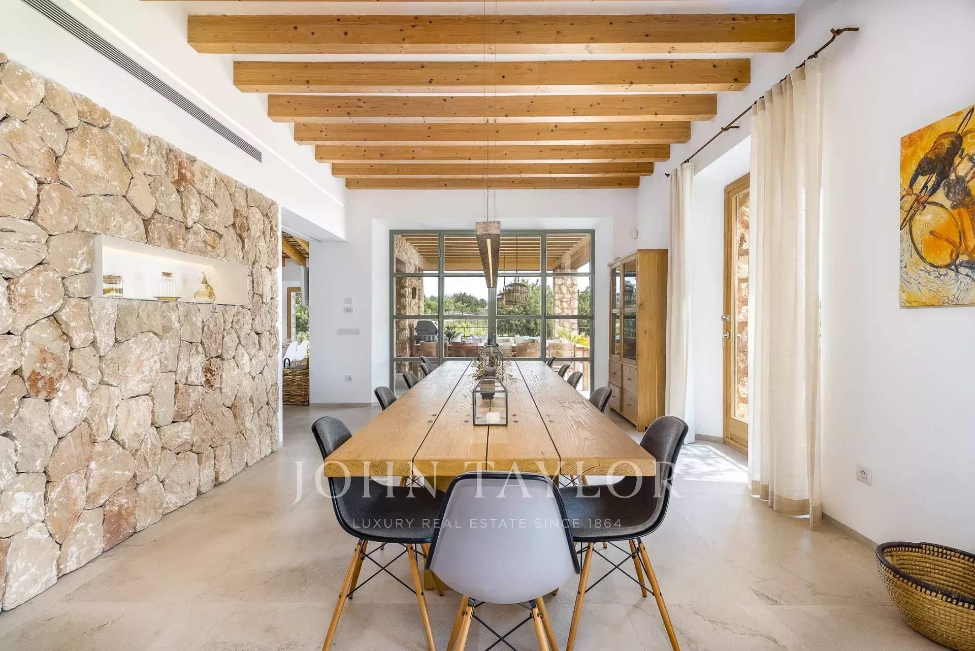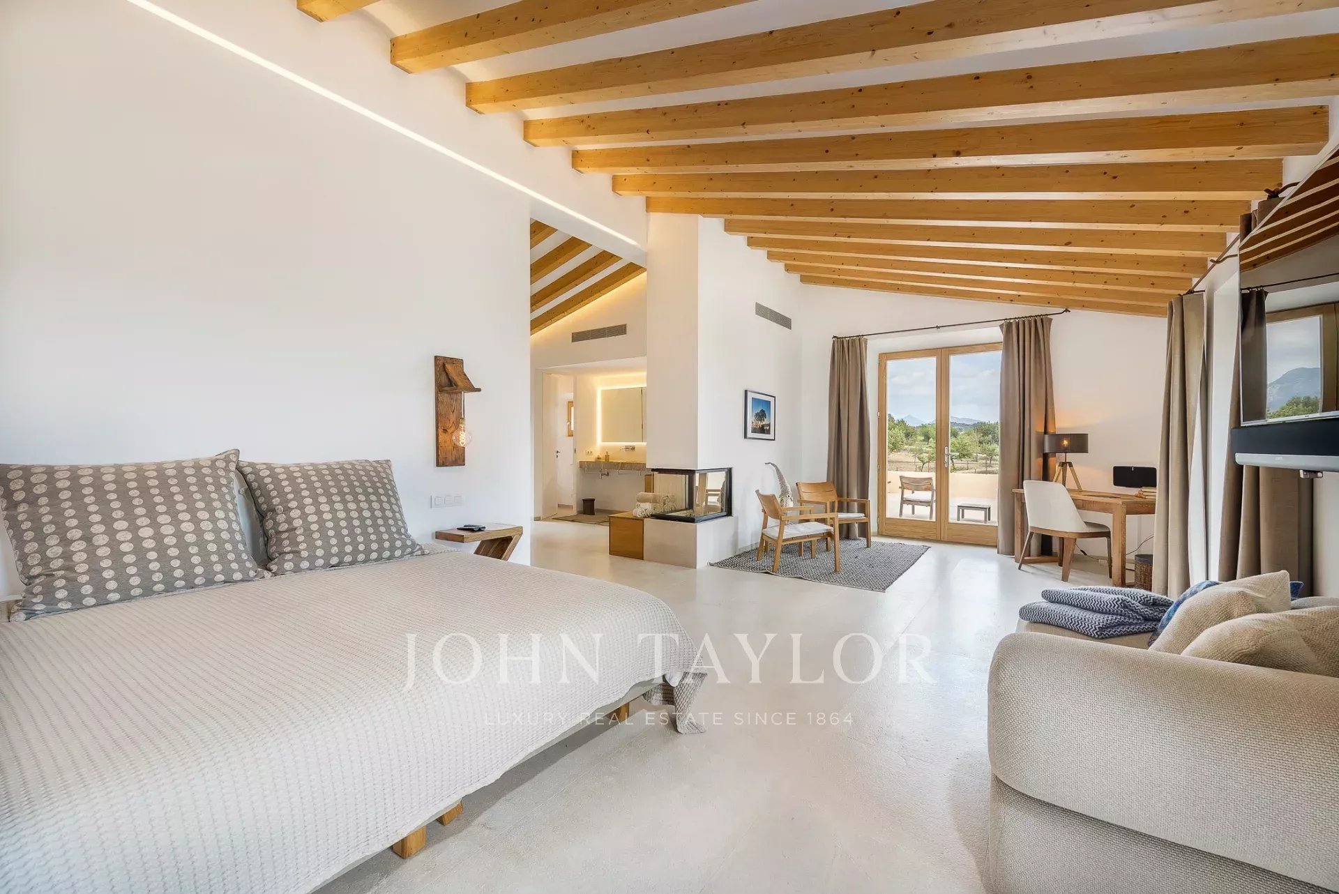 Esta encantadora finca de piedra natural se encuentra en las afueras de Santa María. Rodeada de un jardín mediterráneo y varias viñas con vistas al hermoso paisaje, esta finca cautiva por su auténtica construcción. De nueva construcción y ultramoderna sin perder el carácter típico y acogedor de Finca, se encuentra en una parcela de aprox. 4 hectáreas. Los 4 dormitorios ofrecen espacio para hasta 8 personas y se distribuyen en 3 plantas. Los grandes ventanales orientados al sur proporcionan mucha luz y otorgan una magnífica vista de la vegetación típica del país con olivos, almendros y algarrobos. Varias terrazas cubiertas y descubiertas con zonas chill-out y una gran piscina ofrecen espacio suficiente para disfrutar de la paz y el idilio del entorno. La casa está modernamente amueblada con colores y materiales cálidos, que proporcionan un ambiente especial de bienestar. La cocina es moderna y está totalmente equipada. Los huéspedes también tienen acceso a la sala de fitness de la propiedad.