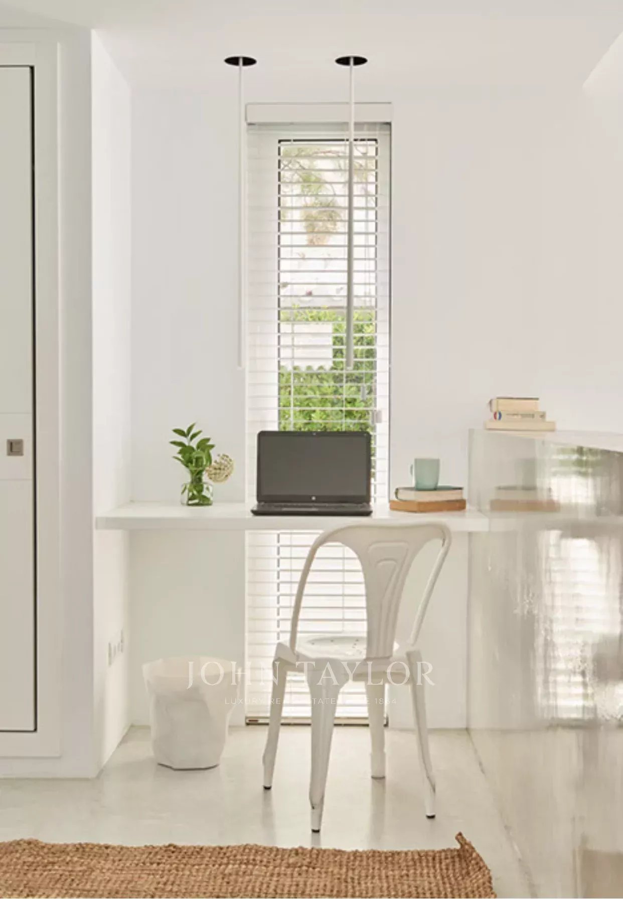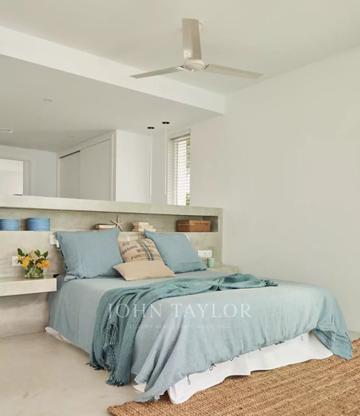 Prácticamente toda la casa se encuentra en una sola planta con vistas al mar, luz natural y cuenta con aire acondicionado en todas las estancias del nivel principal. Desde el salón/comedor, abierto a la cocina, se accede por un lado a 1 gran habitación principal de matrimonio con vestidor y con cuarto de baño en-suite con bañera de diseño independiente y ducha. En el otro lado de la casa están 2 habitaciones dobles y 2 cuartos de baño con ducha.