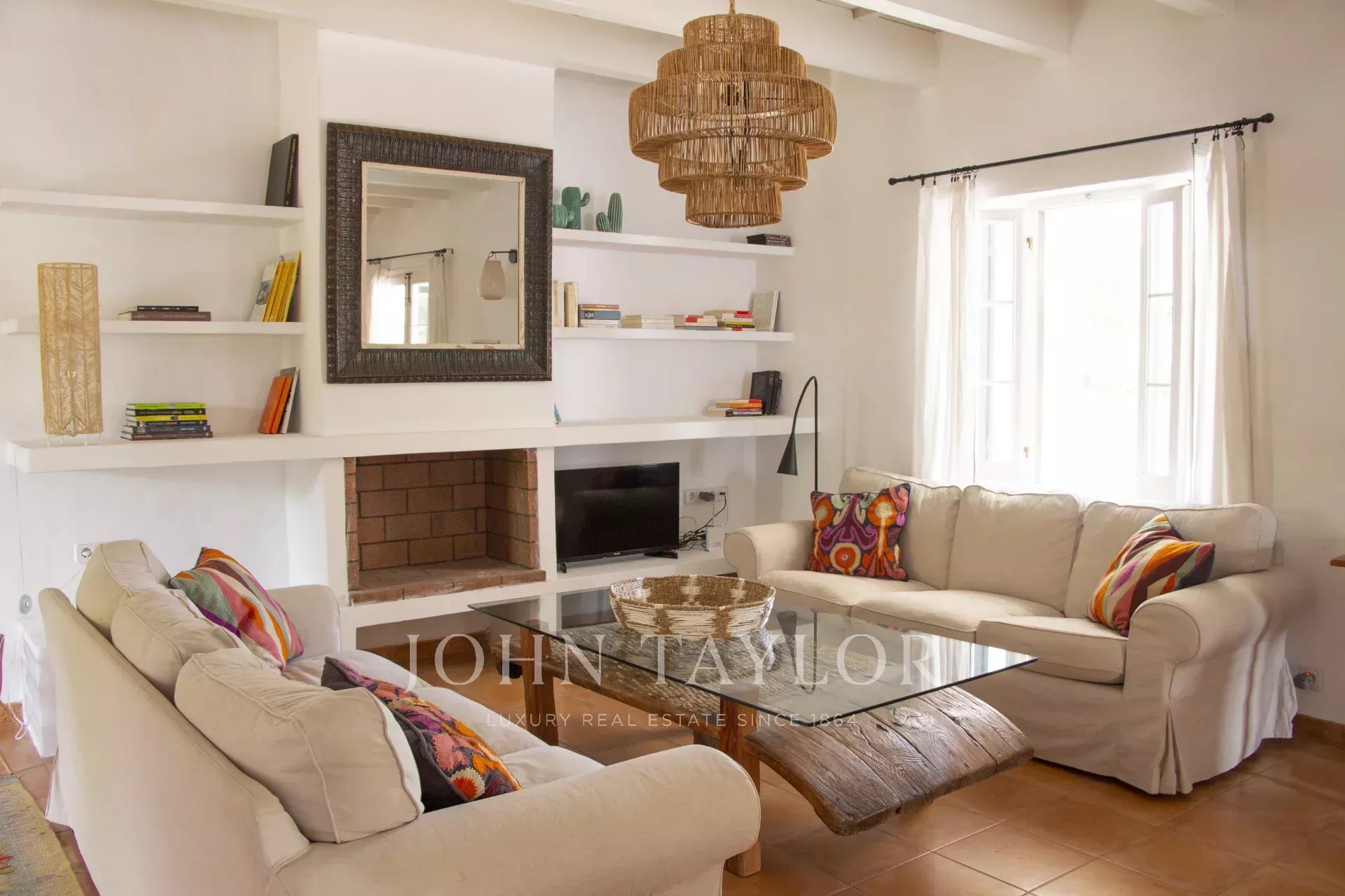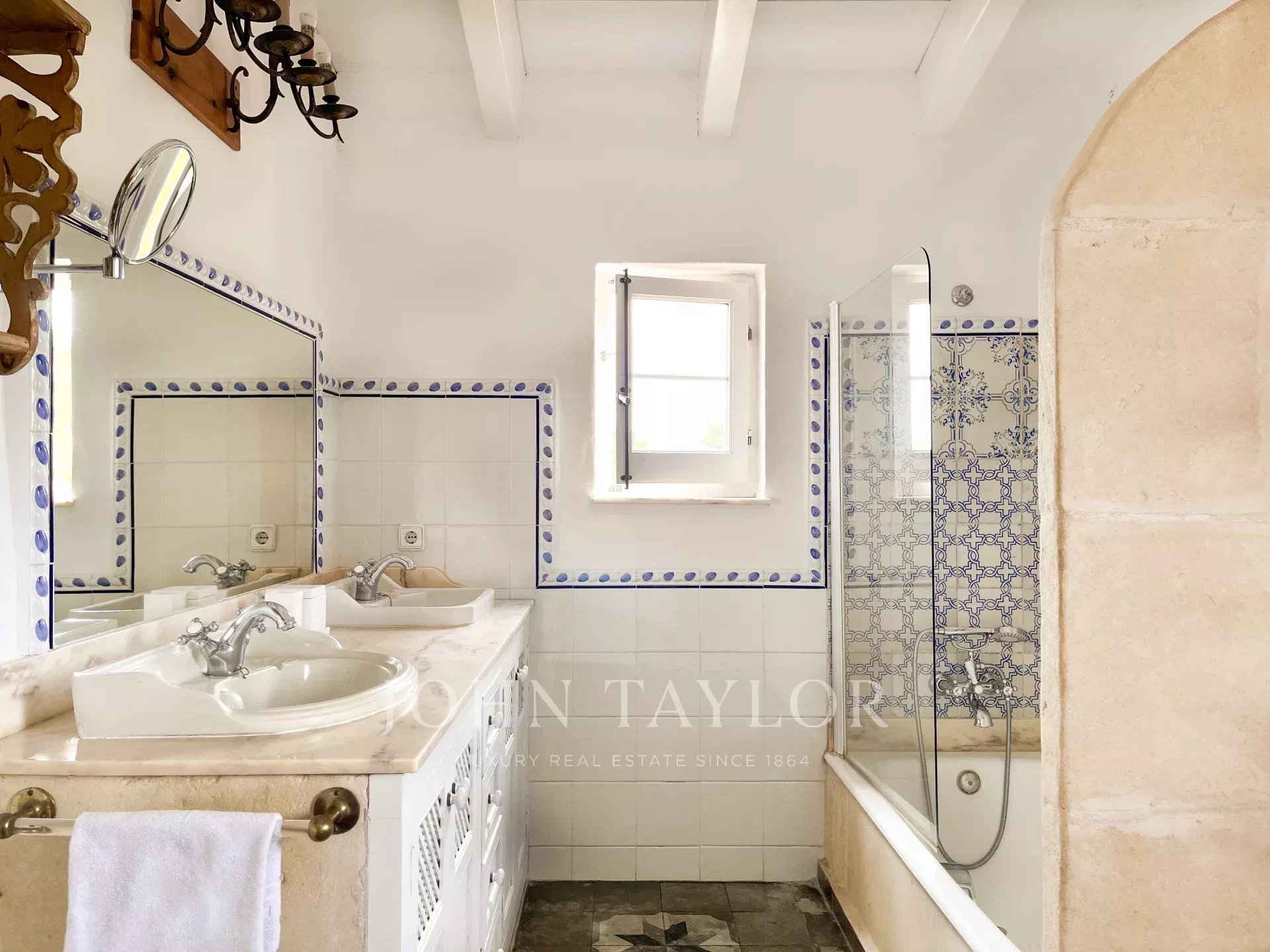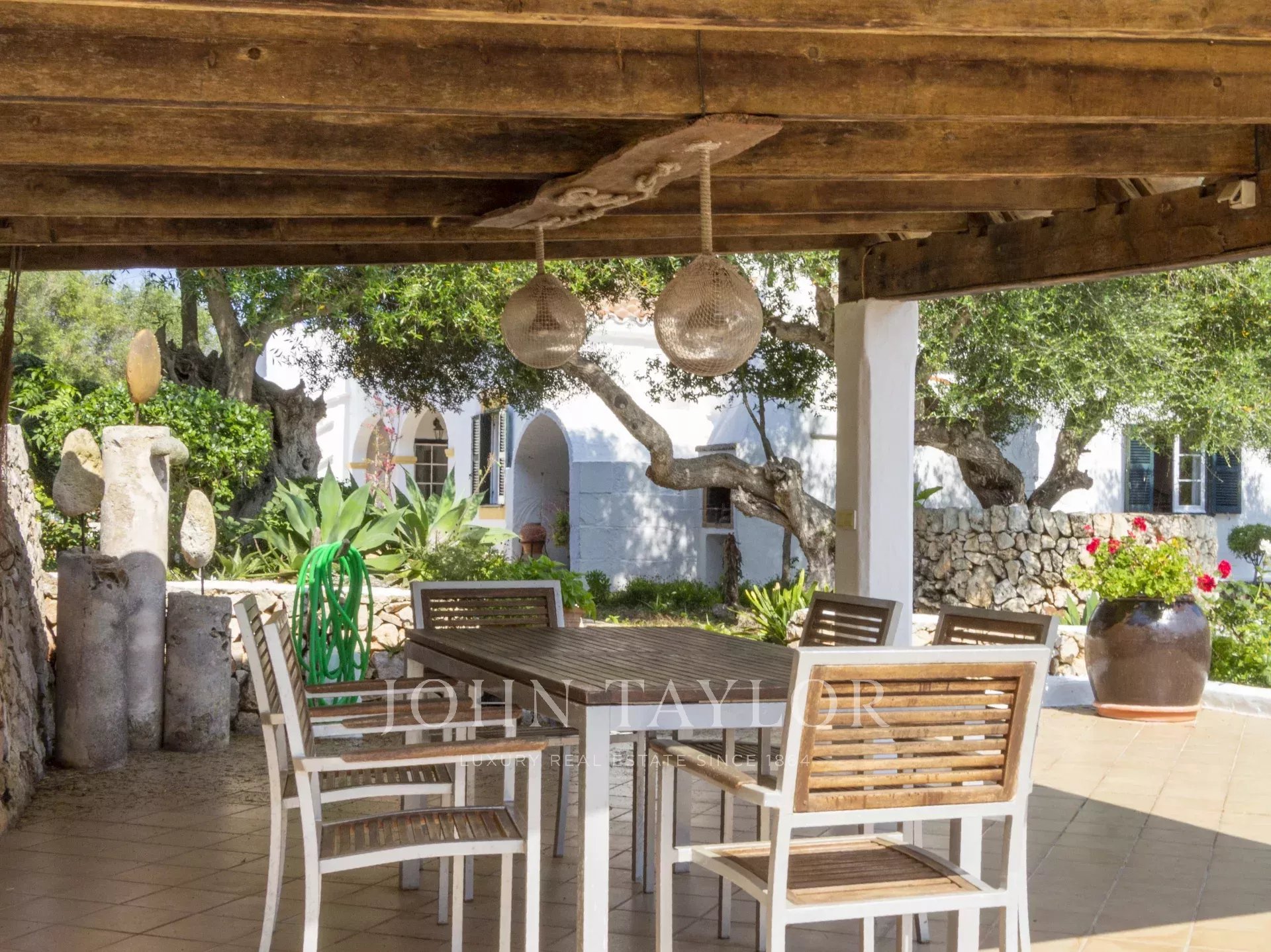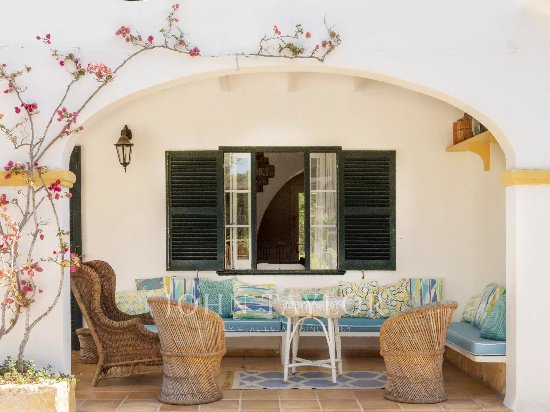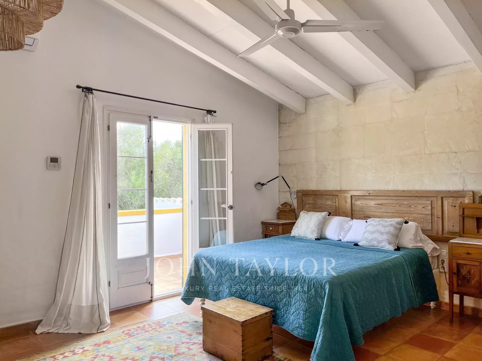 Esta preciosa casa típica menorquina está situada en el bonito paraje rural de S´Uestrá / Biniali, muy cerca del pueblo de Sant Lluís, donde se puede encontrar todo tipo de servicios (tiendas, bares, restaurantes, bancos, farmacia). Las playas de Binibeca y Binissafúller están a unos 5 minutos conduciendo. Es imprescindible disponer de vehículo. Exterior: El terreno que pertenece a la casa tiene aproximadamente 11.000 metros cuadrados. La piscina está situada en la cara este de la casa y mide 10 x 5 metros. Cerca de la piscina hay un zona cubierta para comer al aire libre. El porche de la casa cuenta con sofás de obra típicos menorquines. El terreno tiene amplias zonas de césped, olivos y varias áreas muy tranquilas donde uno se puede relajar a la sombra. Interior: Casa San Andrea tiene unos interiores con gran atención a los detalles y se ha construido con materiales tradicionales de la isla, recreando un ambiente antiguo pero con el confort para la vida moderna. Casa Principal (dos plantas) para 10 personas: Planta Baja: en la parte central de la casa se encuentra el salón y la cocina, ambos con acceso a la terraza delantera. Desde aquí se accede a una zona donde se encuentra 1 habitación de matrimonio (1,60m) con AA y 1 habitación doble (dos camas individuales) con AA, que comparten un baño completo con bañera. Y en la otra parte de la casa hay 1 habitación doble (2 camas individuales), 1 baño con cucha, 1 aseo y el lavadero. Primera Planta: 1 habitación de matrimonio (1,60m) con AA con baño completo en-suite y 1 habitación de matrimonio (1,50) con AA con cuarto de baño con ducha en-suite. Ambas habitaciones tienen acceso a una terraza con bonitas vistas al campo. Todas las habitaciones tienen ventilador en el techo. Casita Anexo para 2 personas: Situada a 100m de la casa principal: porche, salón, 1 habitación doble, 1 baño con ducha y pequeña cocina. Nota: la casa principal dispone de calefacción para los meses fríos (consultar precio adicional).