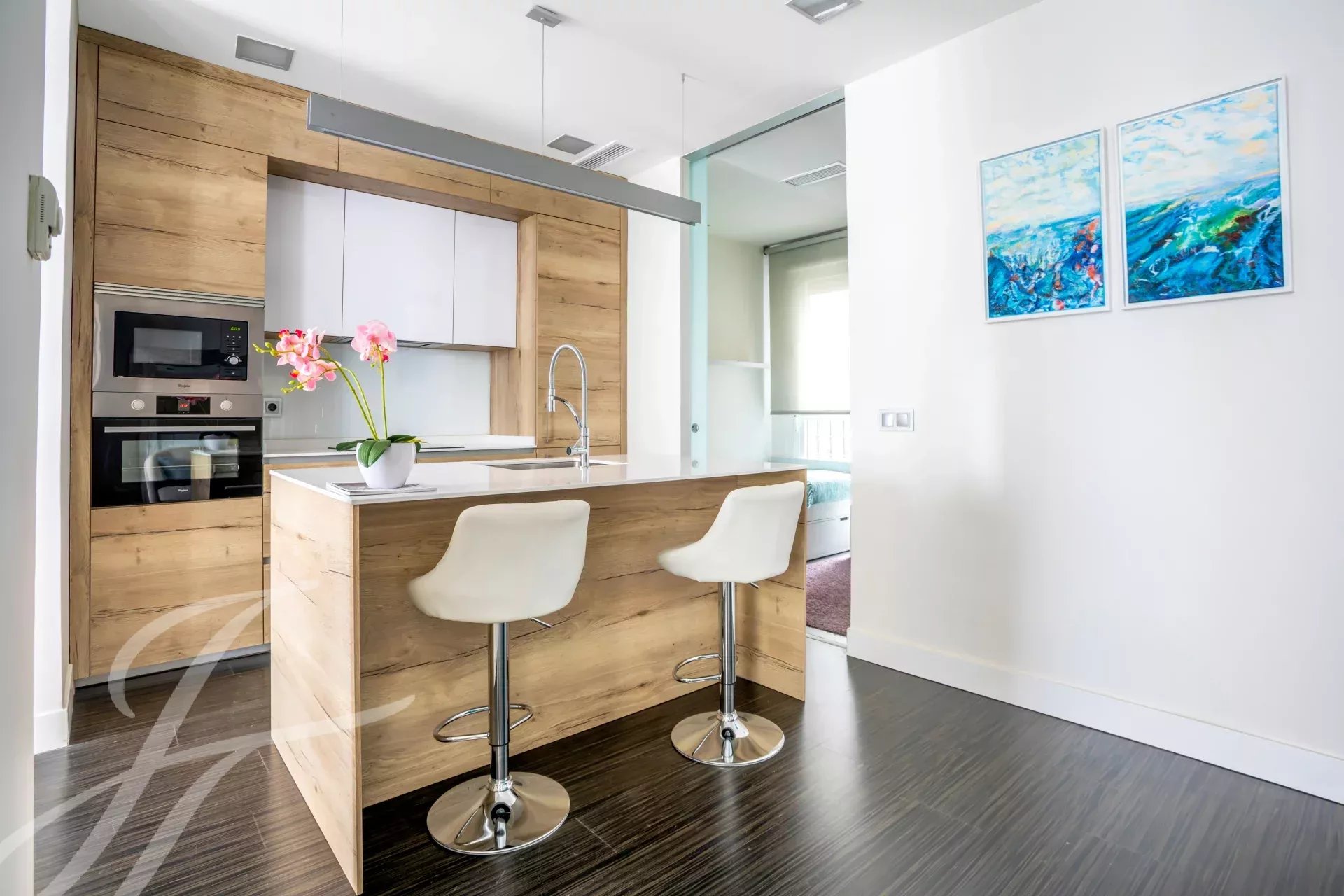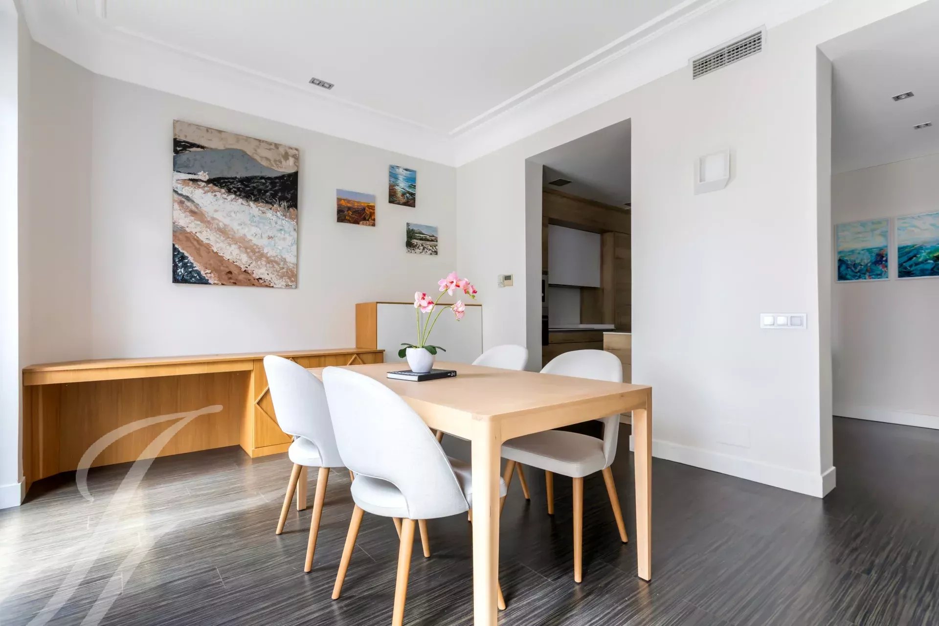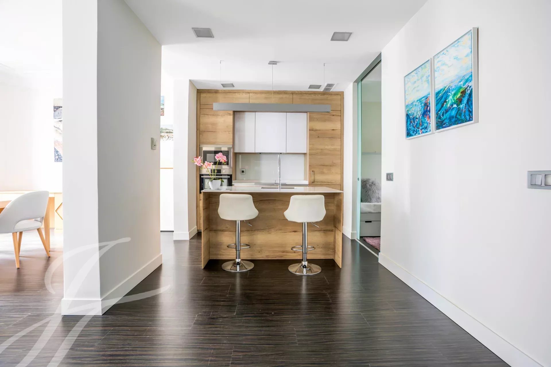 El salón-comedor, orientado al sur, goza de una excelente iluminación natural y se integra perfectamente con la cocina, equipada con electrodomésticos de alta gama. Este amplio espacio abierto es ideal para reuniones con familiares y amigos, donde todos los espacios están conectados.
