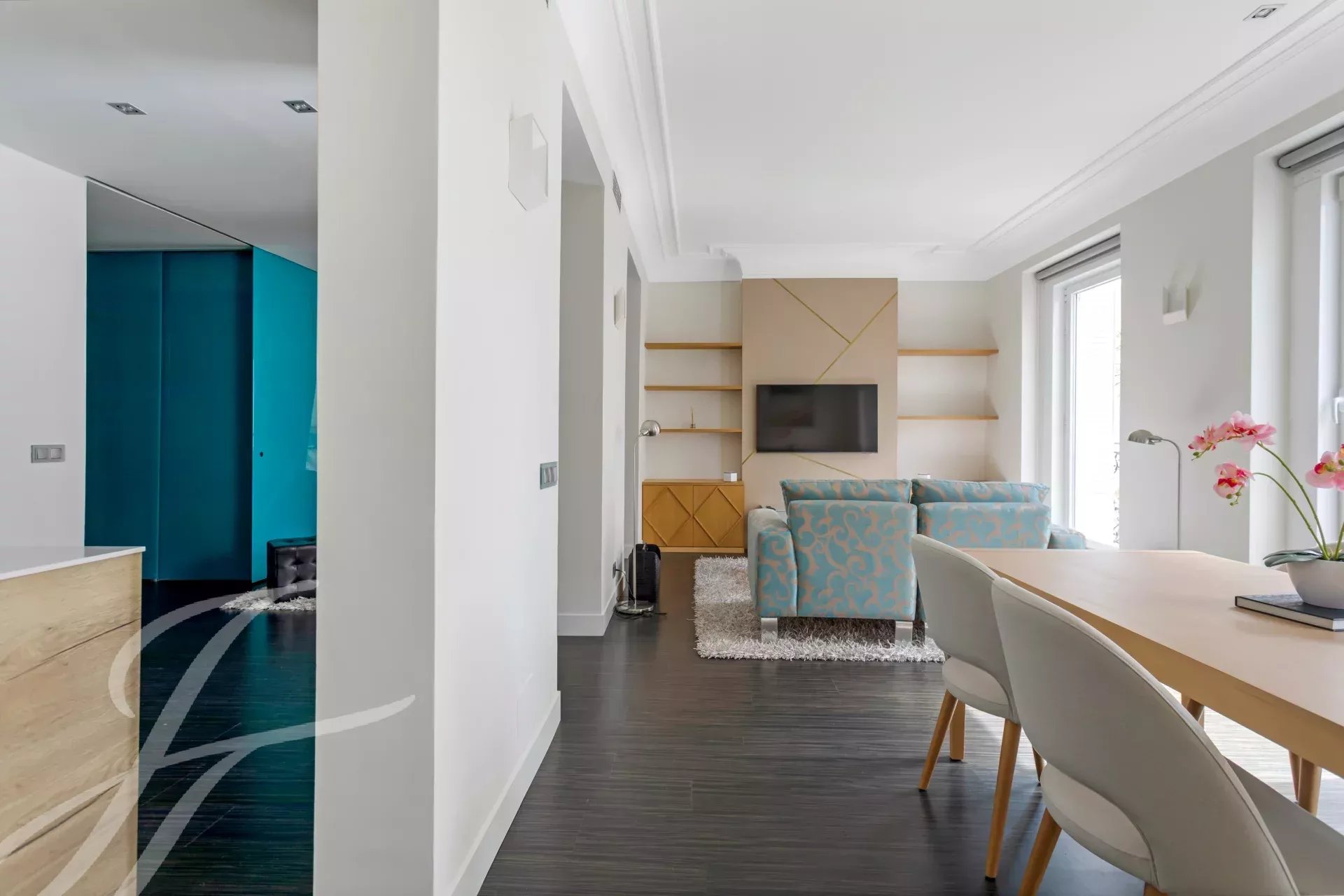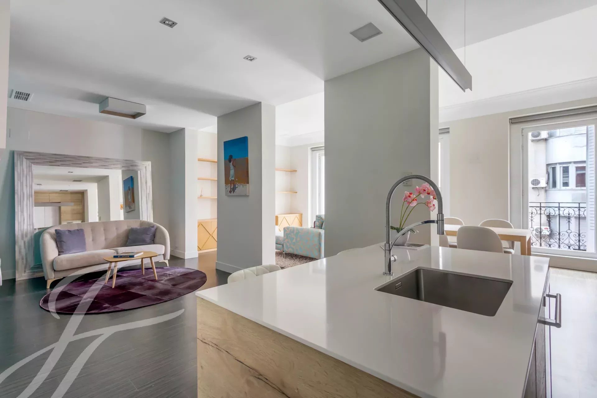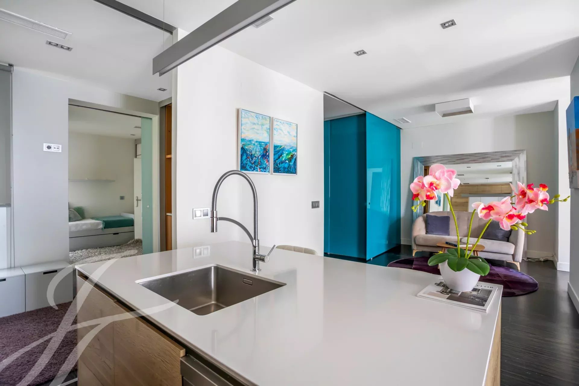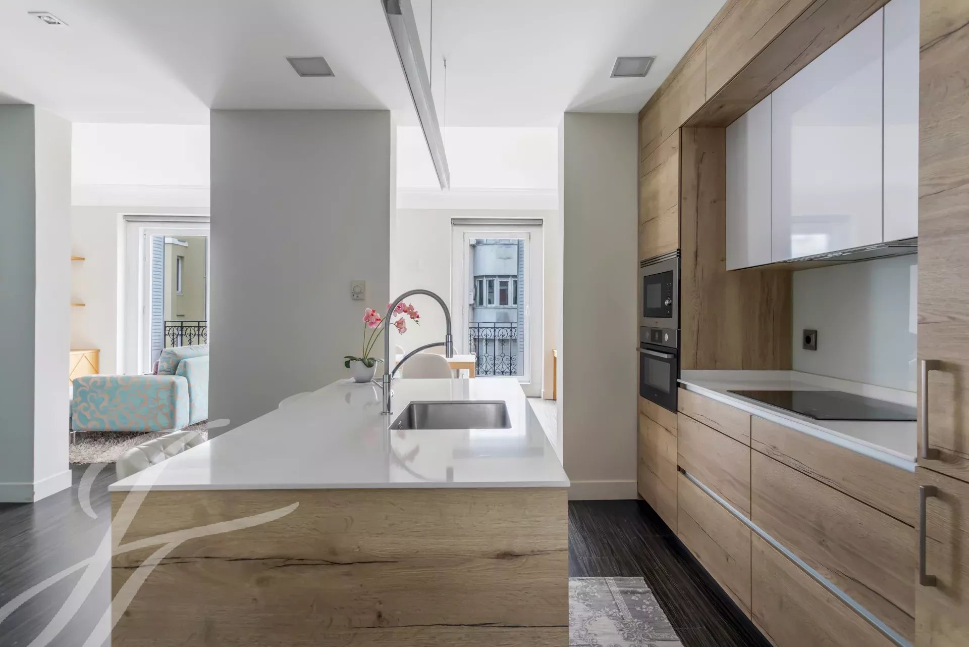 El salón-comedor, orientado al sur, goza de una excelente iluminación natural y se integra perfectamente con la cocina, equipada con electrodomésticos de alta gama. Este amplio espacio abierto es ideal para reuniones con familiares y amigos, donde todos los espacios están conectados.