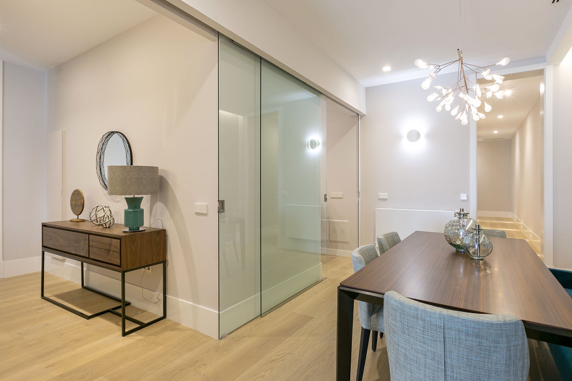 La cocina está perfectamente equipada con electrodomésticos de gran calidad y numeroso espacio de almacenaje. Su puerta corredera de cristal le permite independizarla del comedor cuando sea necesario.