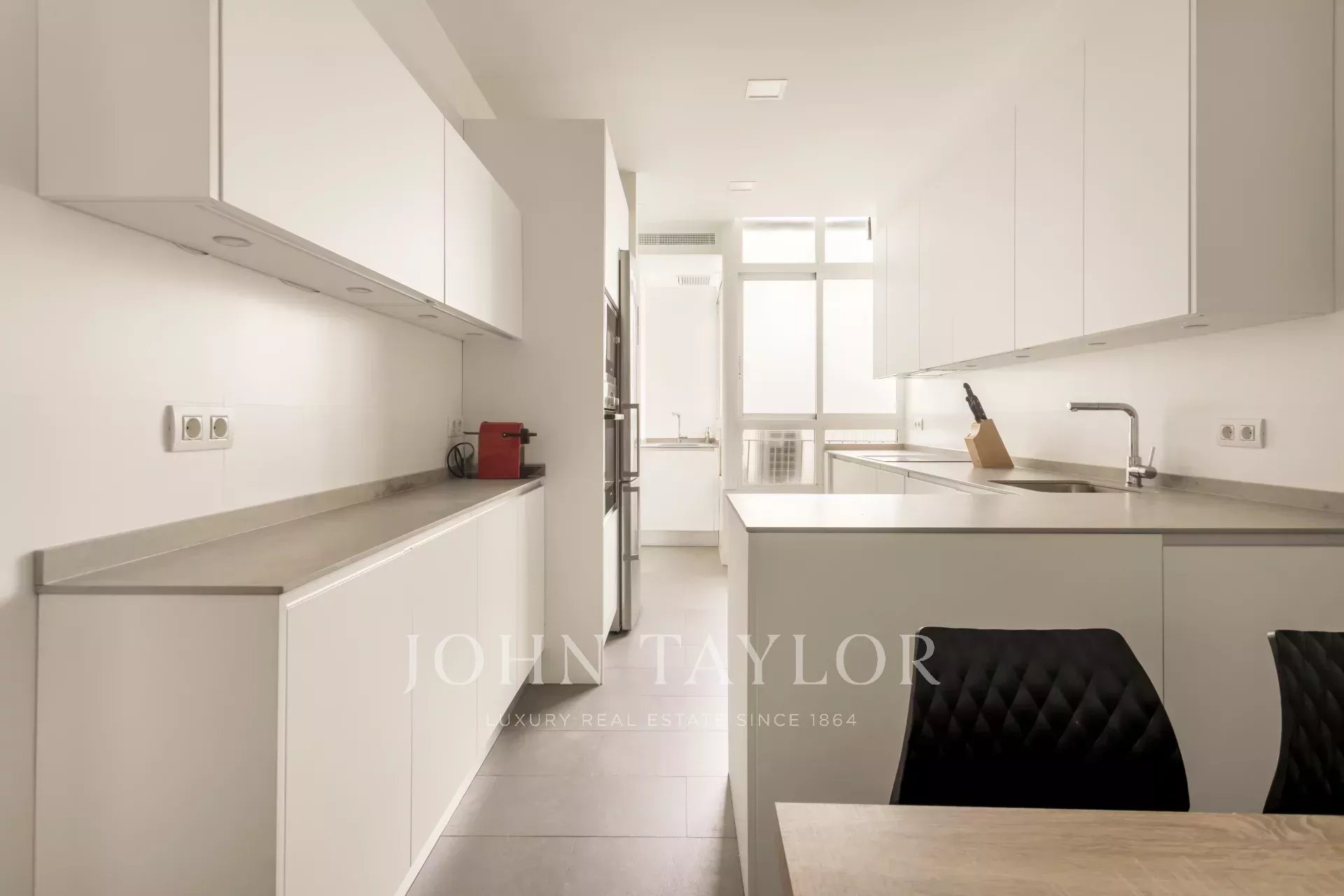 Una amplia y cómoda cocina equipada con todos los electrodomésticos de alta gama, así como con un lavadero y despensa completa la distribución de este lujoso piso.