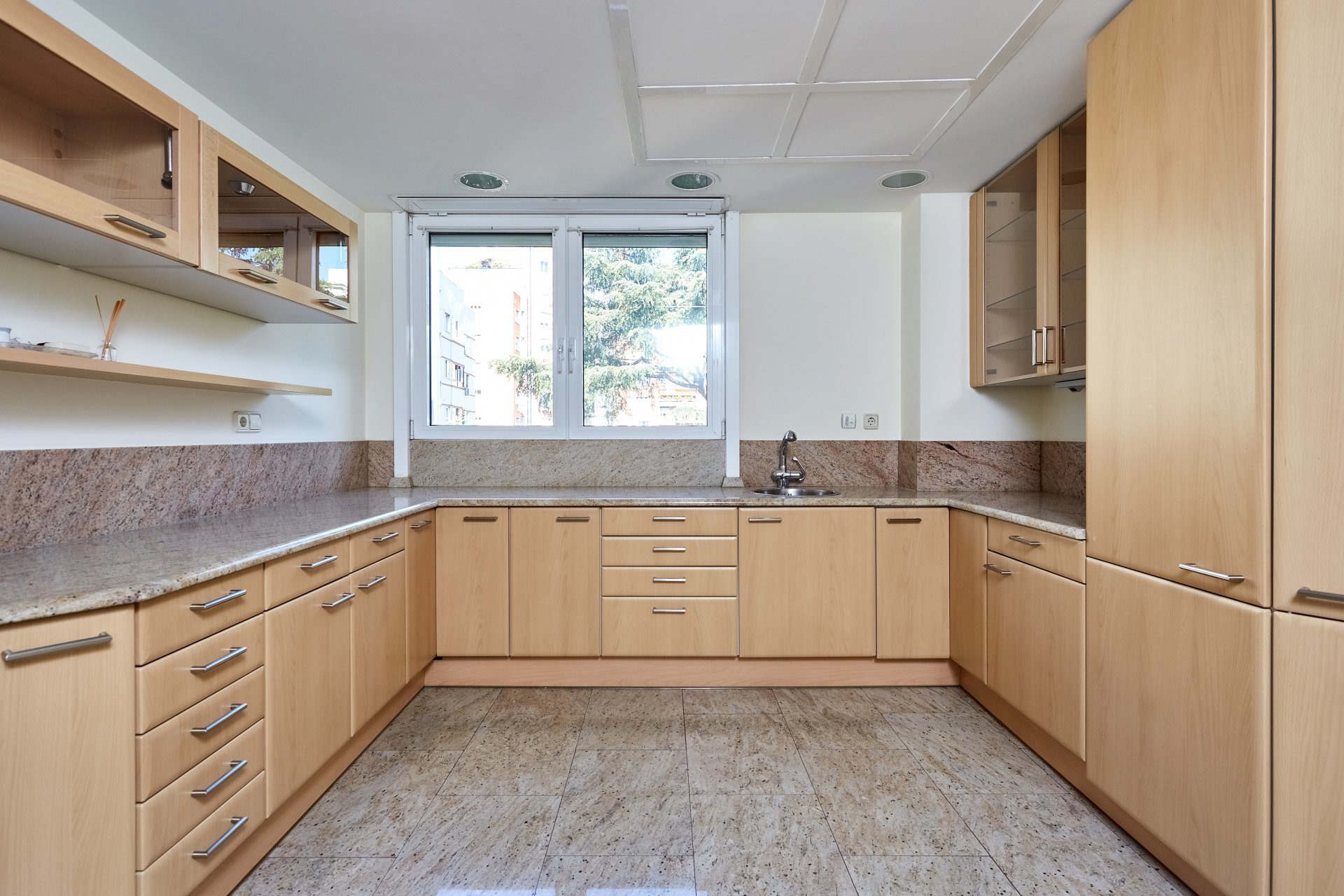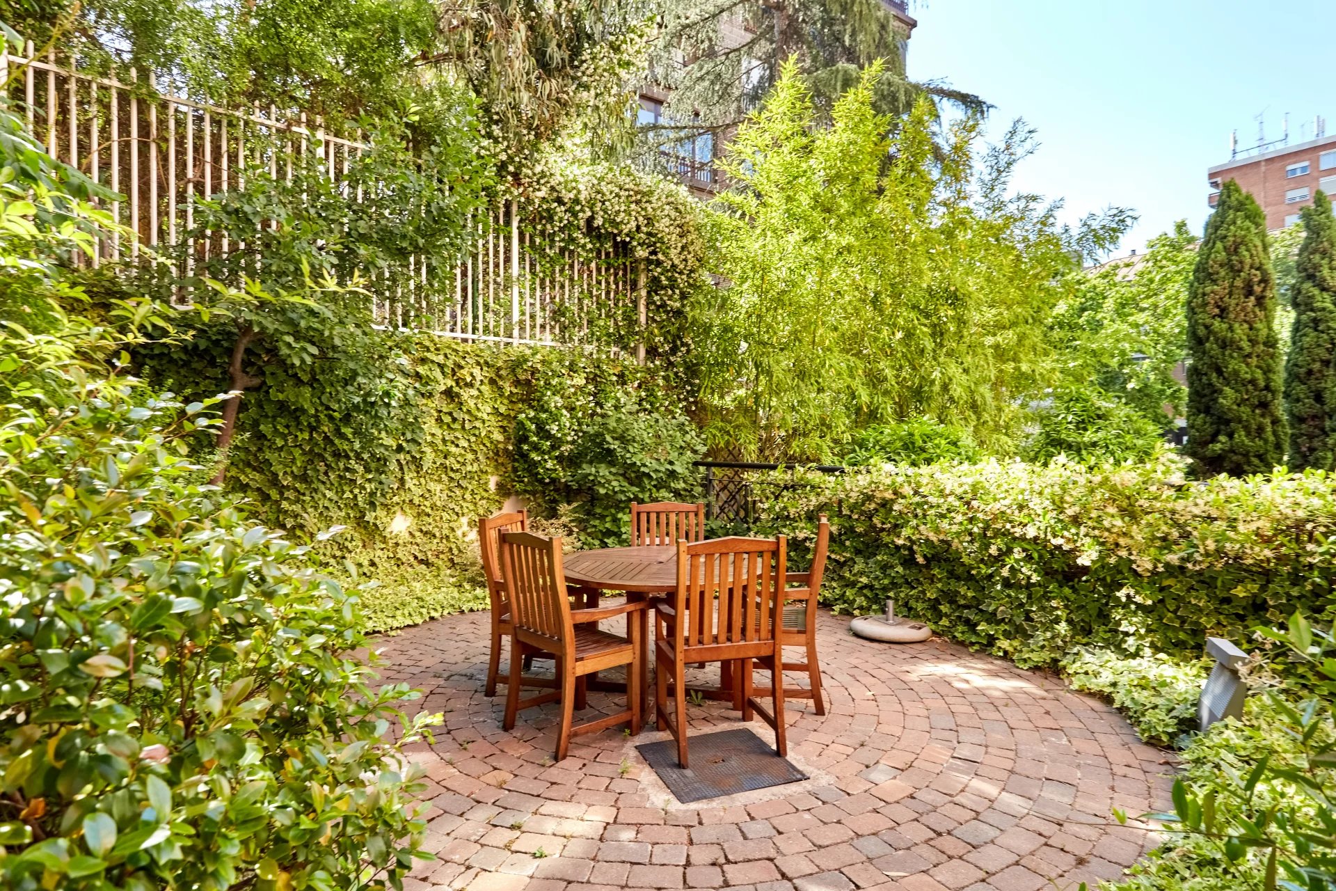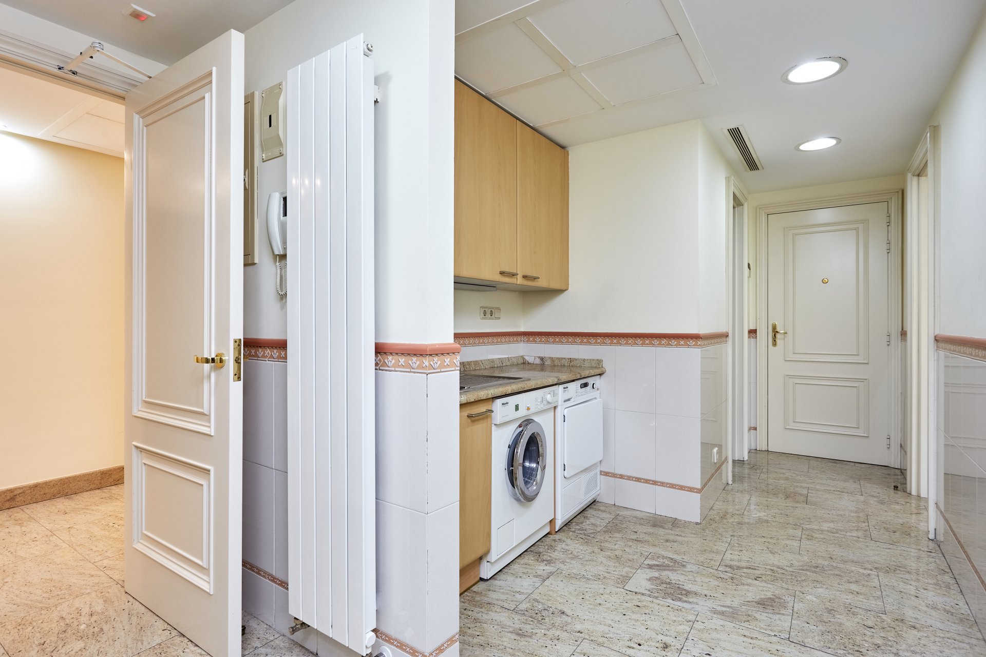 Accedemos a la vivienda, una cuarta planta, por un amplio hall de bienvenida, que da paso a un salón y un comedor, ambos muy espaciosos con grandes ventanales mirando al jardín, a la piscina y a una gran zona verde. Junto al recibidor hay un aseo de cortesía. El piso cuenta con una gran cocina (con zona office independiente) y con zona de servicio completa y acceso independiente.