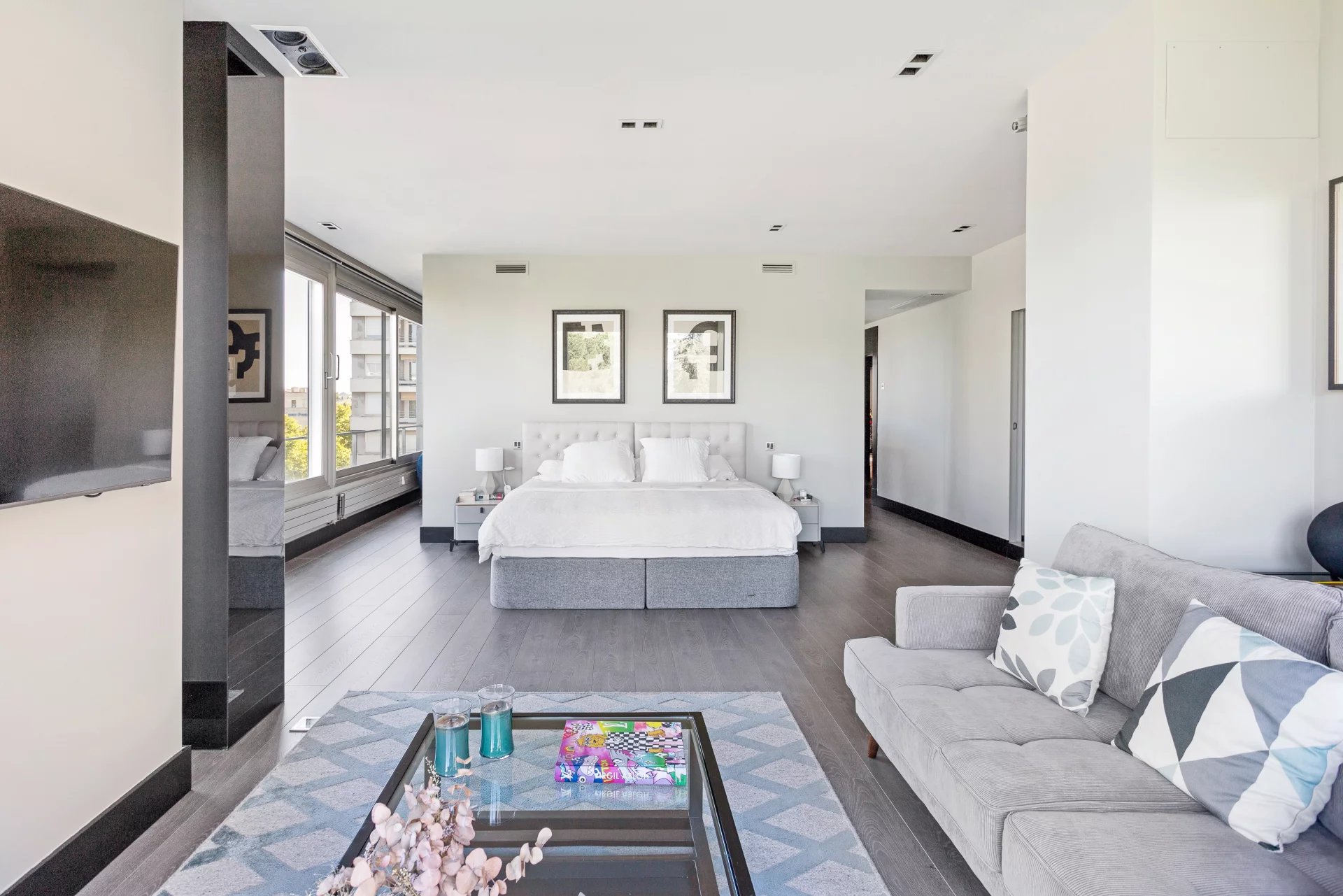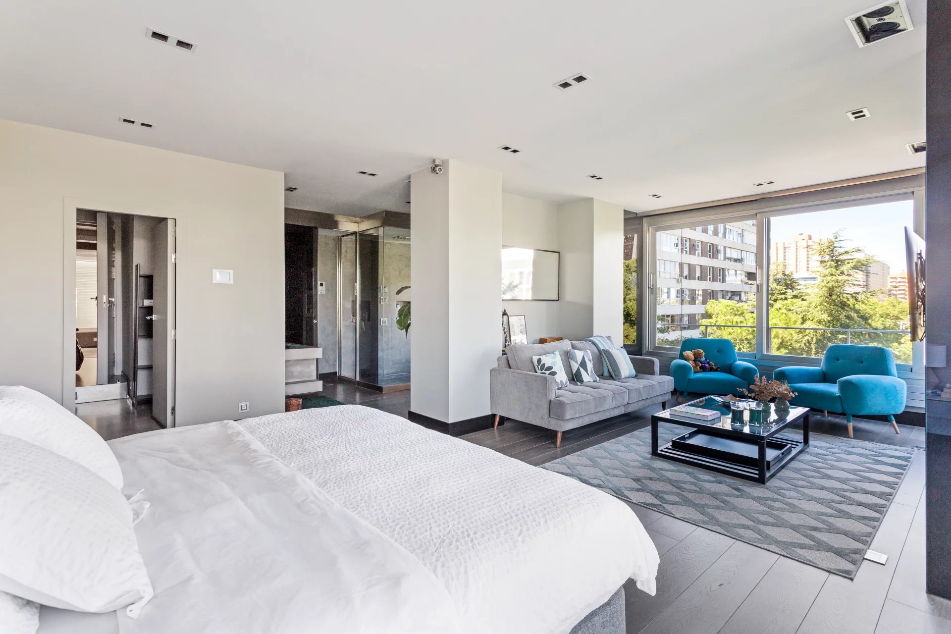 La suite principal constituye un auténtico espacio privado dentro de la vivienda, con salón propio, amplio vestidor y un refinado baño con luz natural. La zona de descanso se completa con un segundo dormitorio en suite, garantizando confort y privacidad.