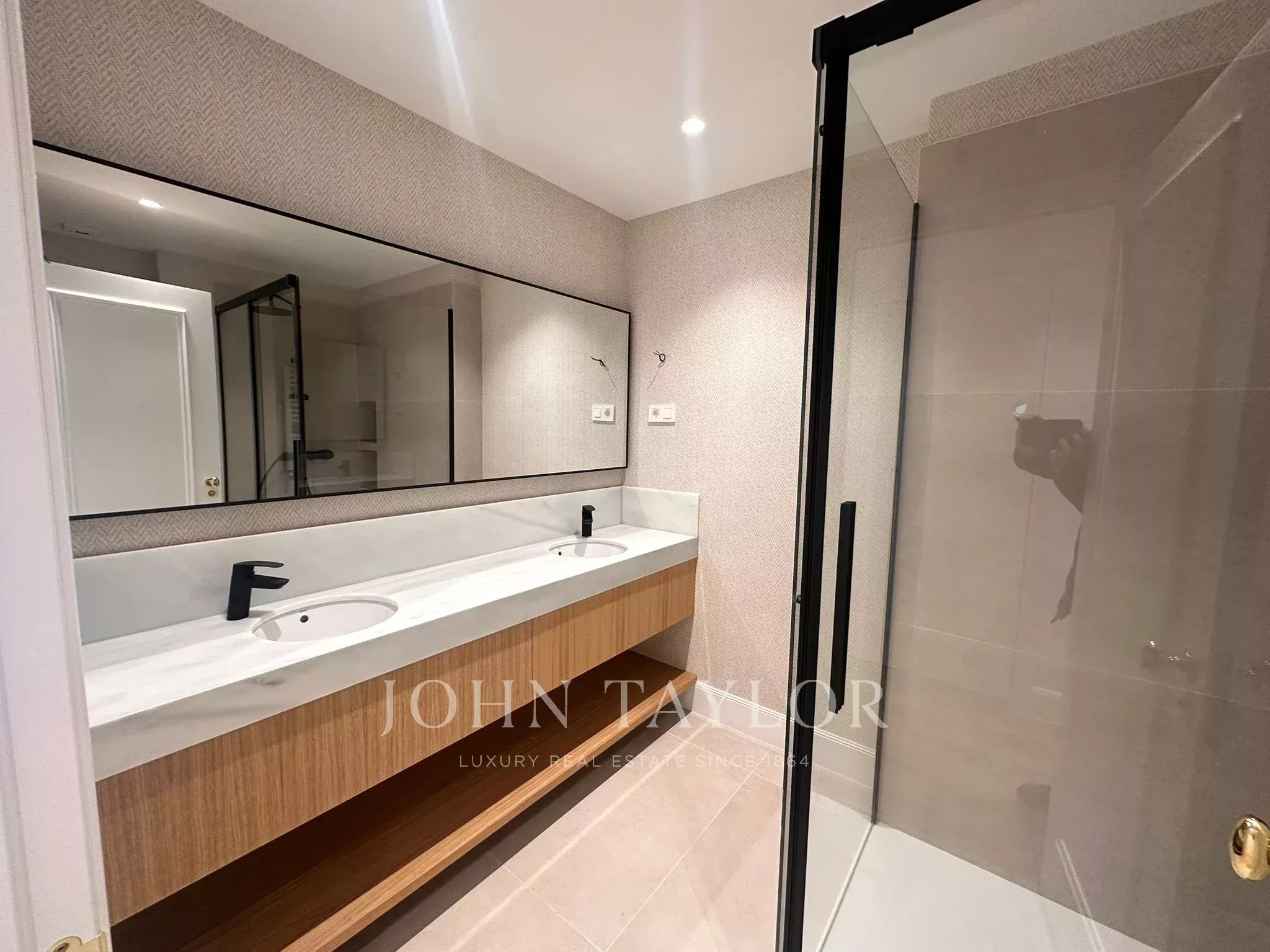 El dormitorio principal dispone de un elegante baño en suite, diseñado con líneas modernas y materiales de primera calidad.
