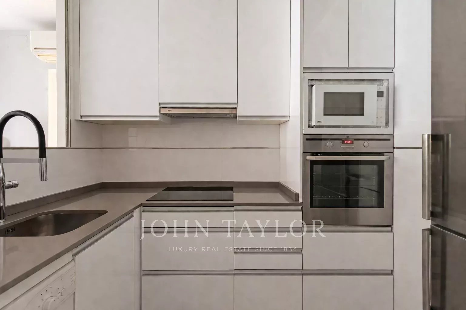 La magnífica cocina totalmente equipada con electrodomésticos de alta gama y con cerramiento de cristal y vistas al salón.