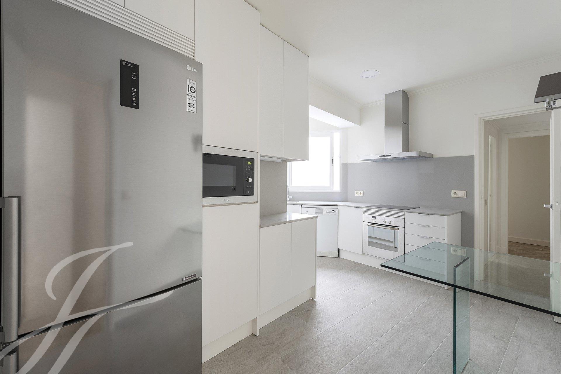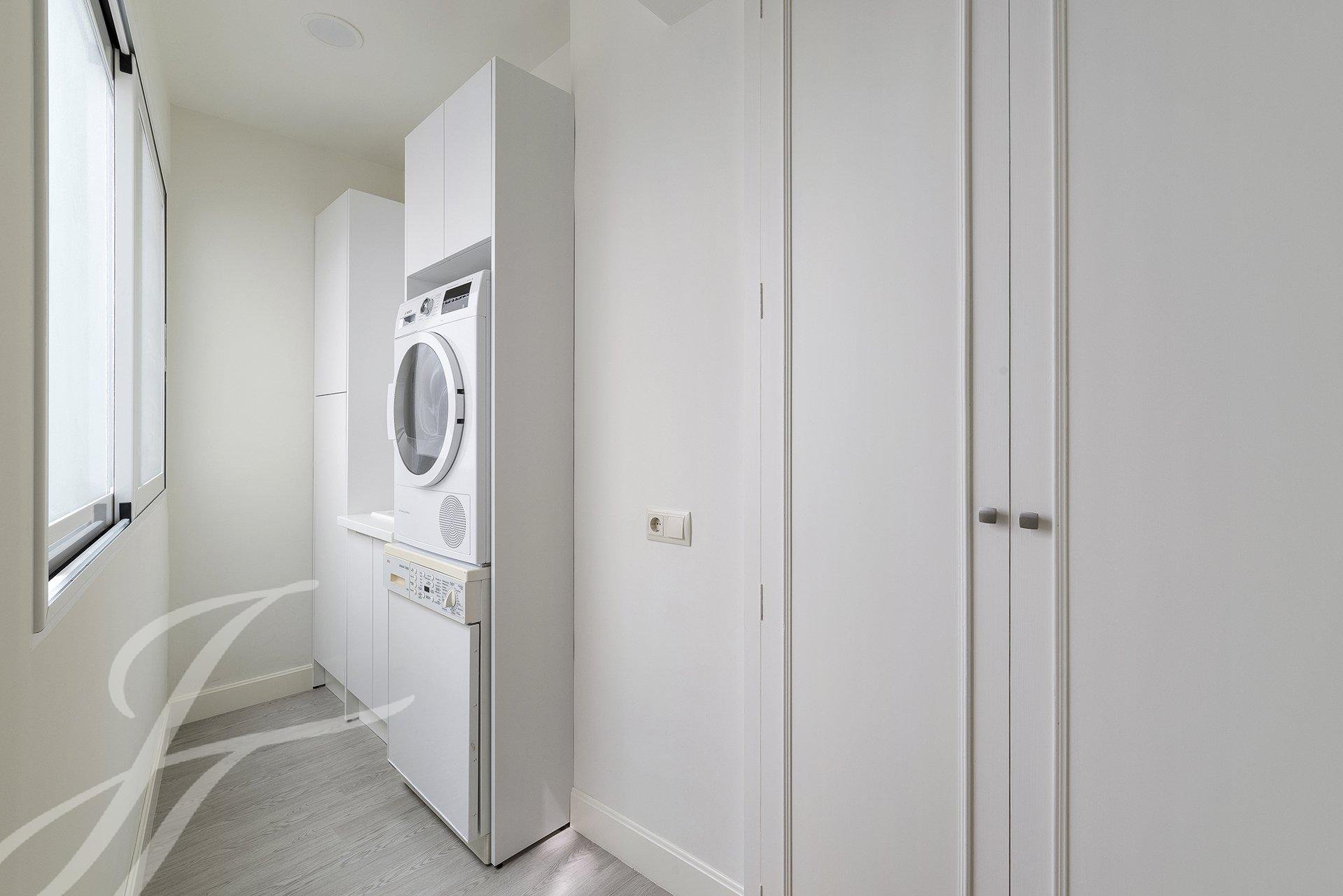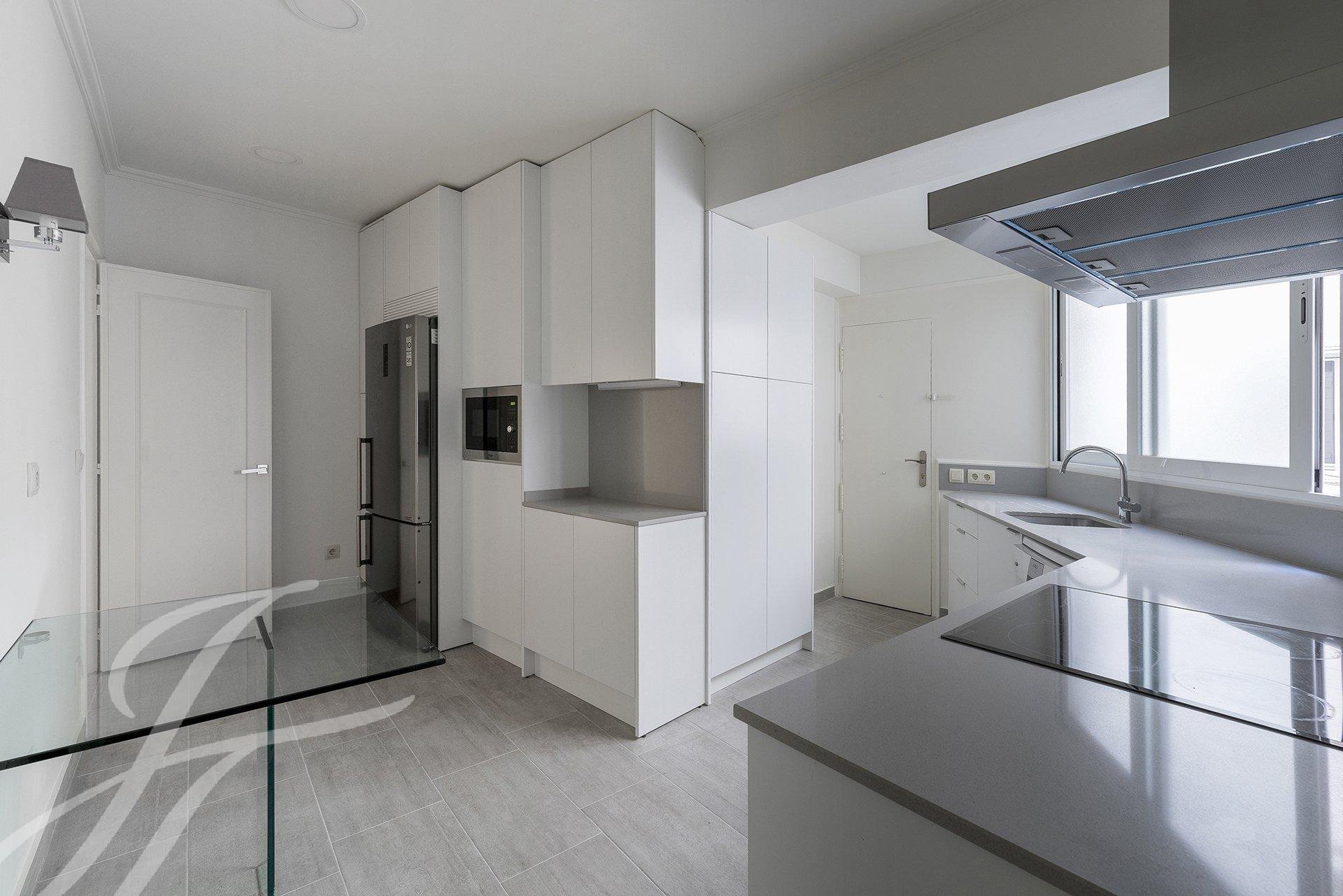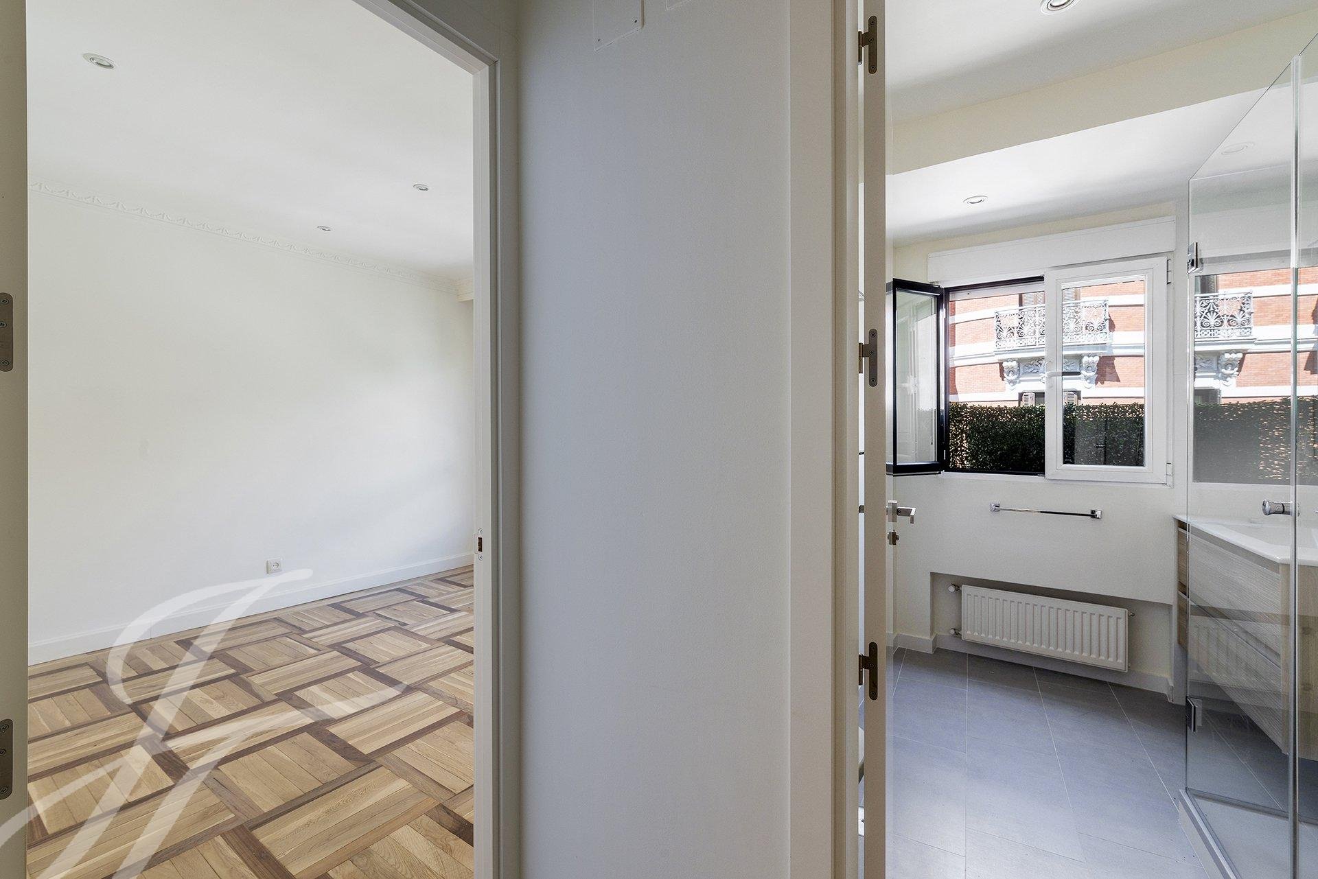 El salón en chaflán es el corazón de la casa, ofreciendo una fantástica luminosidad y sensación de espacio, además de múltiples posibilidades de distribución del mobiliario. En el verano, la altura de los árboles nos ofrecerá sombra, frescor y tranquilidad. En el invierno, los edificios vecinos nos recordarán constantemente dónde estamos ubicados. La habitación principal cuenta con baño en suite, armarios empotrados y vestidor. La segunda habitación dispone de armarios empotrados y su propio baño completo, todo ello reformado y exterior, sin duda un lujo difícil de encontrar. La cocina nos ofrece todas las comodidades, así como cuarto de lavado y plancha, un baño de servicio completo y su propia entrada de servicio.