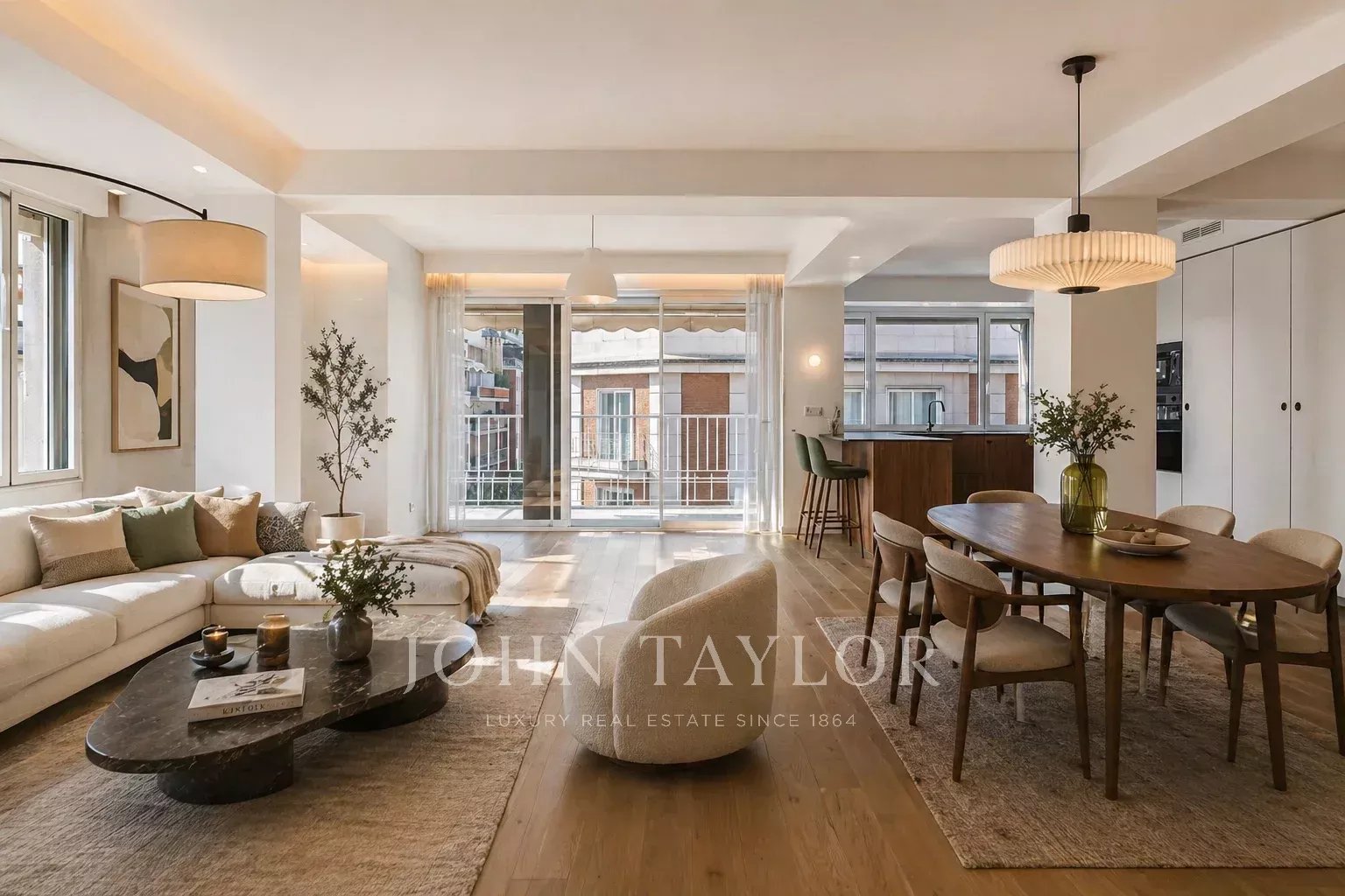 La cocina abierta, de líneas contemporáneas, se integra con elegancia en el conjunto, equipada con electrodomésticos de alta gama y pensada tanto para el uso diario como para recibir.