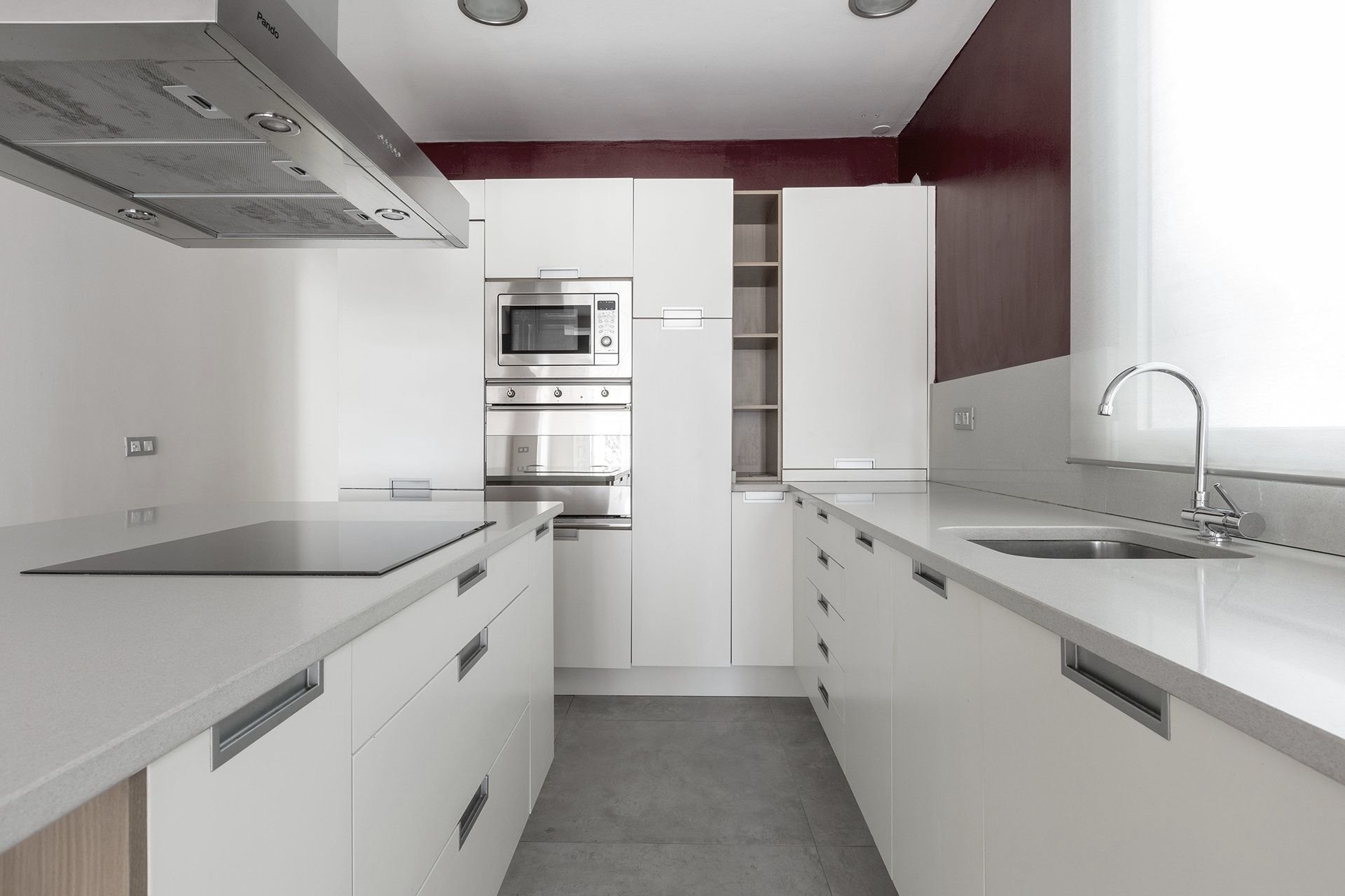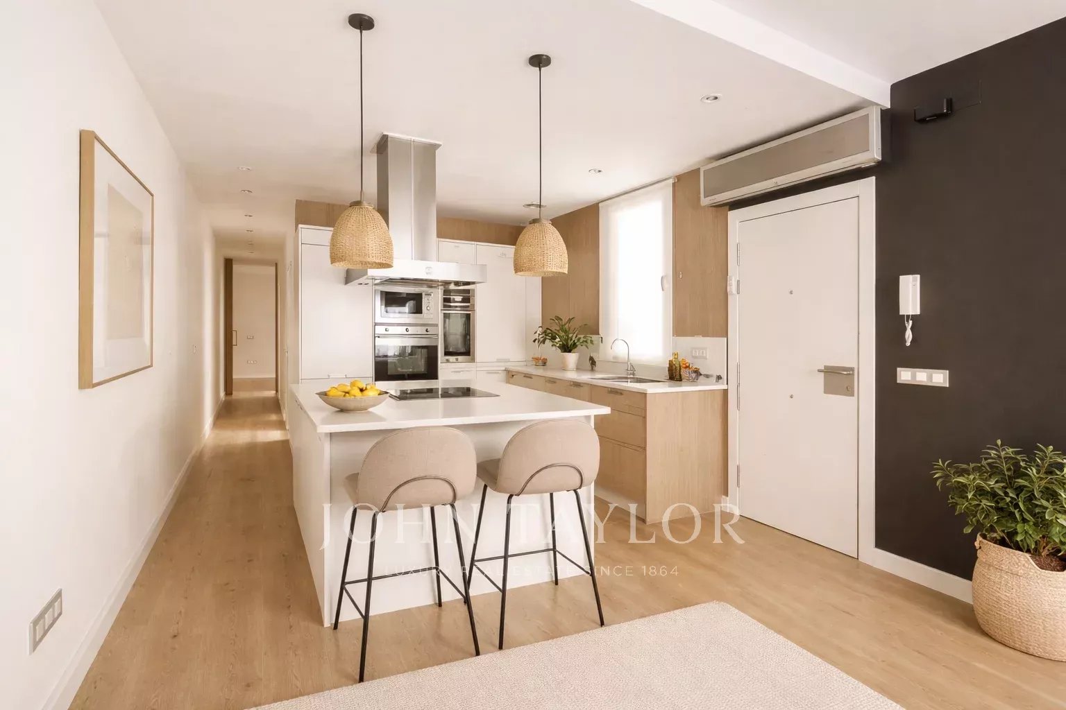 Ubicado en una tercera planta exterior, este apartamento de 105 m² destaca por su amplitud, luminosidad y cuidada distribución. La zona de día se articula en torno a un espectacular espacio abierto de aproximadamente 45 m² que integra salón, comedor y cocina, concebido para una experiencia de vida contemporánea. La cocina, equipada con electrodomésticos Bosch y una refinada isla central, aporta equilibrio entre estética y funcionalidad.