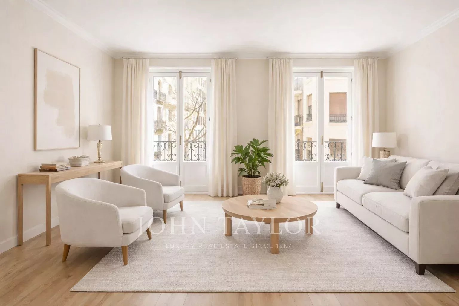 Esta elegante vivienda se sitúa en una tranquila y luminosa calle a escasos metros de la Glorieta de Bilbao, en uno de los enclaves más dinámicos y deseados de Madrid.