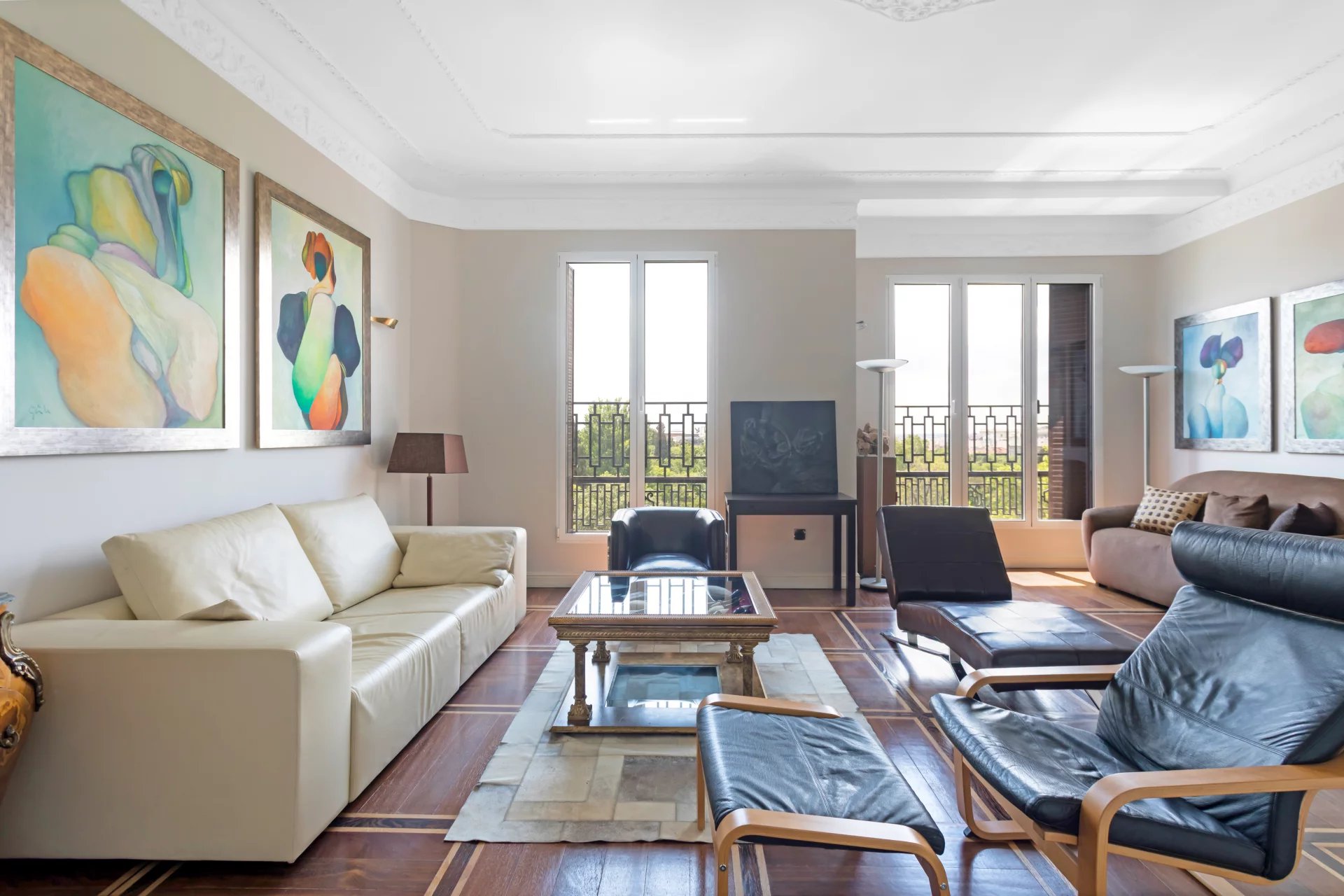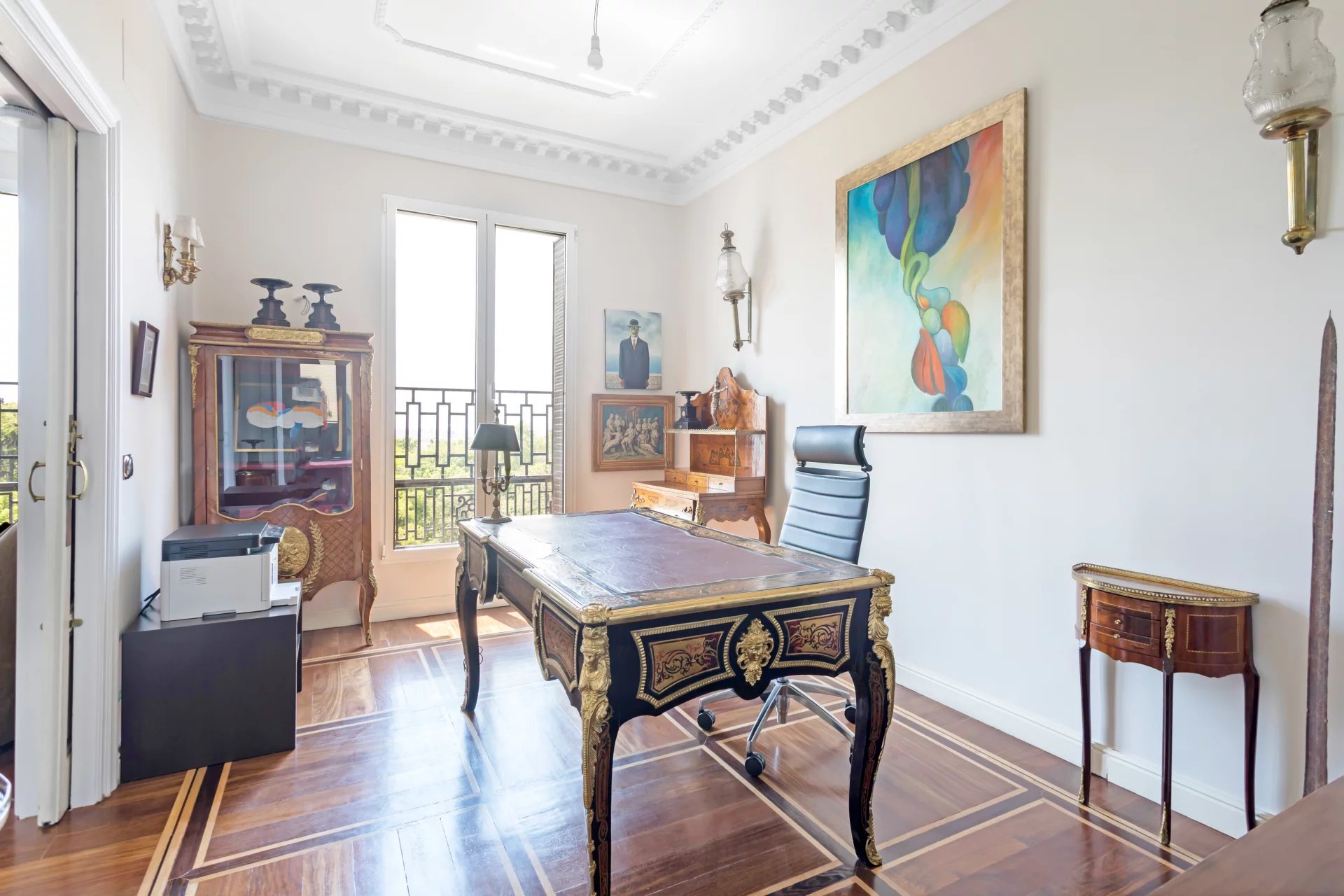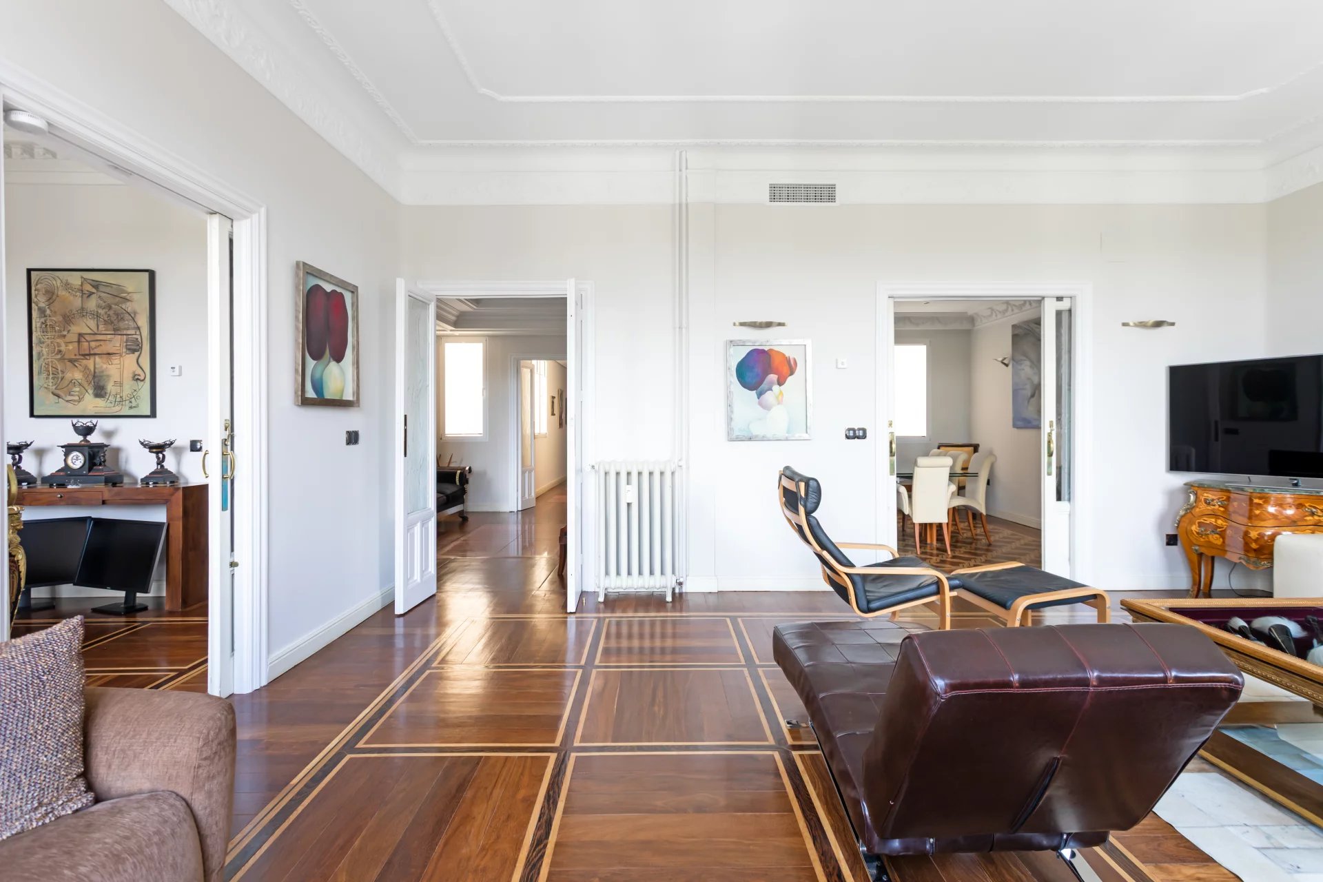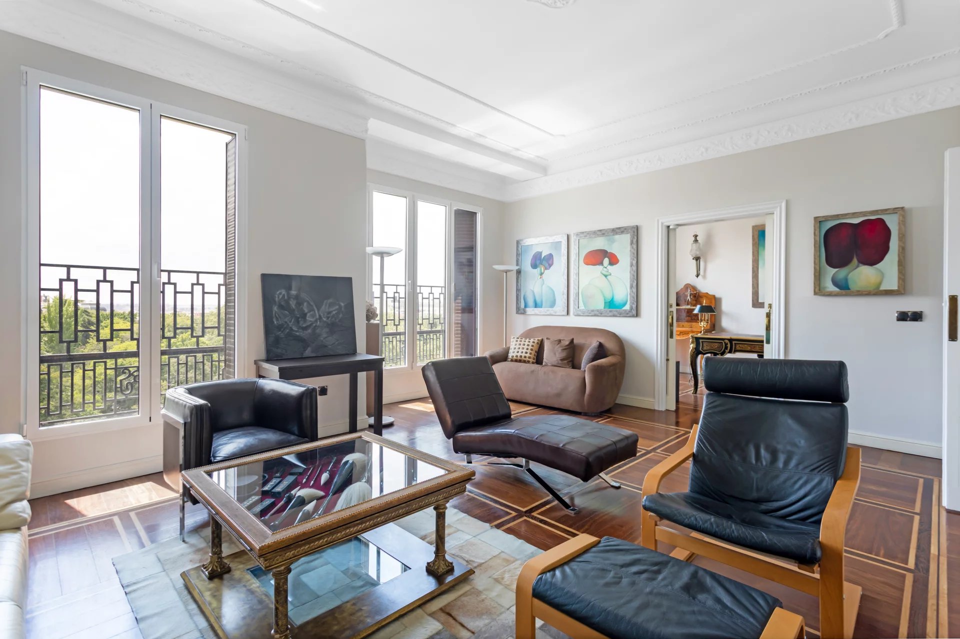 El doble salón y el despacho están bañados de luz natural con sus tres balcones que ofrecen vistas únicas al Jardín Botánico y orientación sur.