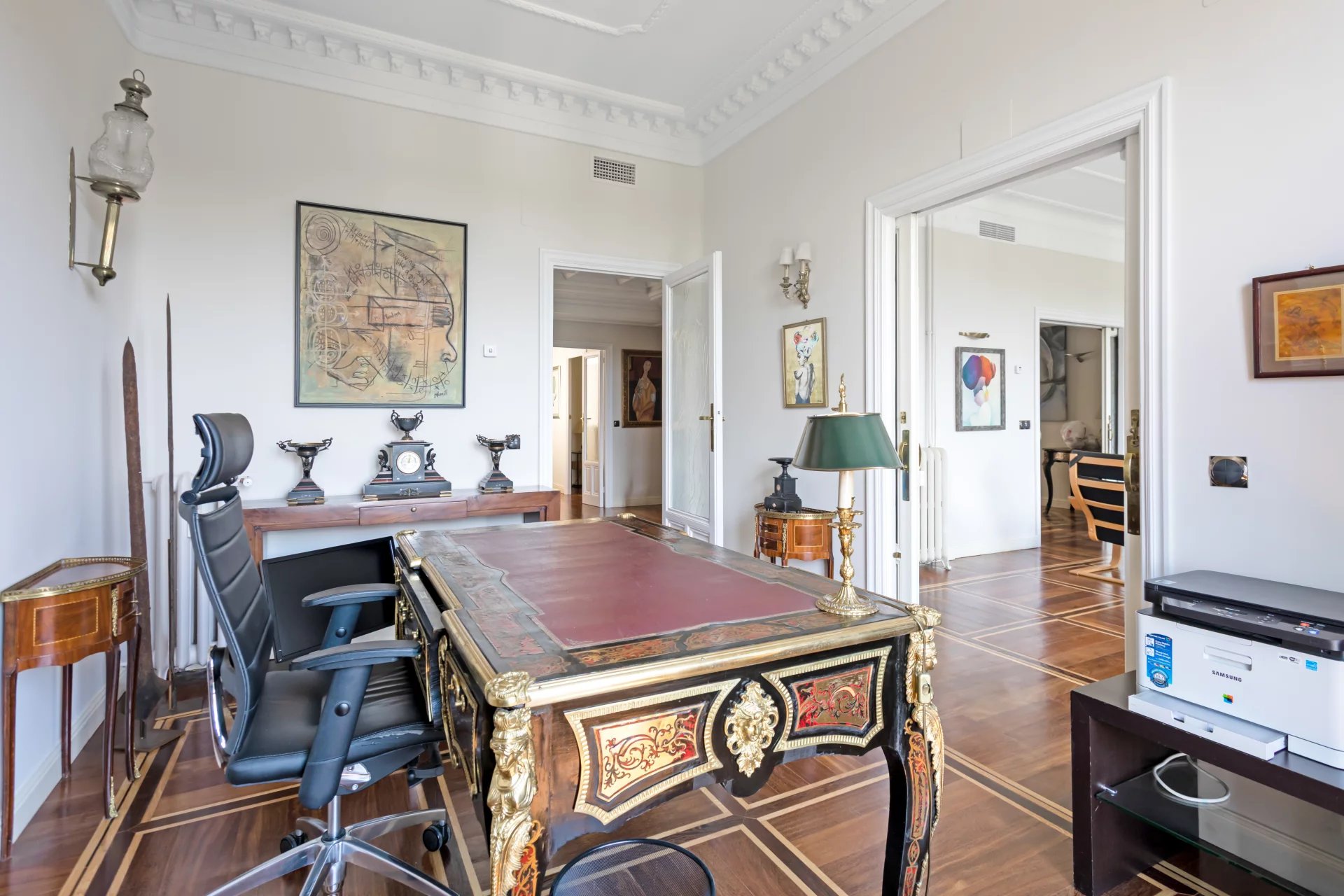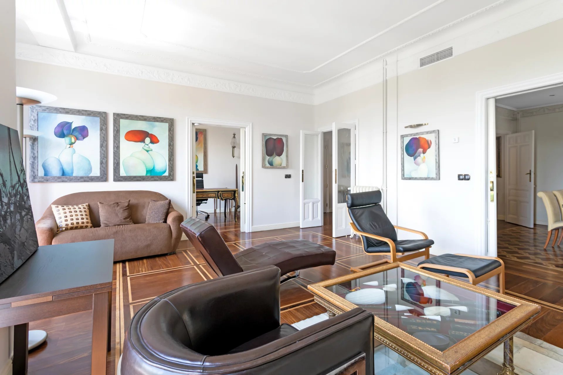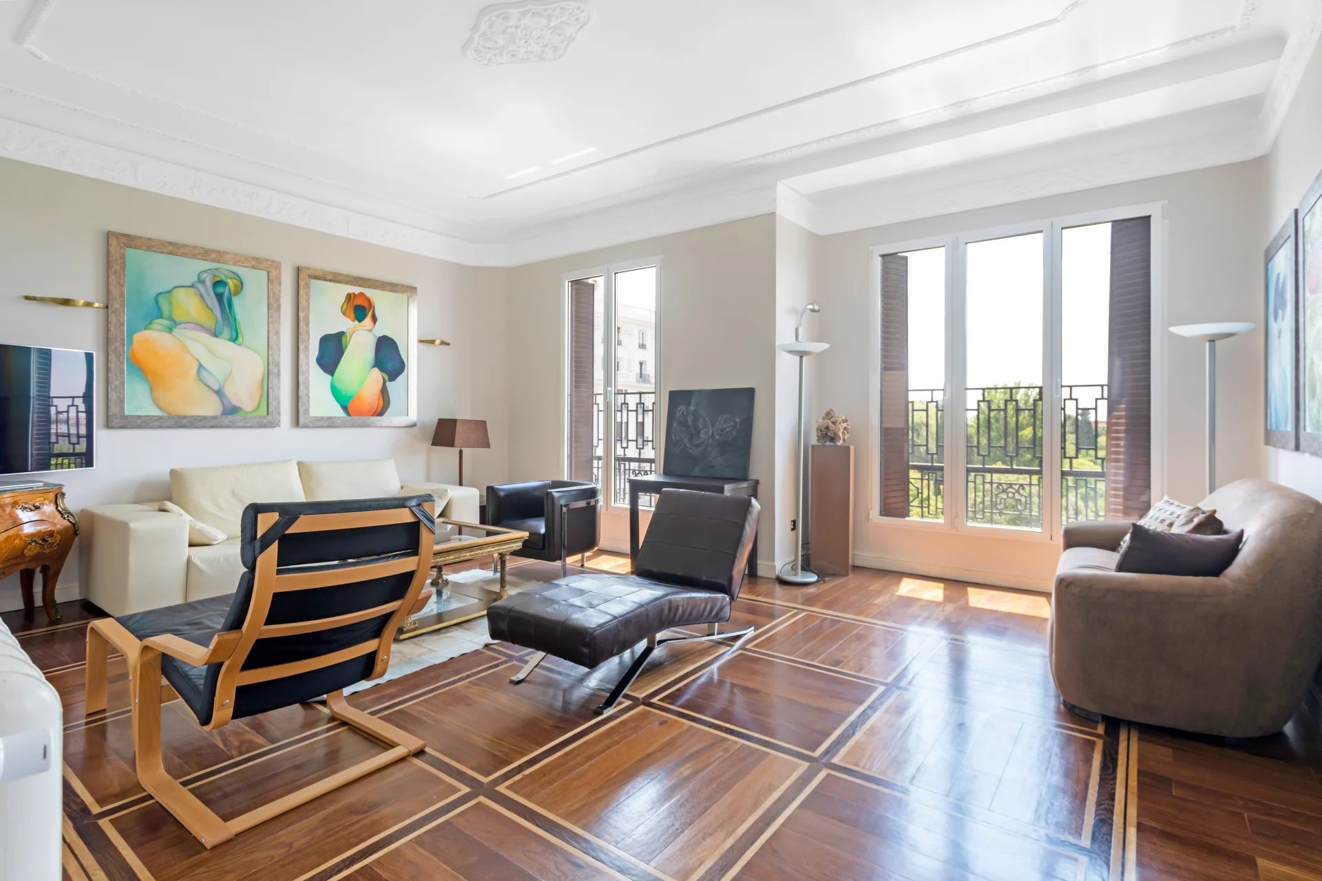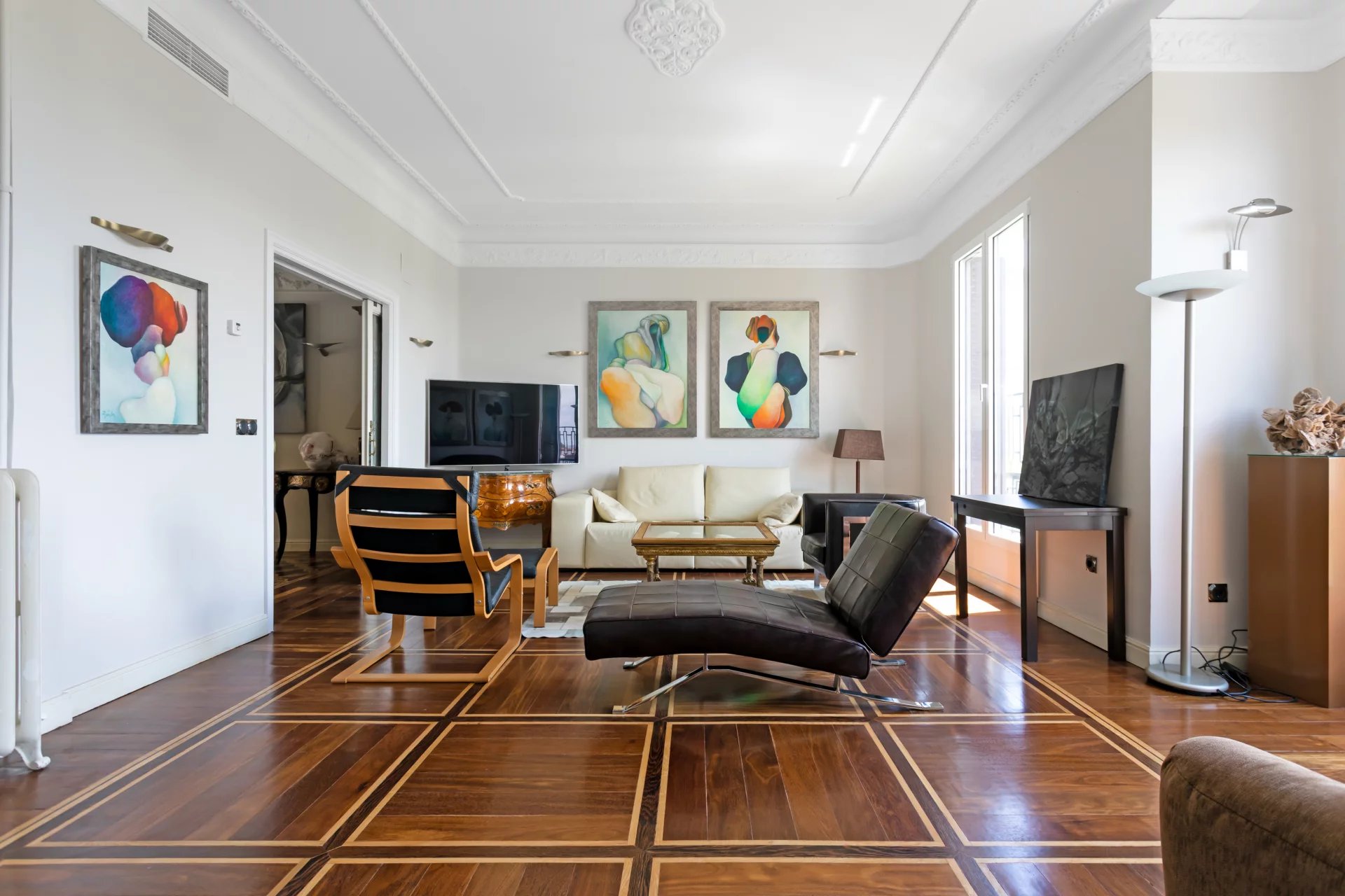 El doble salón y el despacho están bañados de luz natural con sus tres balcones que ofrecen vistas únicas al Jardín Botánico y orientación sur.