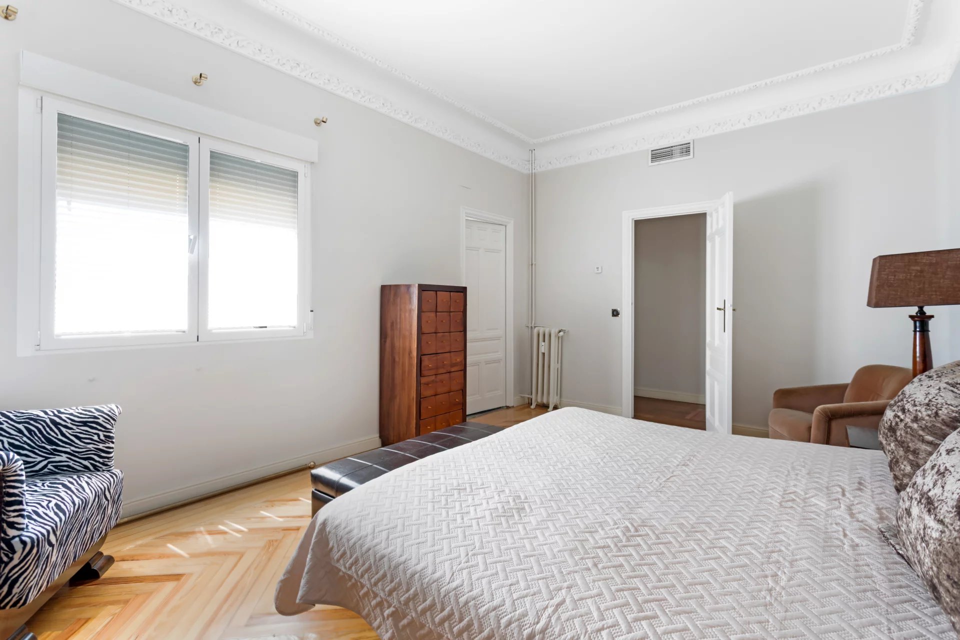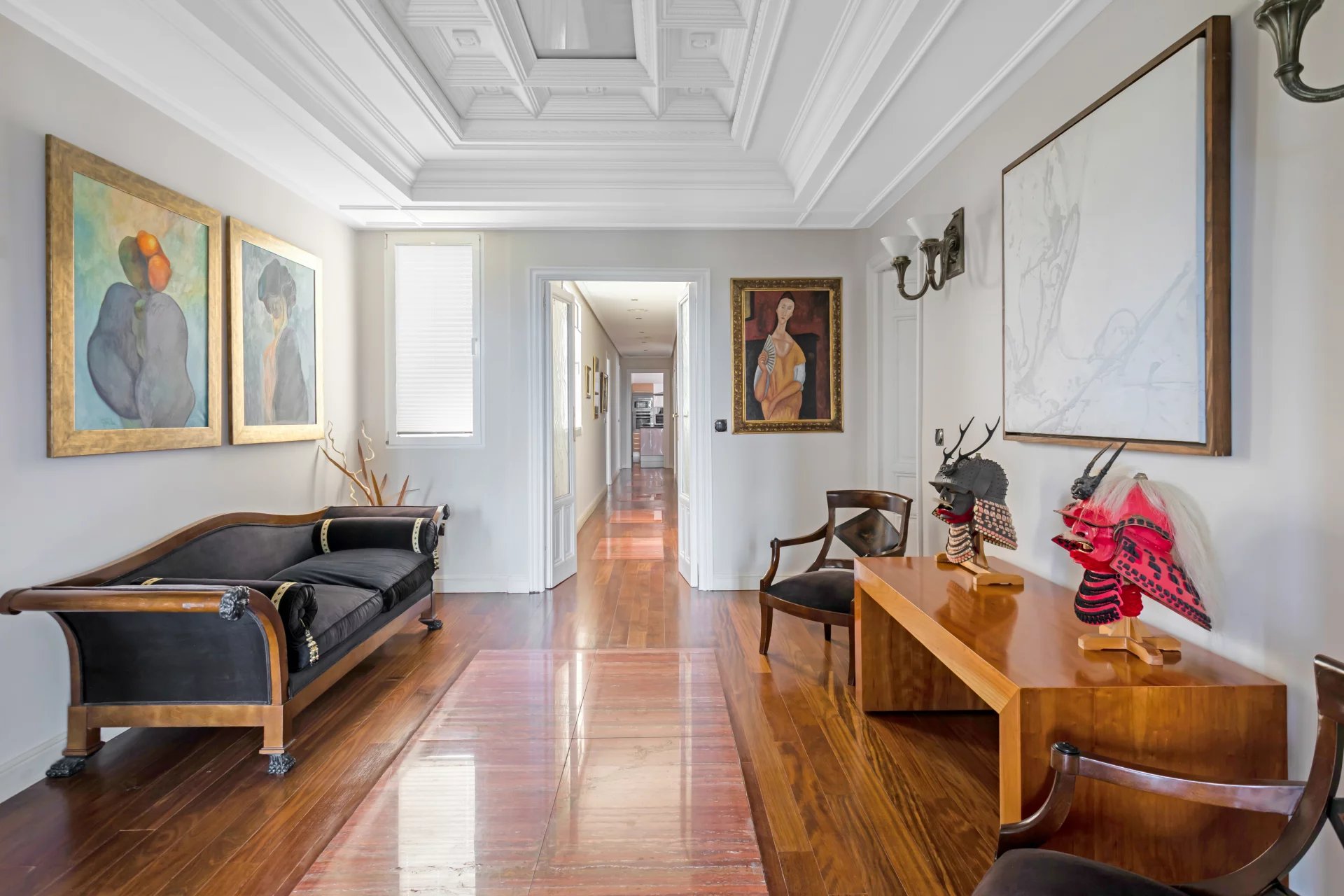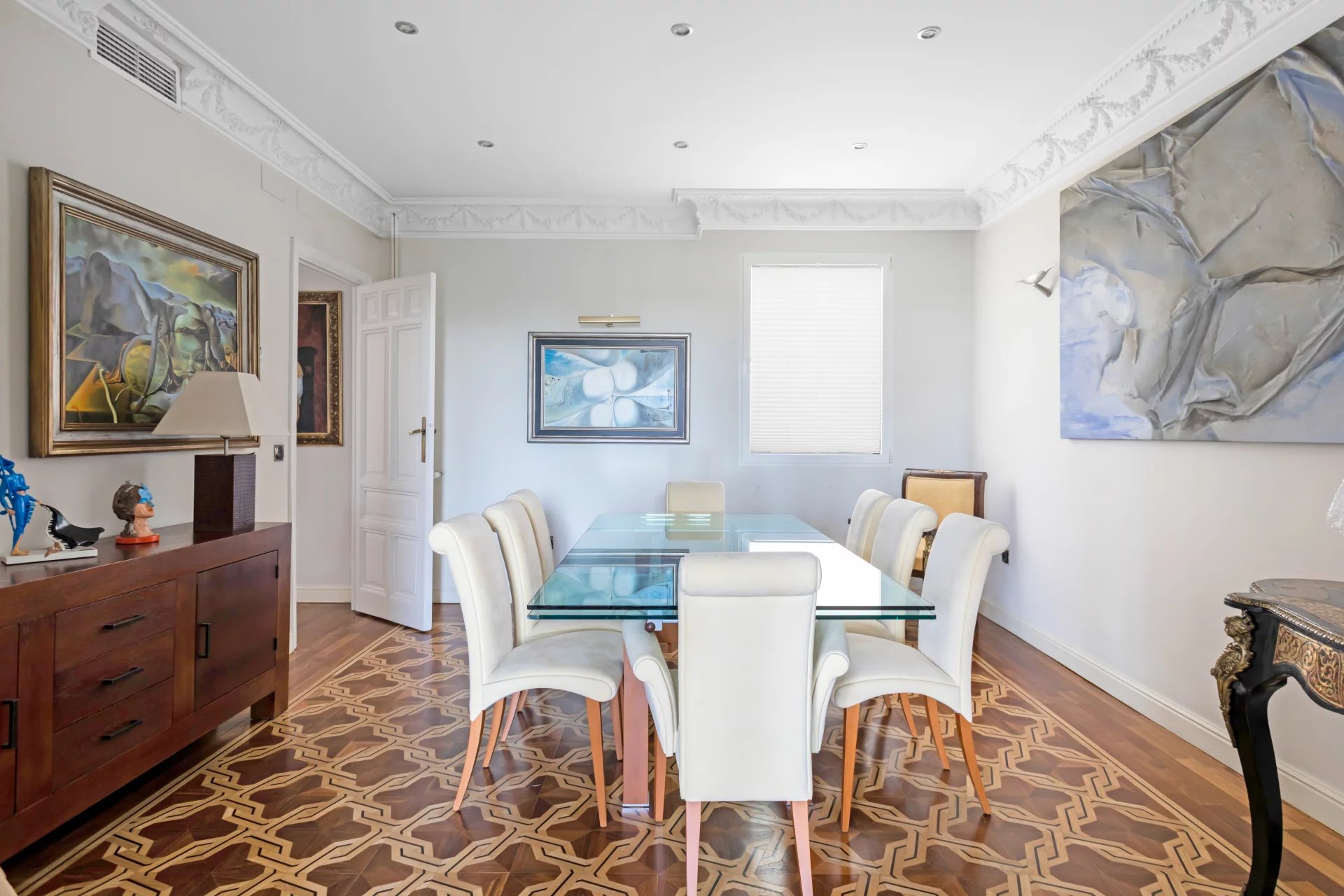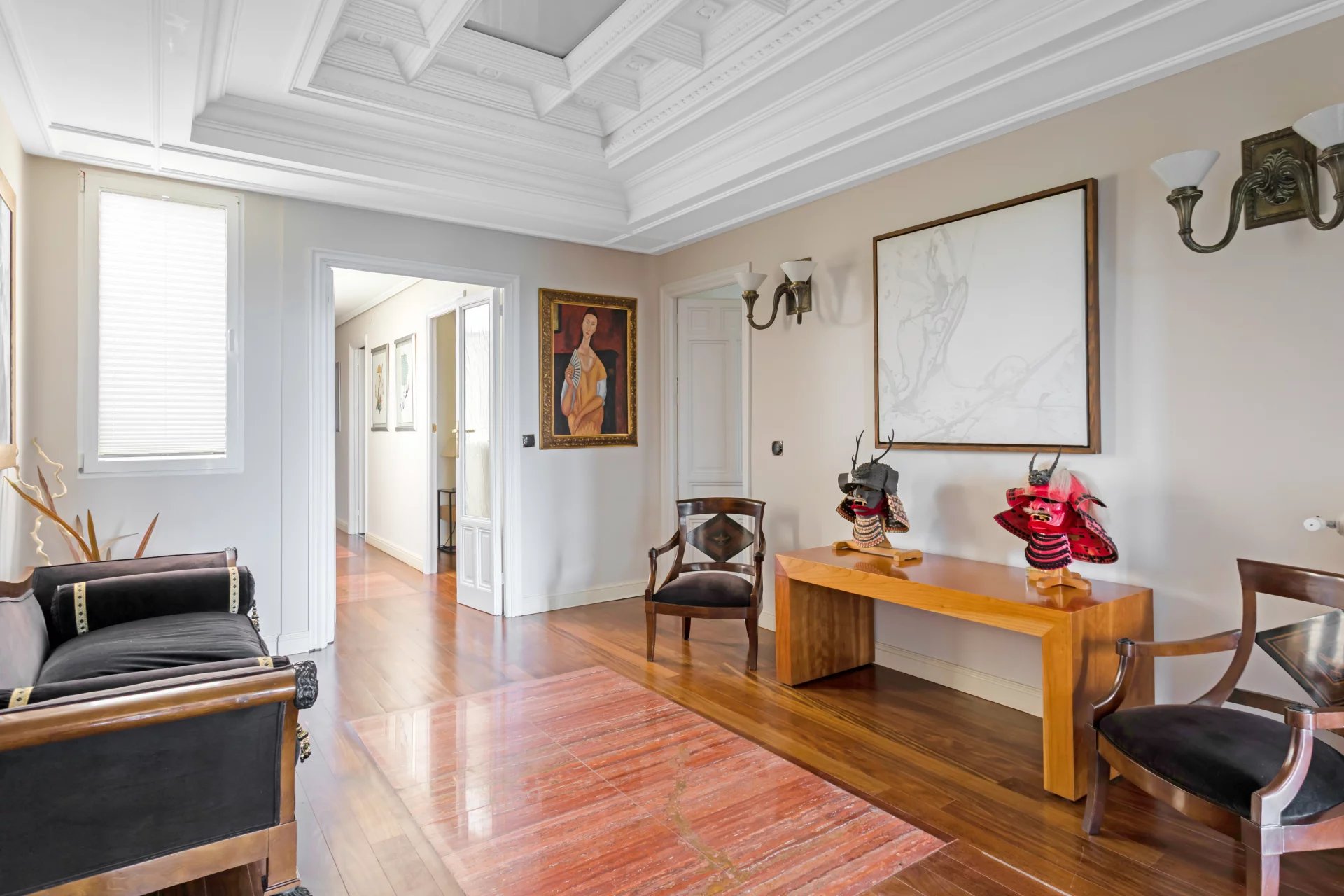 El doble salón y el despacho están bañados de luz natural con sus tres balcones que ofrecen vistas únicas al Jardín Botánico y orientación sur.