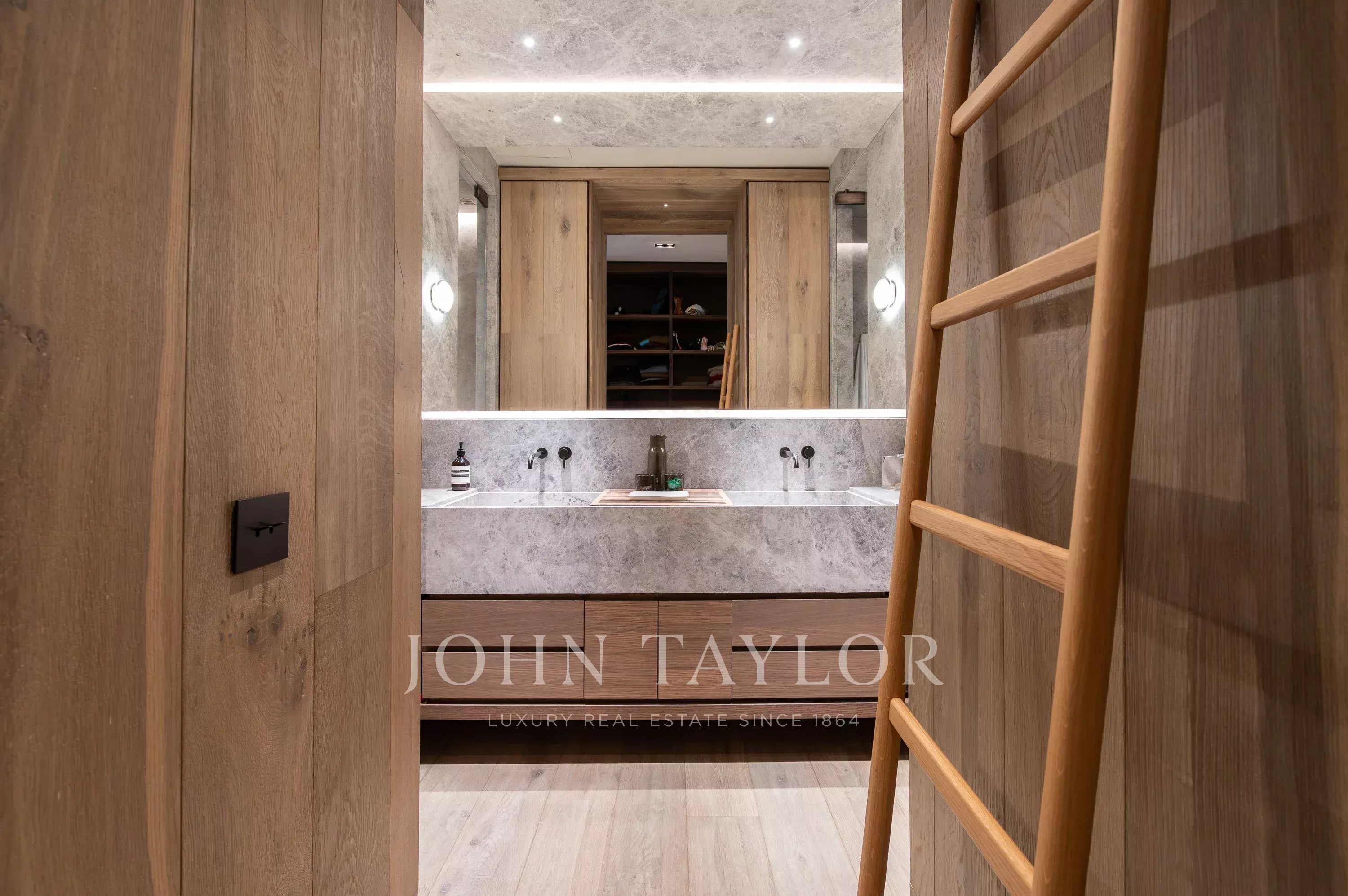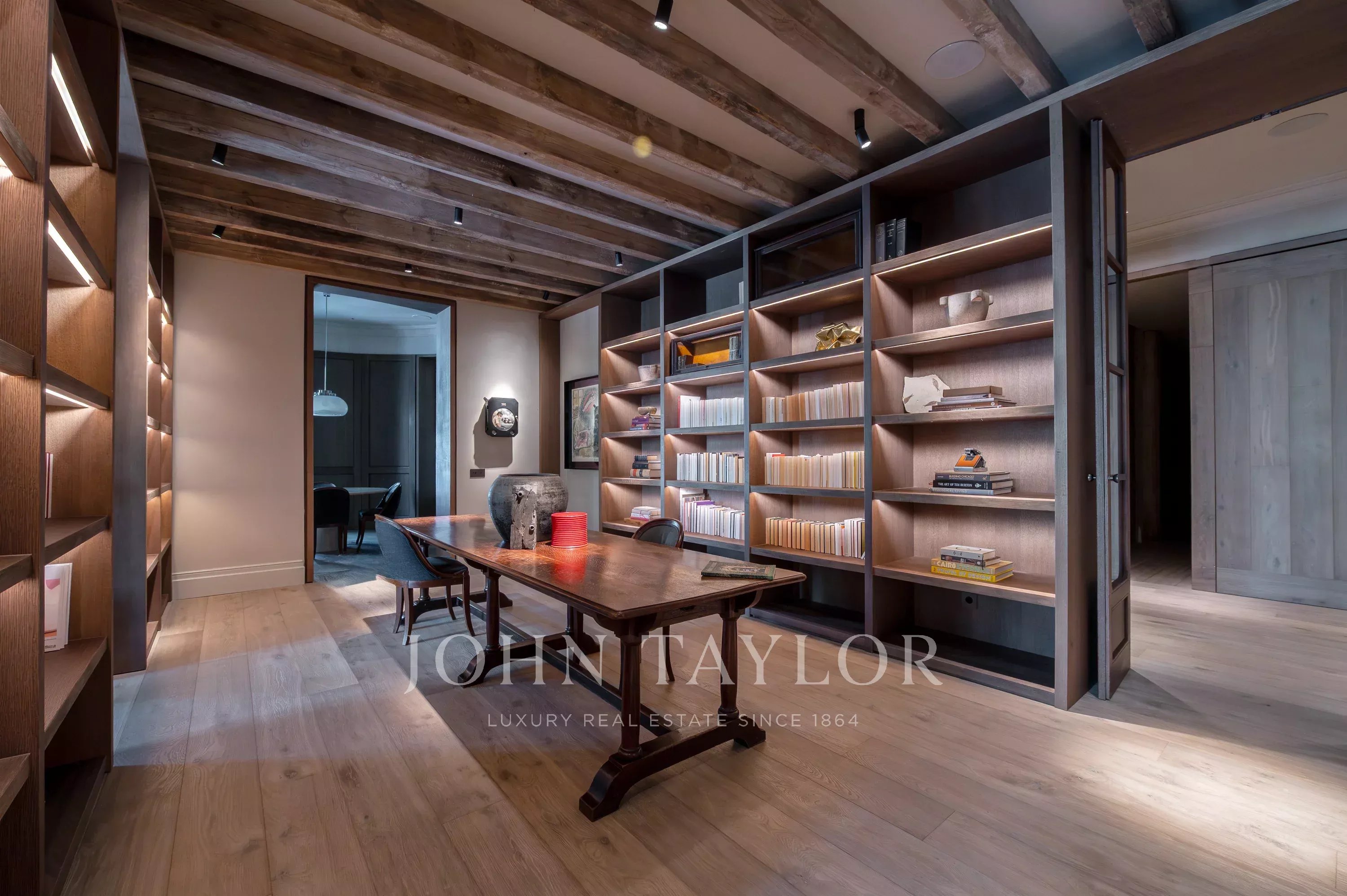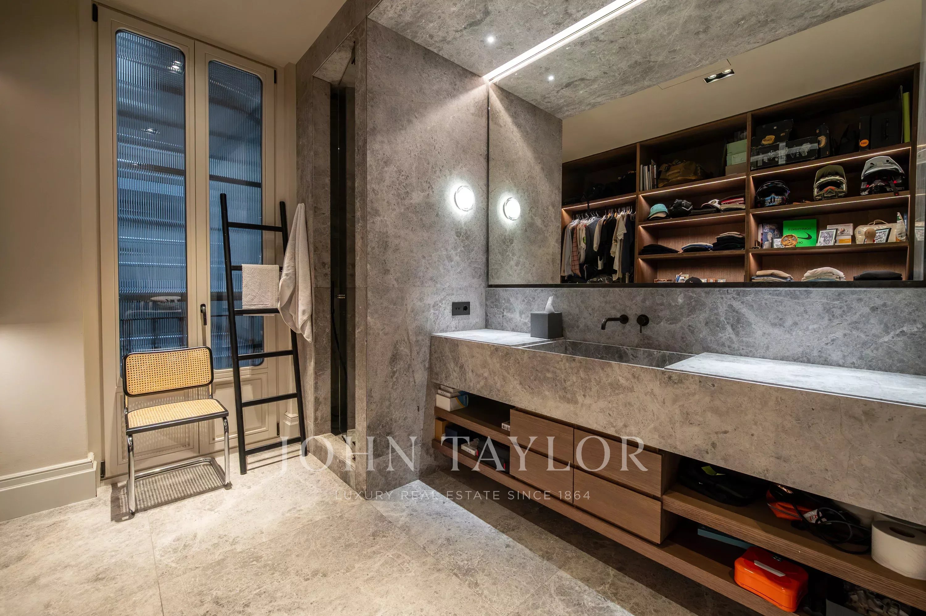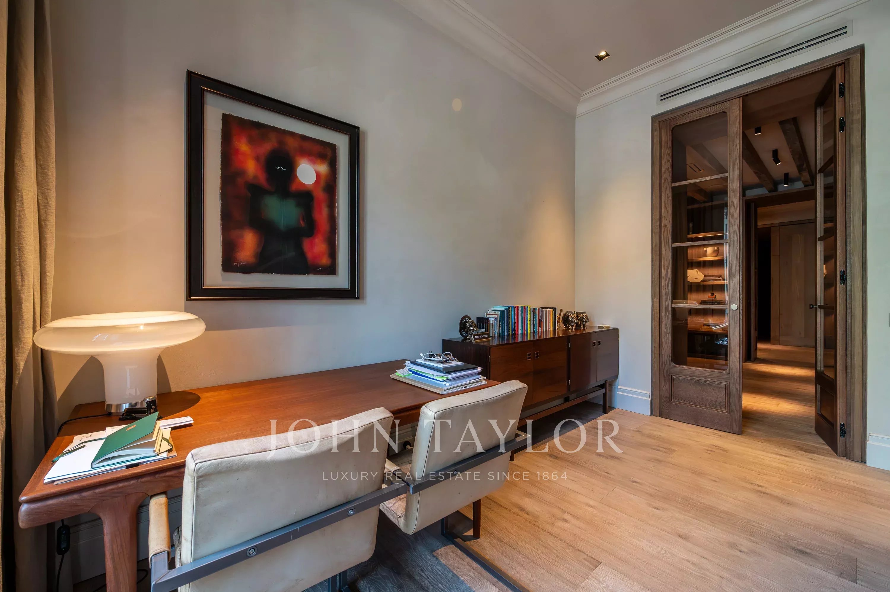 La suite principal se presenta como un auténtico oasis independiente, incorporando una elegante zona de despacho, un dormitorio con vistas privilegiadas a la calle Alcalá, un amplio vestidor diseñado para los amantes de la moda y un espectacular baño revestido en mármol.