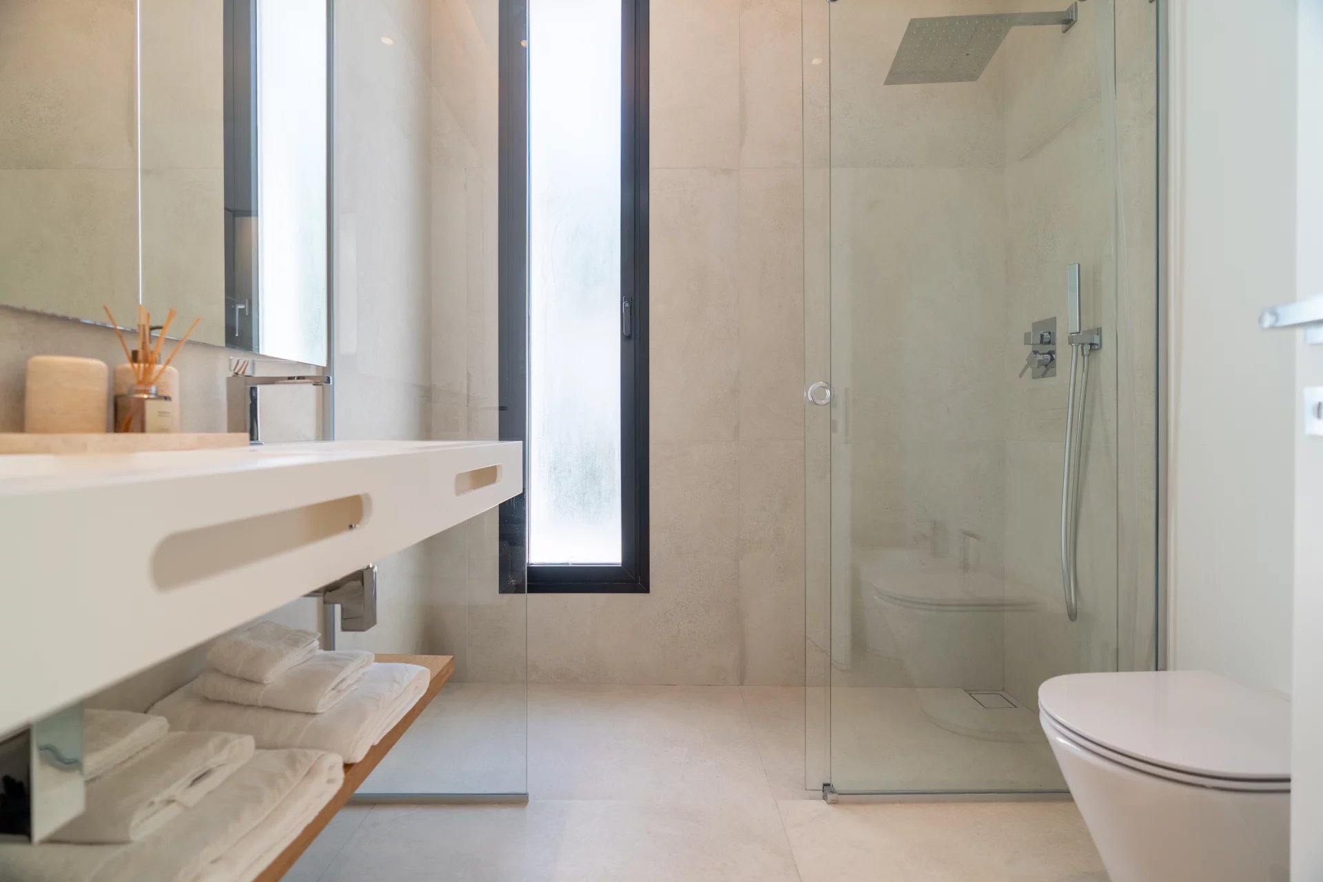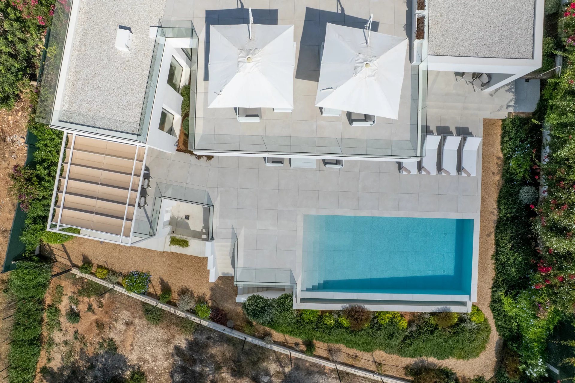 La villa ha sido construida con materiales de primer nivel e incluye comodidades como aire acondicionado central y suelo radiante, garantizando el máximo confort durante todo el año. Las amplias terrazas invitan a disfrutar del sol, organizar cenas al aire libre o simplemente relajarse con vistas espectaculares.