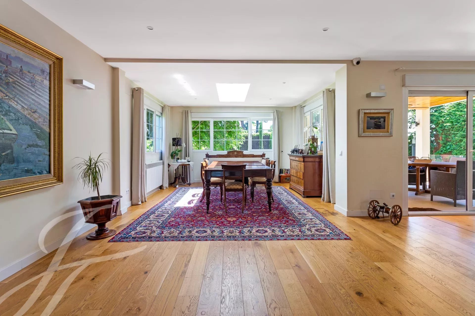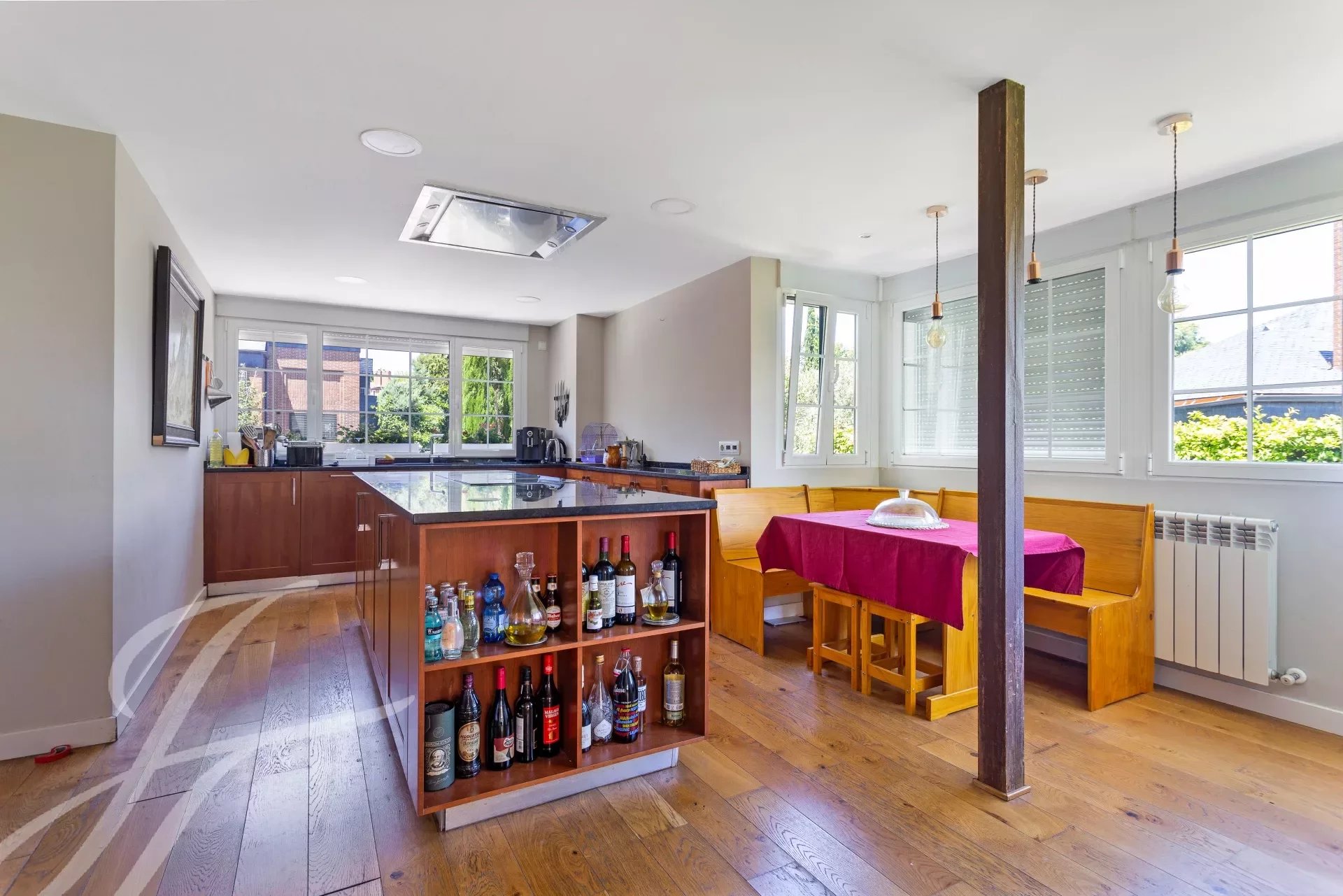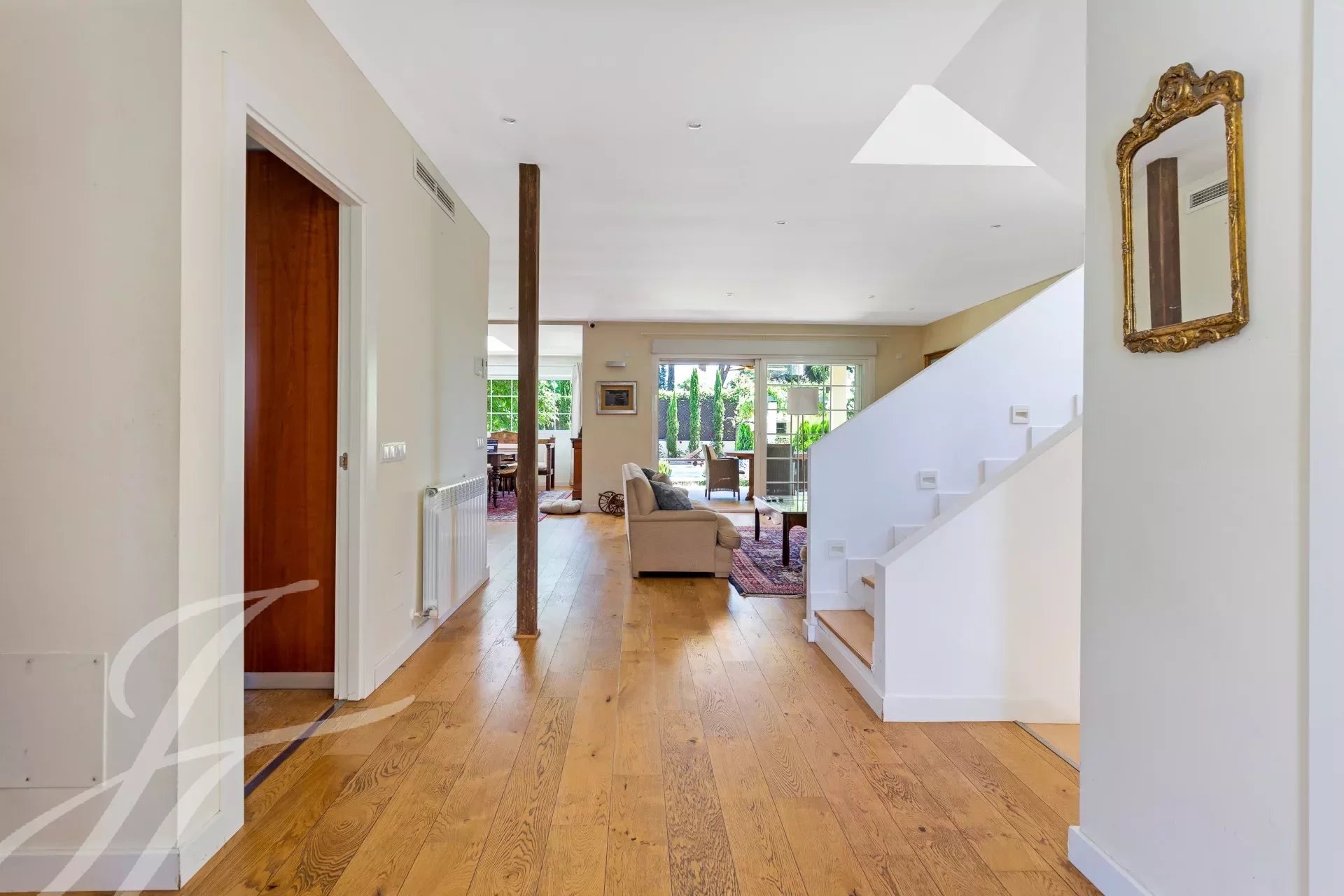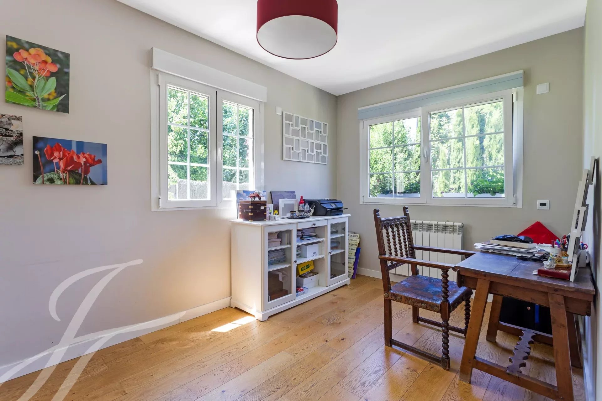 En la planta principal encontramos un amplio vestíbulo con apertura al salón y comedor que tiene salida al bonito y amplio jardín por el porche. Además, despacho, cocina con zona office y aseo de cortesía. Salón con chimenea y comedor conectado con la moderna y reformada cocina.