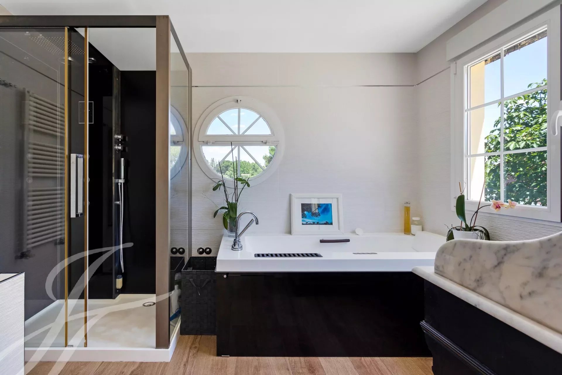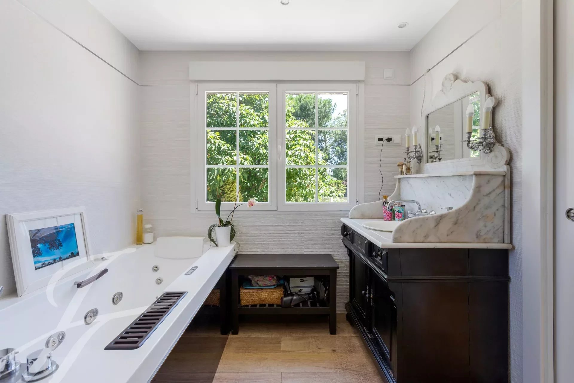 En la primera planta, el dormitorio principal con baño en suite, vestidor, y enorme terraza con vista al jardín y piscina. En el baño, bañera estilo jacuzzi, y cabina de vapor. Dos dormitorios adicionales con baño compartido.