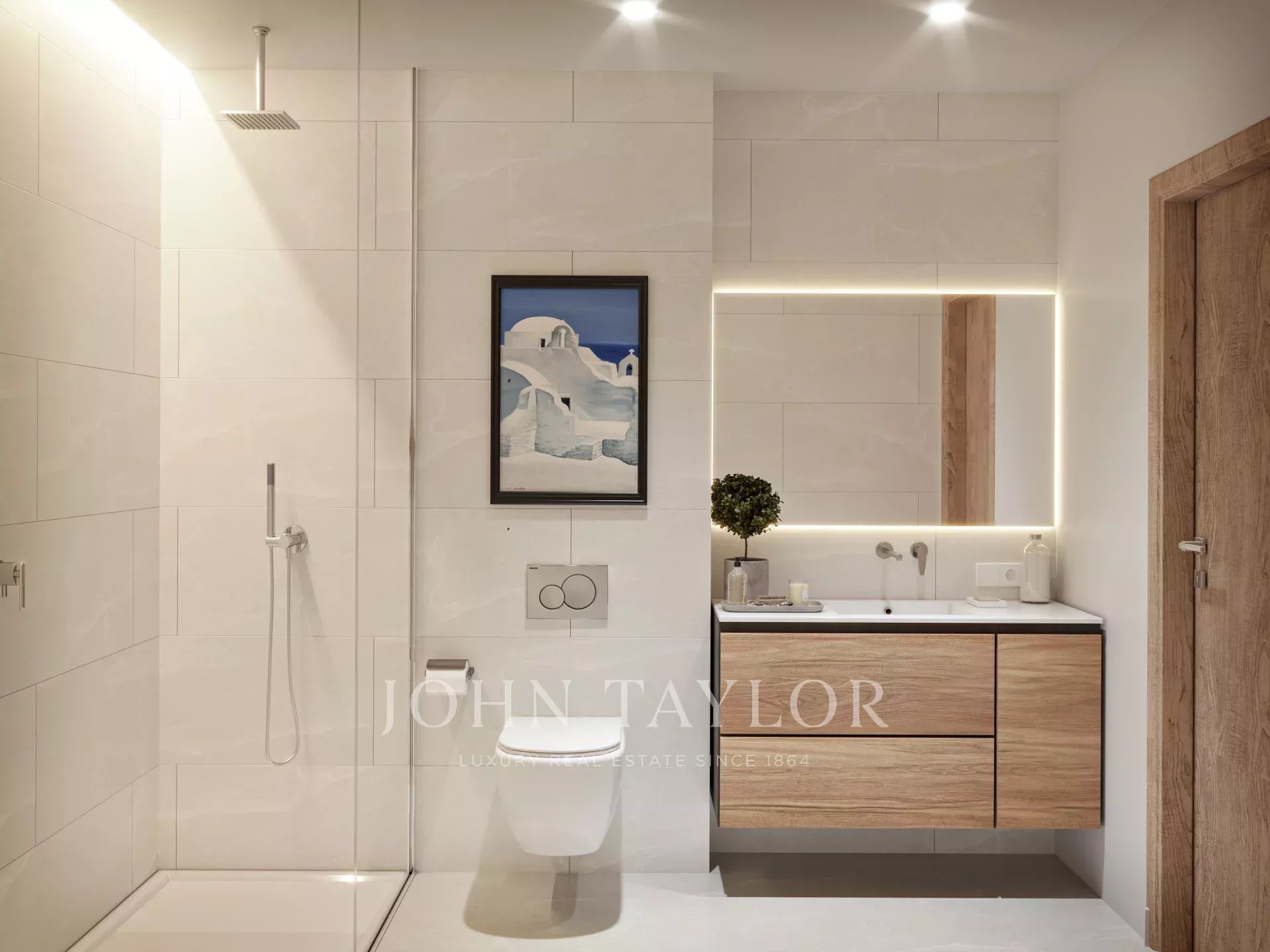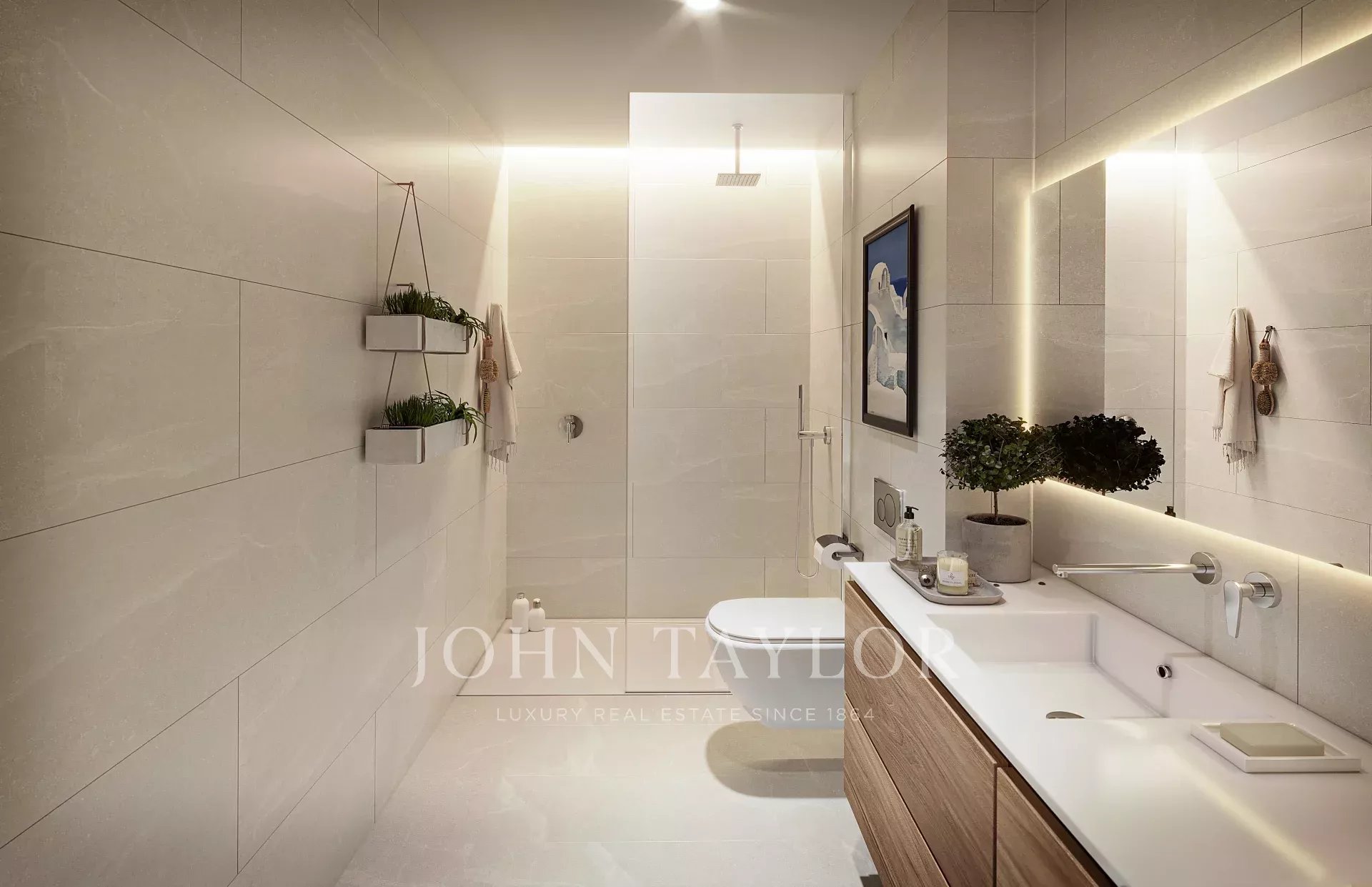 Los baños disponen de mueble alto de madera con uno o dos lavabos, ducha con plato de ducha y grifería encastrada de la casa Tres. La finalización de las obras está prevista para marzo 2026