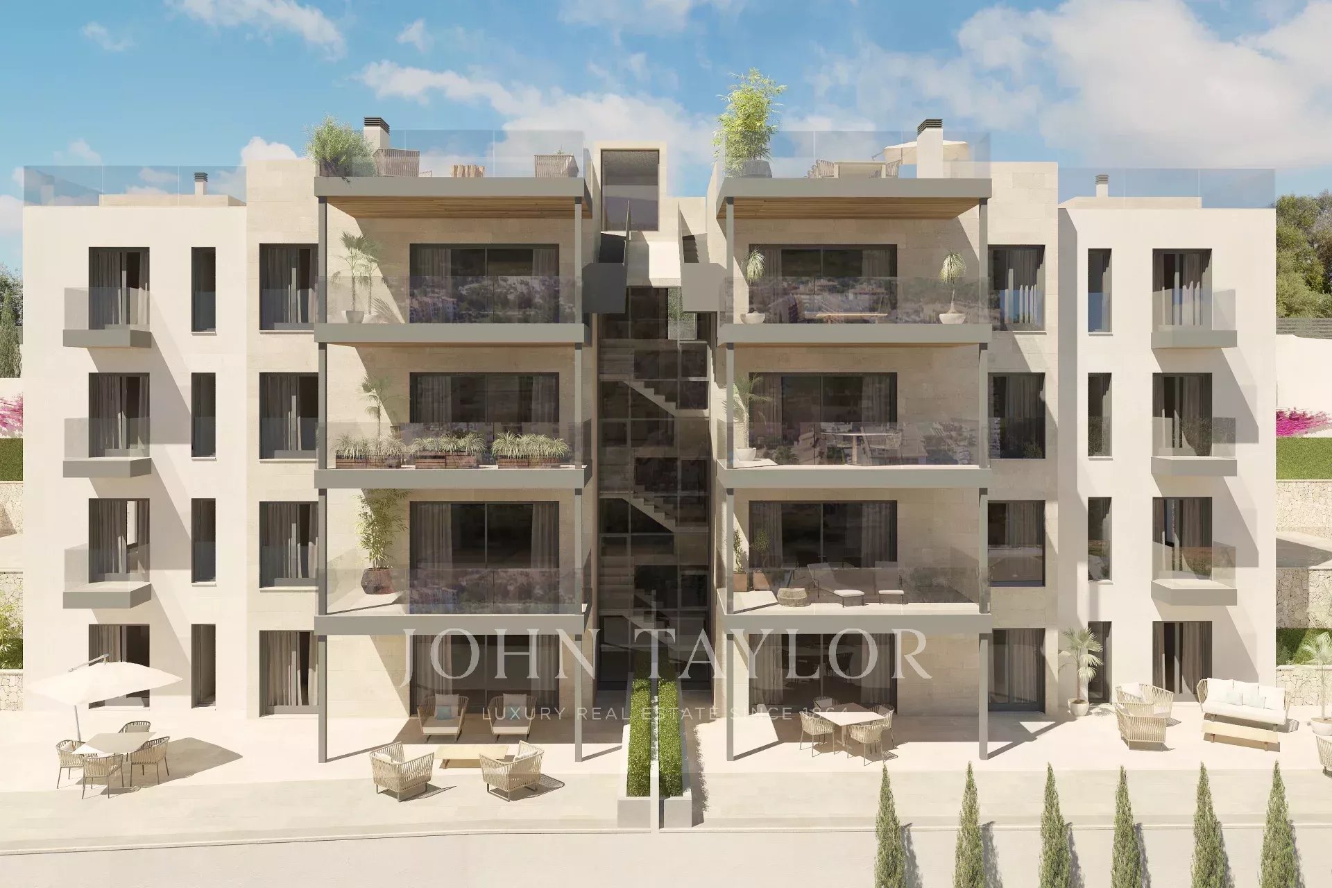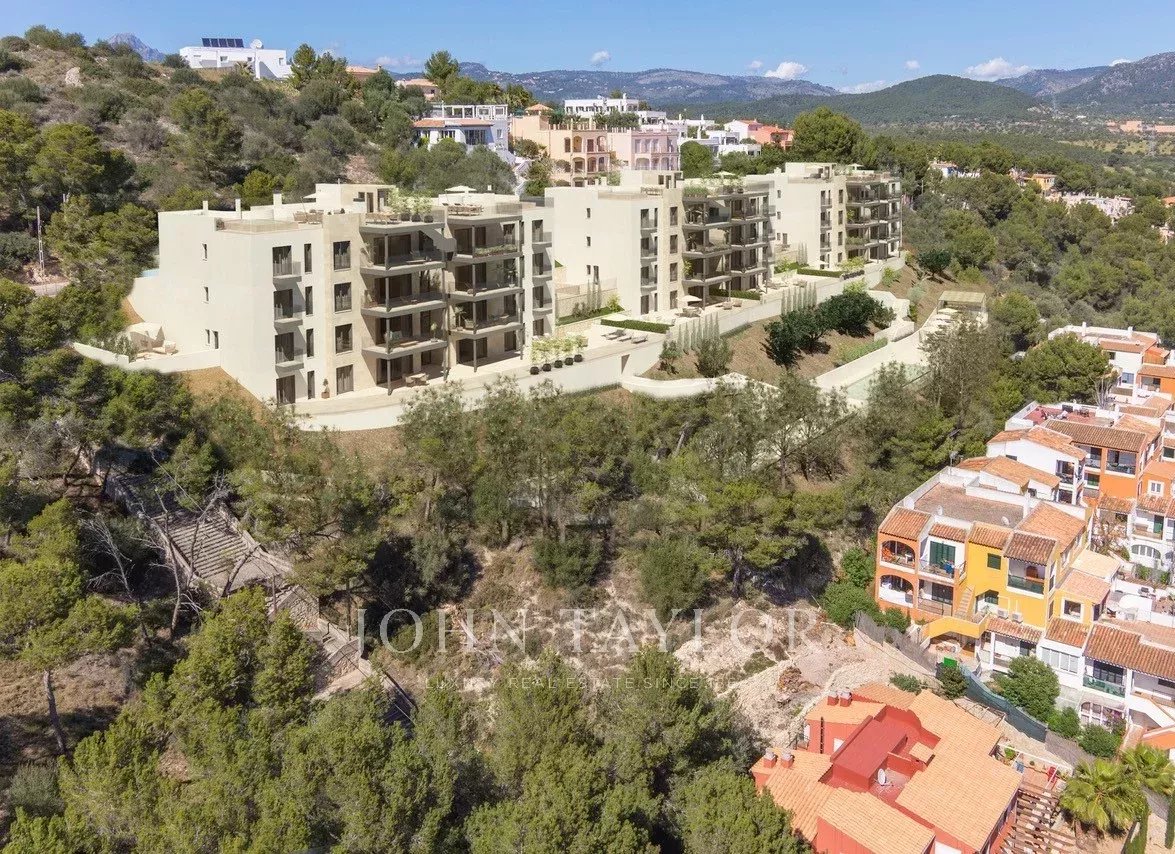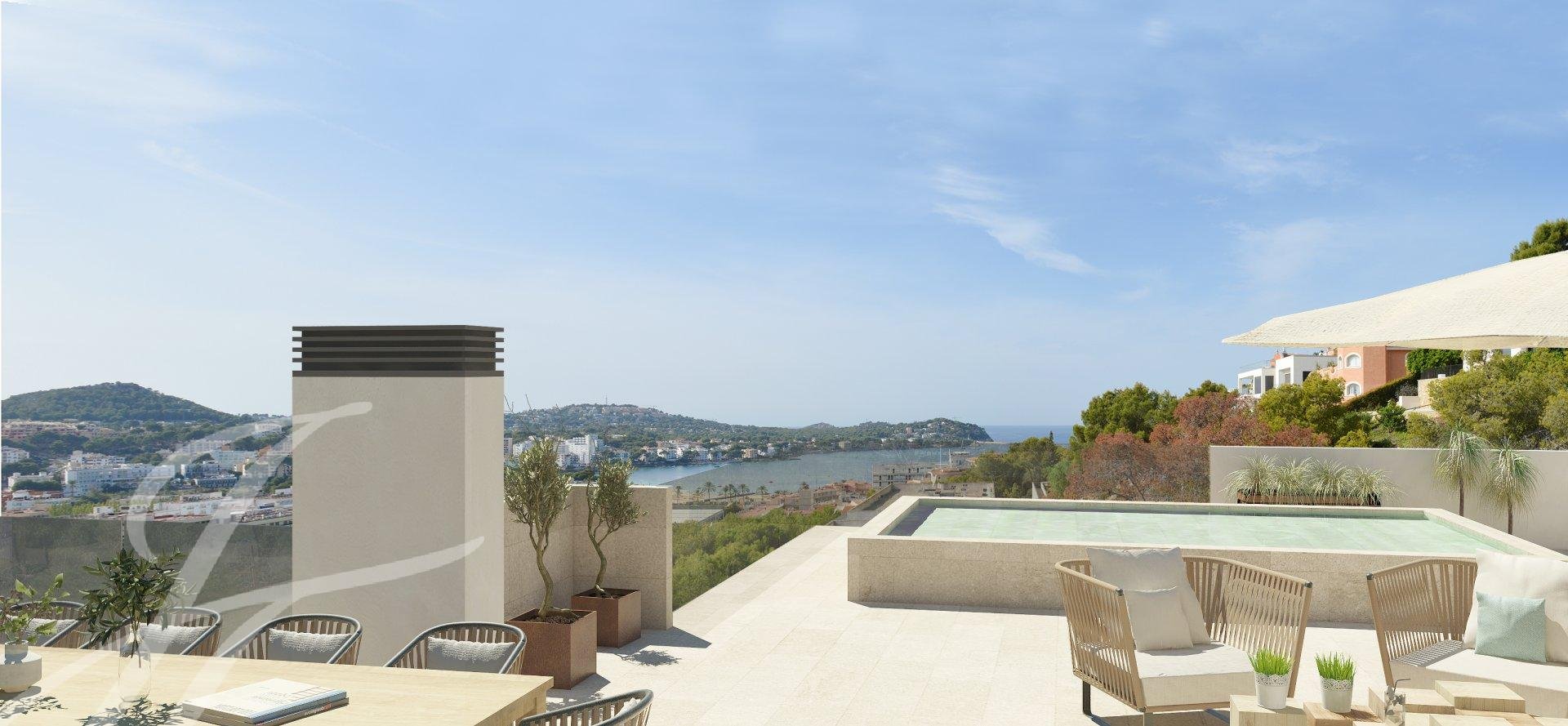 Estos apartamentos modernos se están construyendo en Santa Ponsa. Tienen fantásticas vistas panorámicas de Santa Ponsa y el campo de golf, con orientación este-sur-oeste y hermosas terrazas de 18 m2 para disfrutar plenamente del estilo de vida mediterráneo. Los apartamentos disponen de 4 habitaciones dobles y 3 baños, 2 de ellos en suite, equipados con materiales de alta calidad. Una sala de estar y un comedor con mucha luminosidad, así como una cocina abierta y moderna con electrodomésticos y una isla de cocina combinada con materiales de la más alta calidad le dan comodidad y bienestar. El complejo cuenta con 24 unidades residenciales, una piscina comunitaria y un jardín mediterráneo. Una plaza de aparcamiento subterráneo está incluida en el precio de venta. El proyecto se completará durante el año 2025.