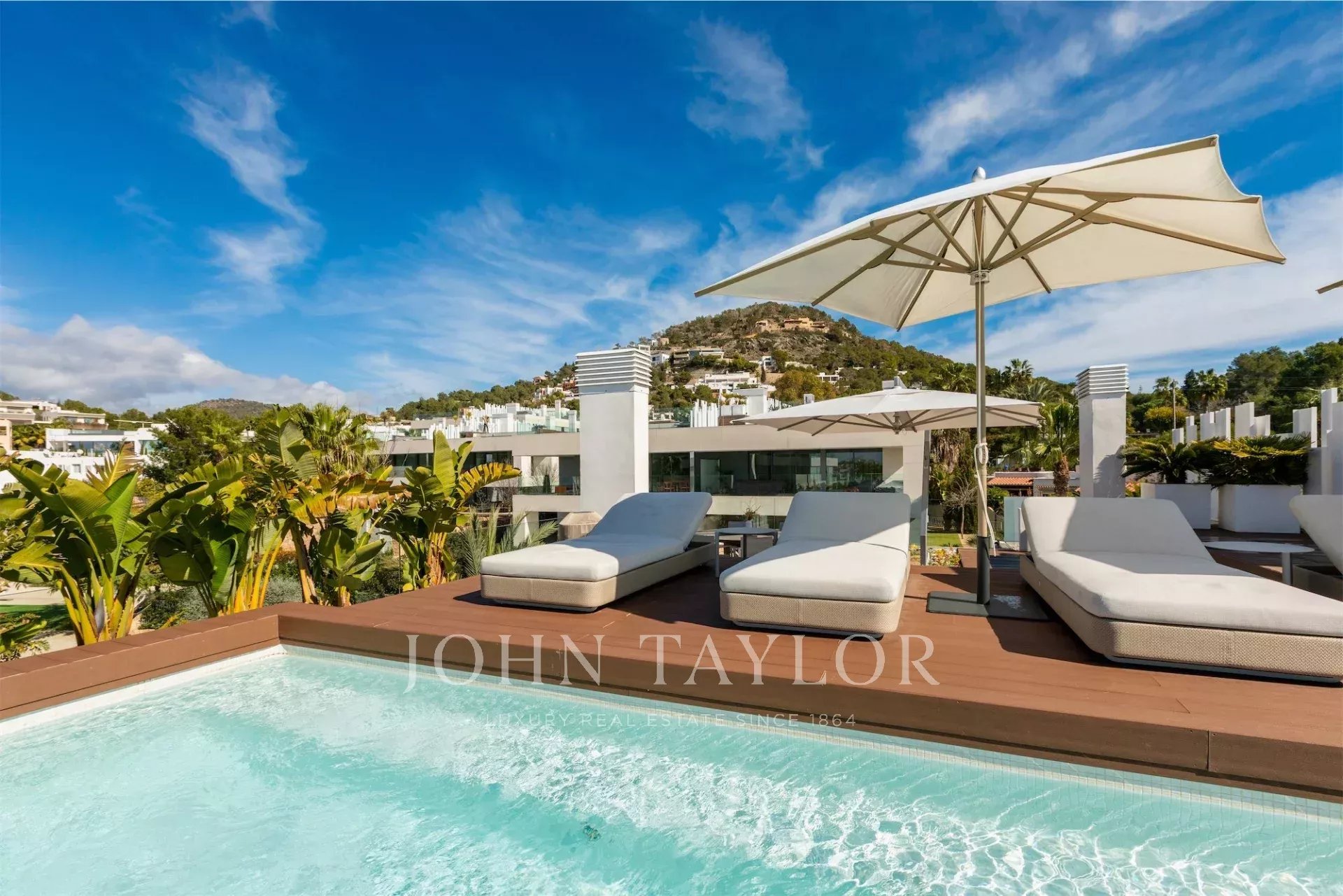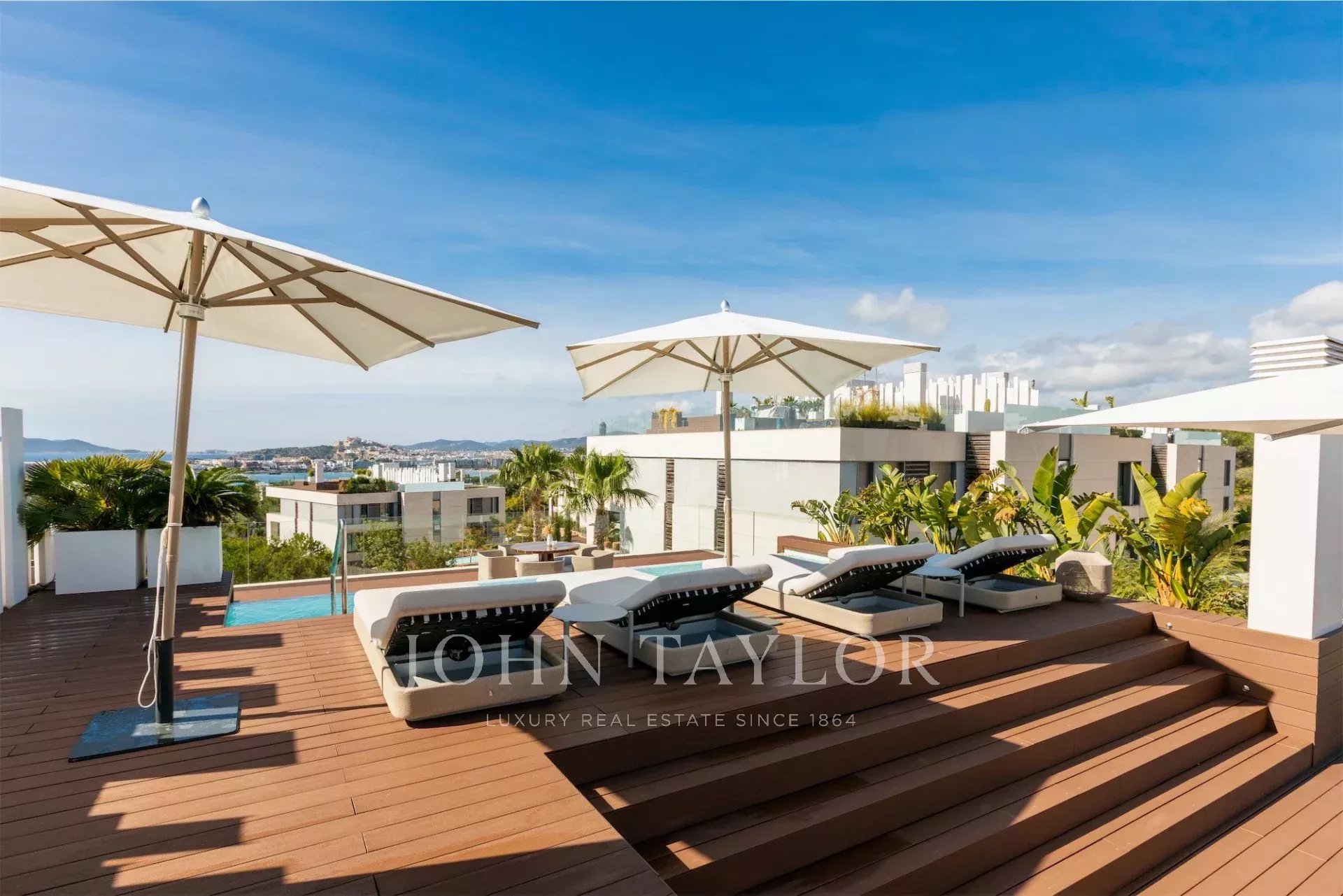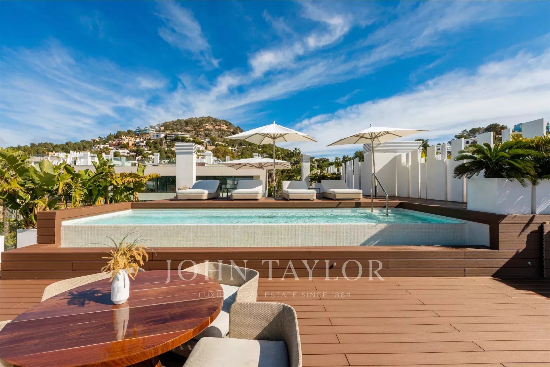 La azotea ofrece un espacio excepcional al aire libre, con una segunda piscina privada, zona de relax y vistas panorámicas. Su orientación suroeste garantiza sol durante todo el día, convirtiéndola en el lugar ideal para disfrutar del clima de Ibiza.