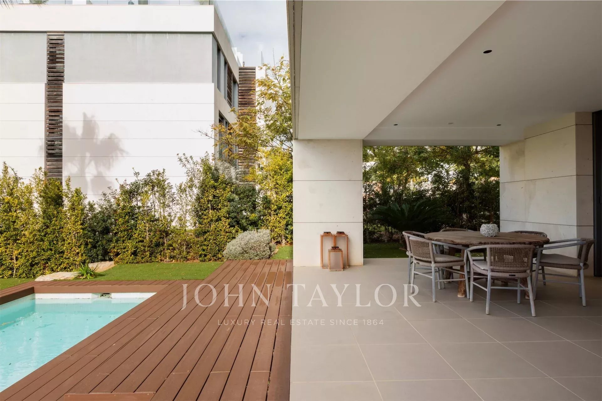 Distribuida en dos niveles más una amplia azotea privada, la vivienda cuenta con dos entradas independientes, ideal para quienes buscan versatilidad y privacidad. En la planta baja encontramos un espacio perfecto para invitados, con tres dormitorios en suite, salón con cocina abierta, aseo de cortesía y acceso directo a un jardín privado con terraza cubierta y piscina. Esta planta puede funcionar como un apartamento totalmente independiente.