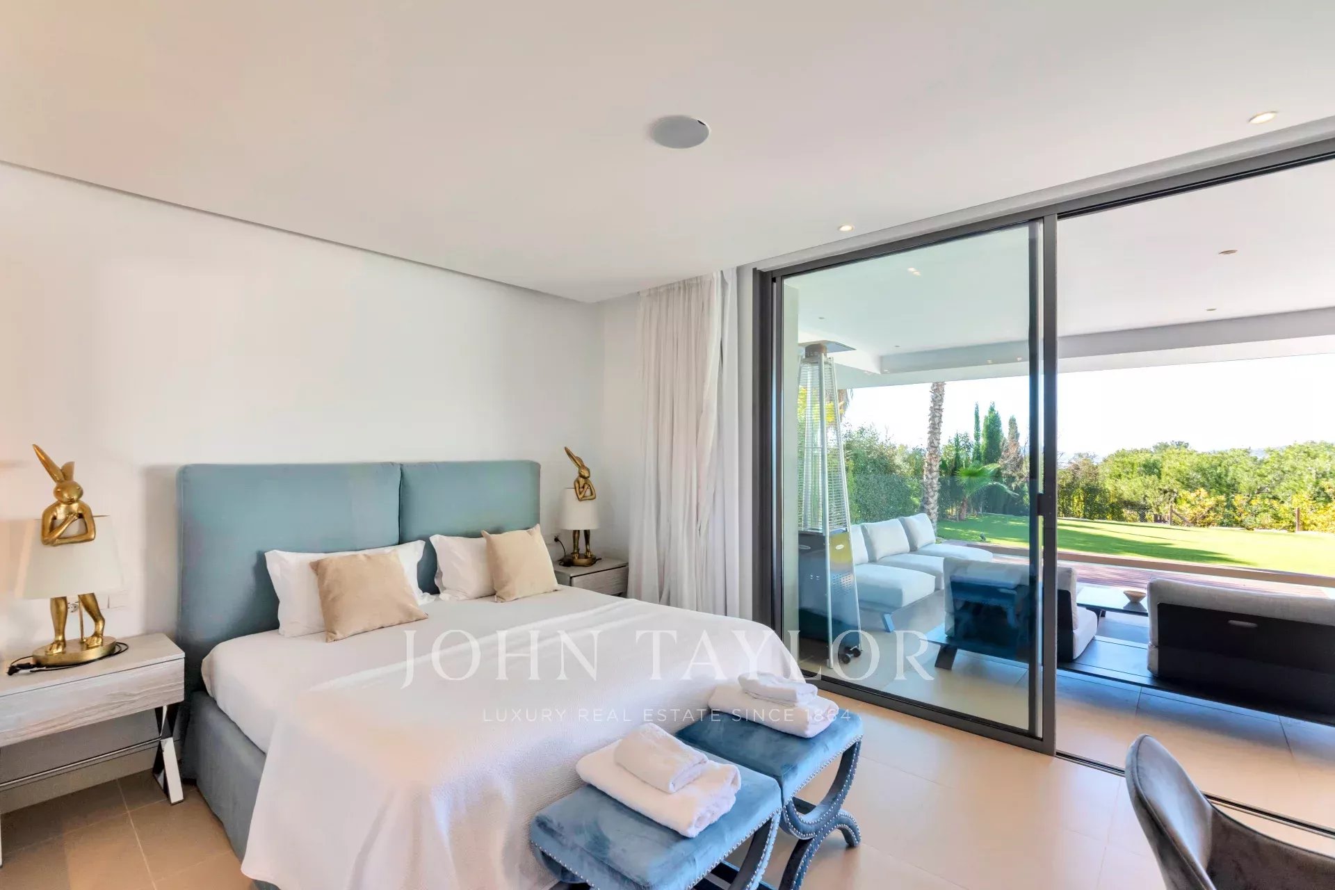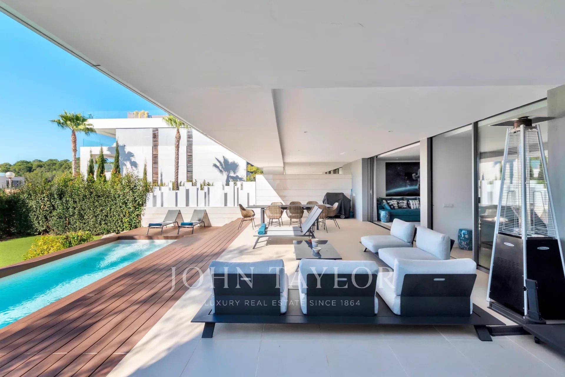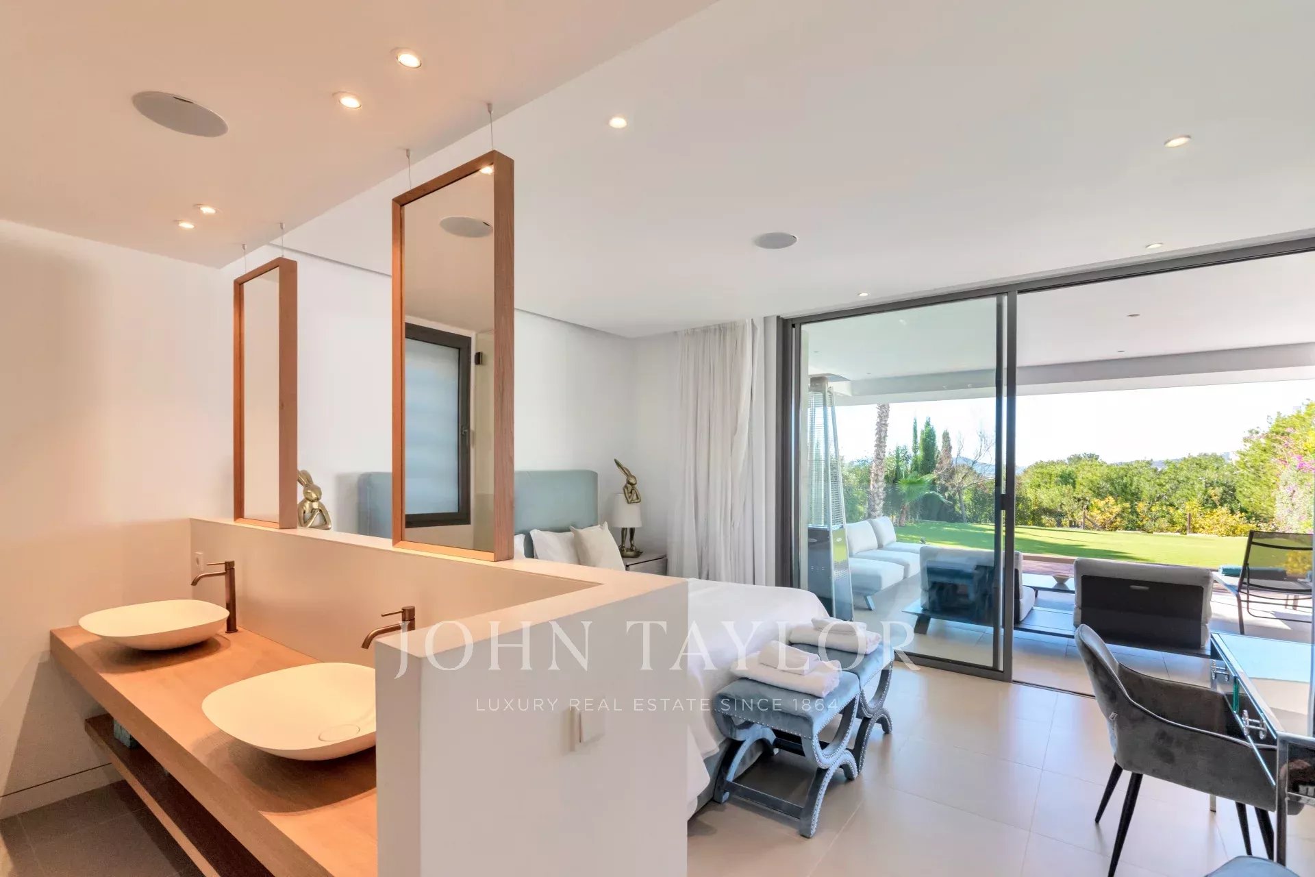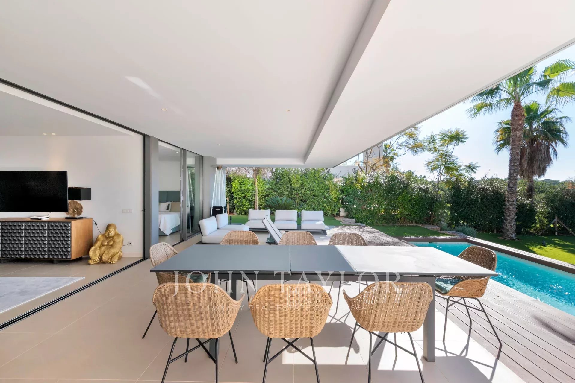 Al entrar nos recibe por una amplia sala de estar iluminada que se abre a una gran terraza y jardín con una piscina privada. Las vistas ininterrumpidas de la bahía, enmarcadas por una exuberante vegetación, crean un sereno y natural telón de fondo.
