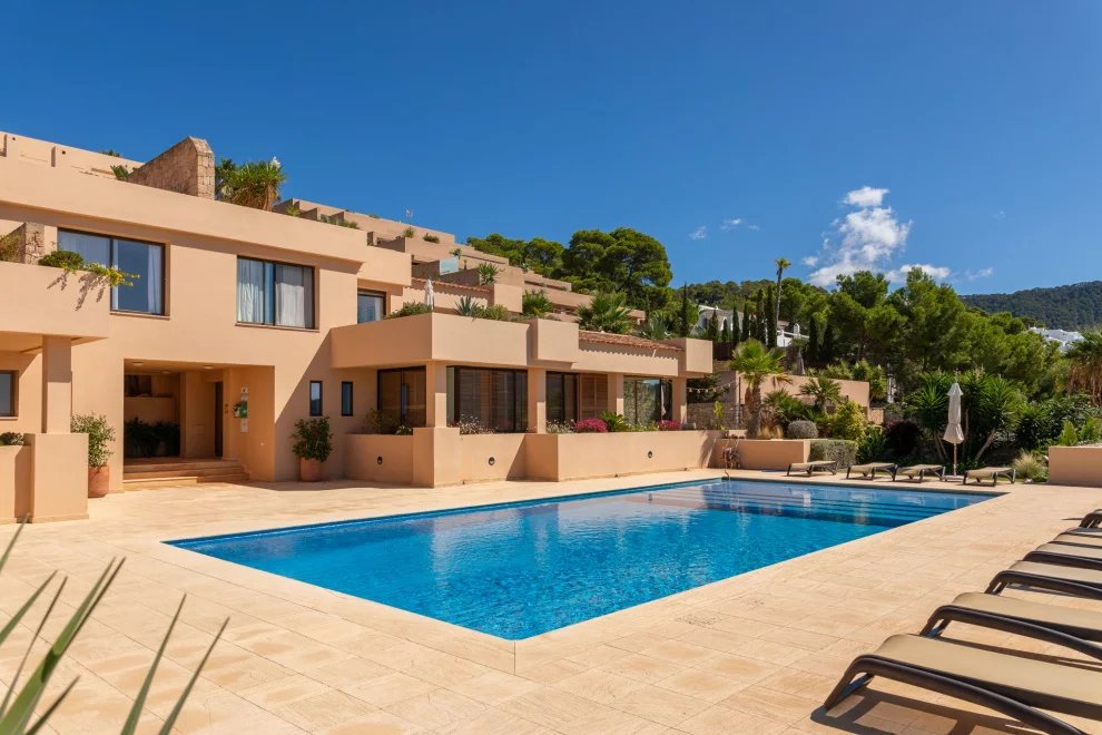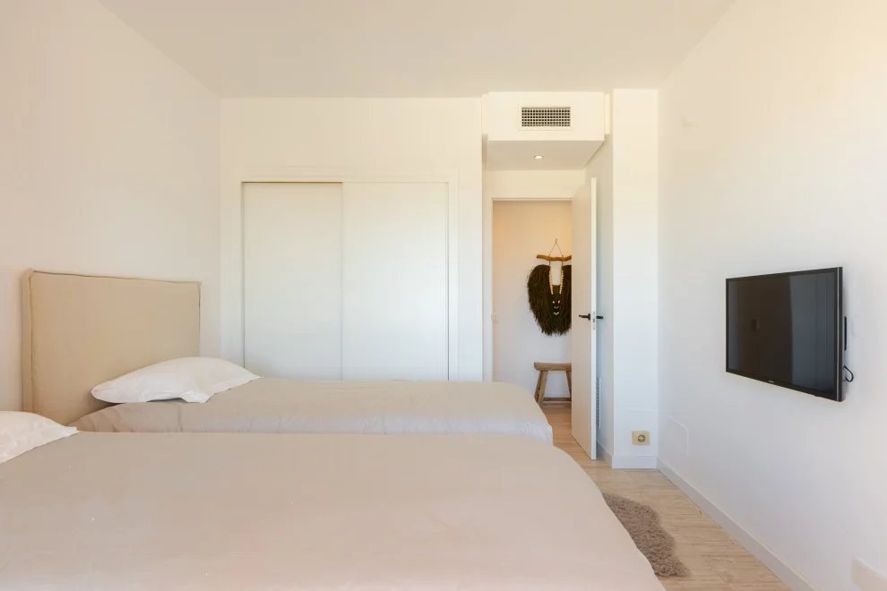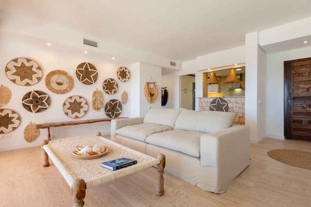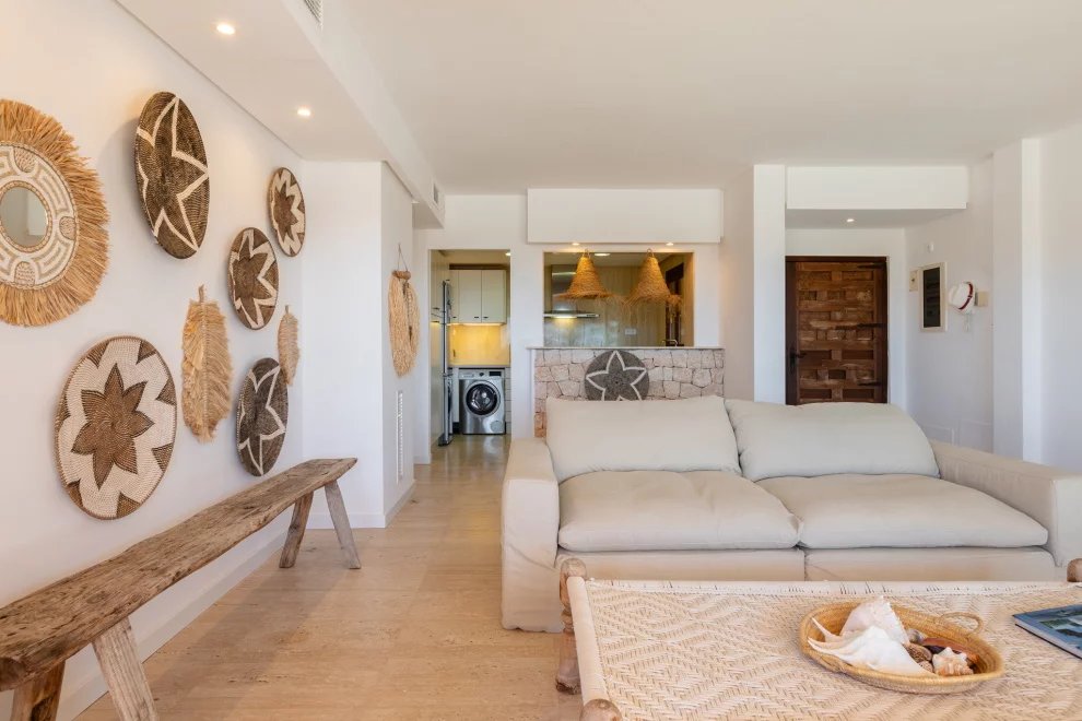 Encantador apartamento de dos dormitorios situado en una de las zonas más tranquilas y naturales del suroeste de Ibiza: Cala Carbó. Con una ubicación privilegiada en planta baja, destaca por su gran terraza de aproximadamente 150 m², parcialmente cubierta y orientada hacia las impresionantes vistas de Es Vedrà, uno de los paisajes más icónicos de la isla.