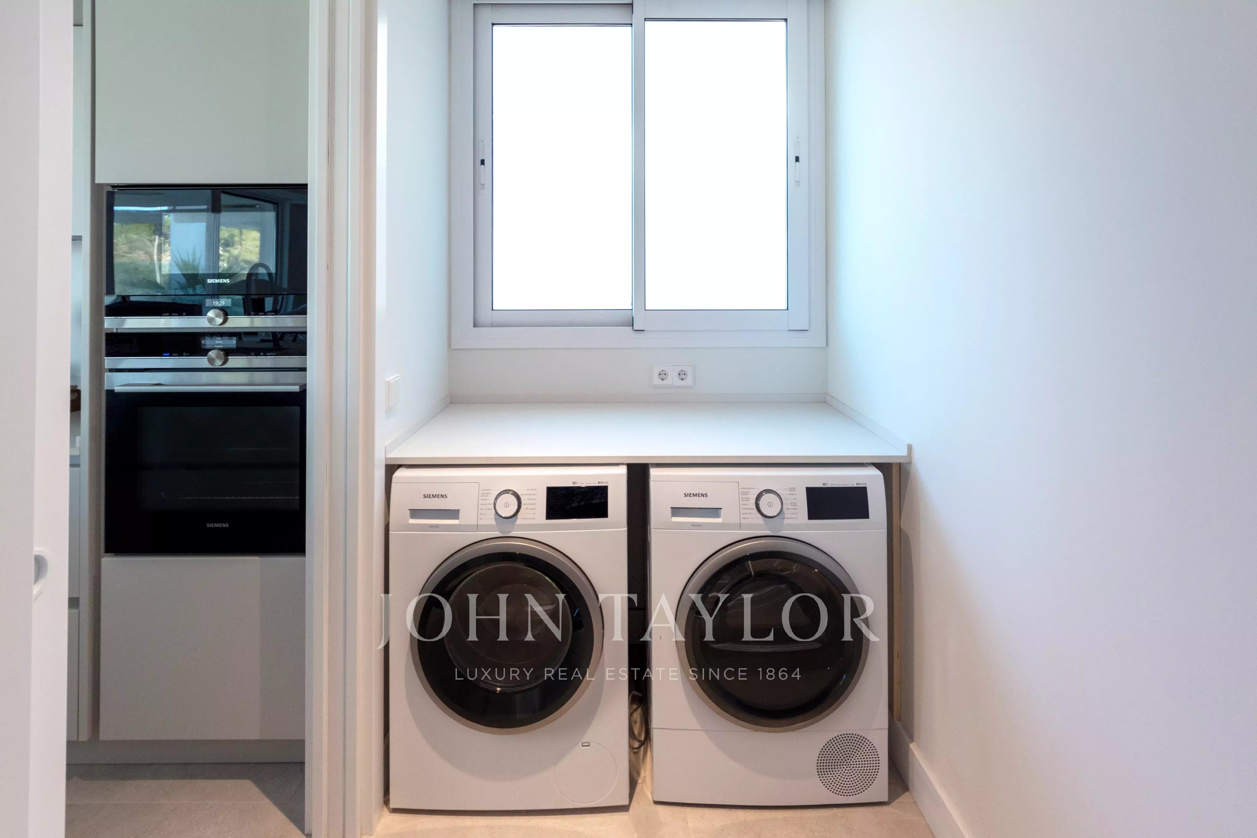 El ático cuenta con un amplio y luminoso salón-comedor, ideal para recibir a amigos y familiares. La moderna cocina abierta está equipada con electrodomésticos de alta gama, y un pequeño lavadero junto a la cocina añade comodidad al día a día.