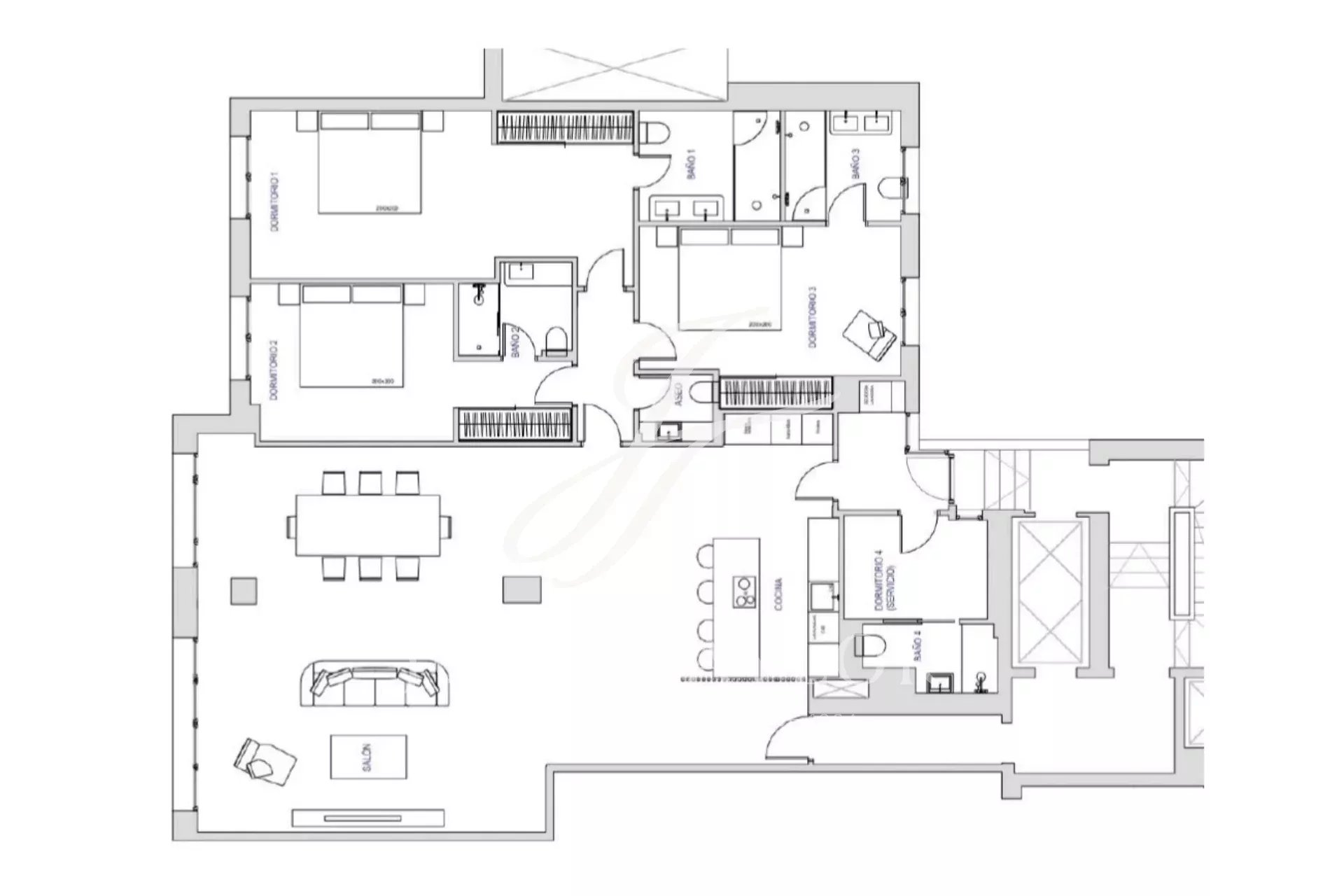 La zona de noche consta de cuatro dormitorios y cuatro cuartos de baño, todos en suite. Uno de los dormitorios es individual y es perfecto para usarlo como dormitorios de servicio..