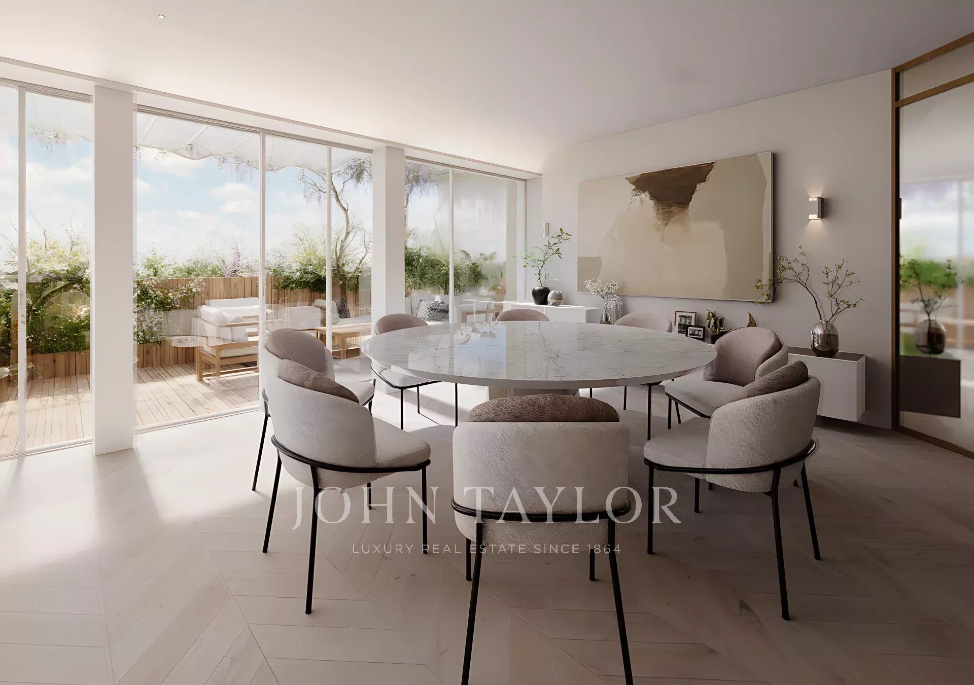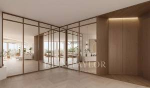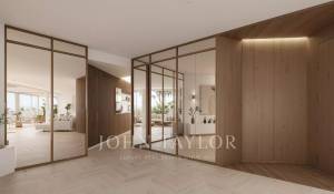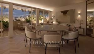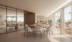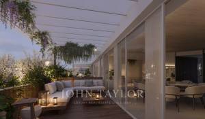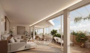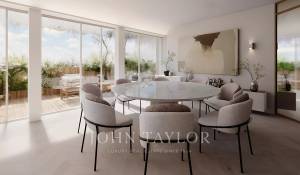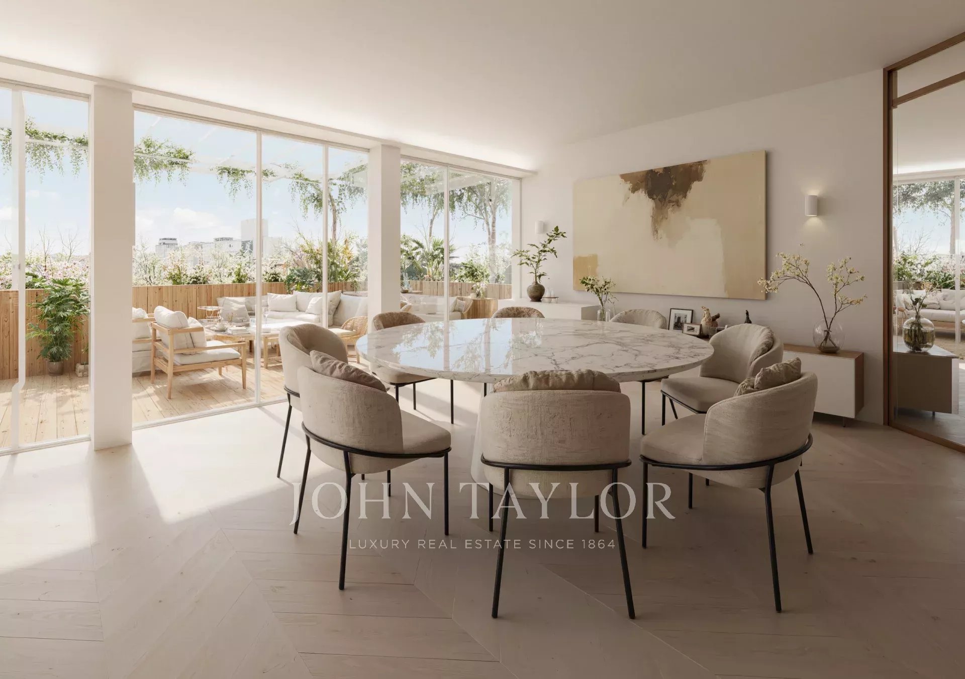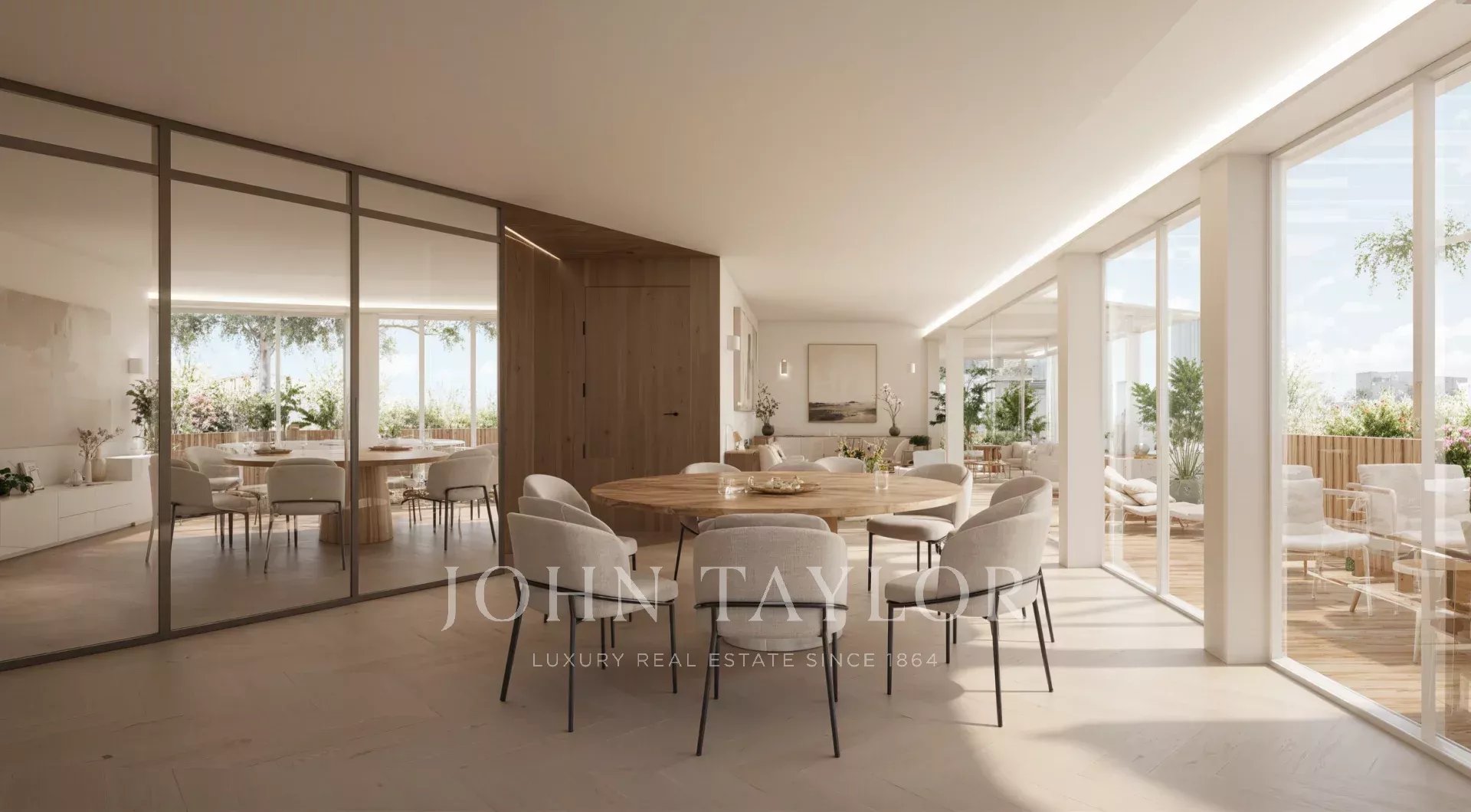 La vivienda ocupa toda la octava planta del edificio y presenta una distribución perfectamente ordenada alrededor del gran patio central en dos zonas diferenciadas: una zona social y otra zona privada. Nada más entrar nos encontramos con el gran salón comedor, inundado de luz y orientado al Oeste. La terraza, de casi 20 m², se integra en el salón mediante puertas de cristal deslizante de suelo a techo que permiten disfrutar de las bonitas vistas despejadas. Un coqueto aseo para invitados completa la zona social.